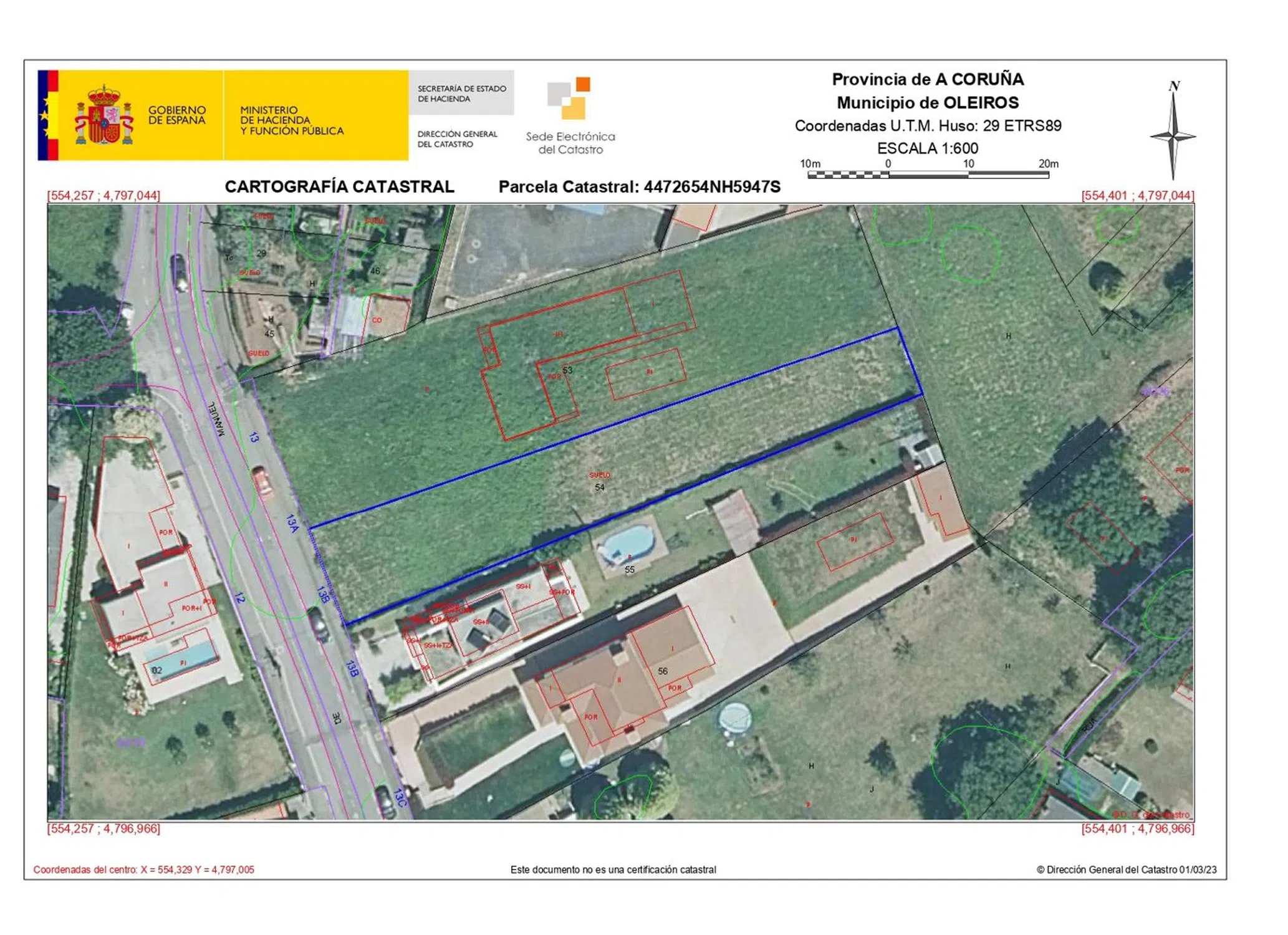 Solar edificable en Rúa Manuel Murguía, 13(A) con referencia catastral 4472654NH5947S0001UP y referencia registral 45459 de Oleiros del Registro de la Propiedad de A Coruña nº 3, con la siguiente clasificación: "A parcela sinalada está clasificada pólo Plan xeral vixente como solo urbano consolidado no ámbito da ordenanza 2 de Cidade Xardín, variante “B” de extensión de vivenda familiar".