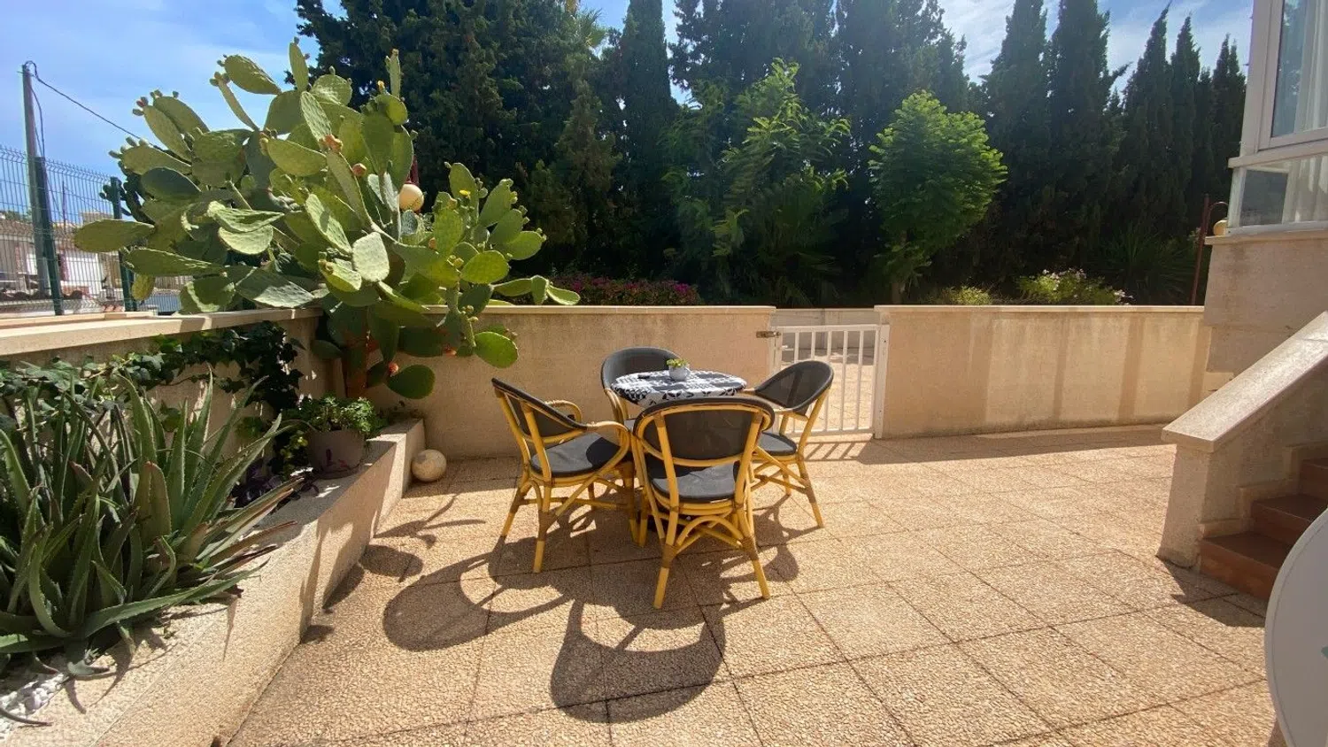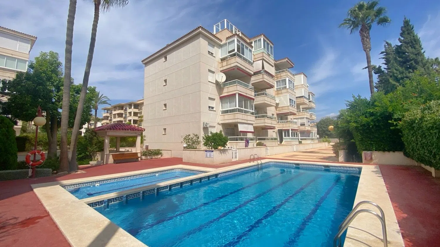 Die Wohnanlage bietet eine wunderschöne Poollandschaft und gepflegte Gärten, die perfekt für entspannte Stunden im Freien sind. Der hellen und einladenden Wohnbereich ist mit einer verglasten Terrasse verbunden, die einen direkten Zugang zur großzügigen Außenfläche und zum Schwimmbad bietet.