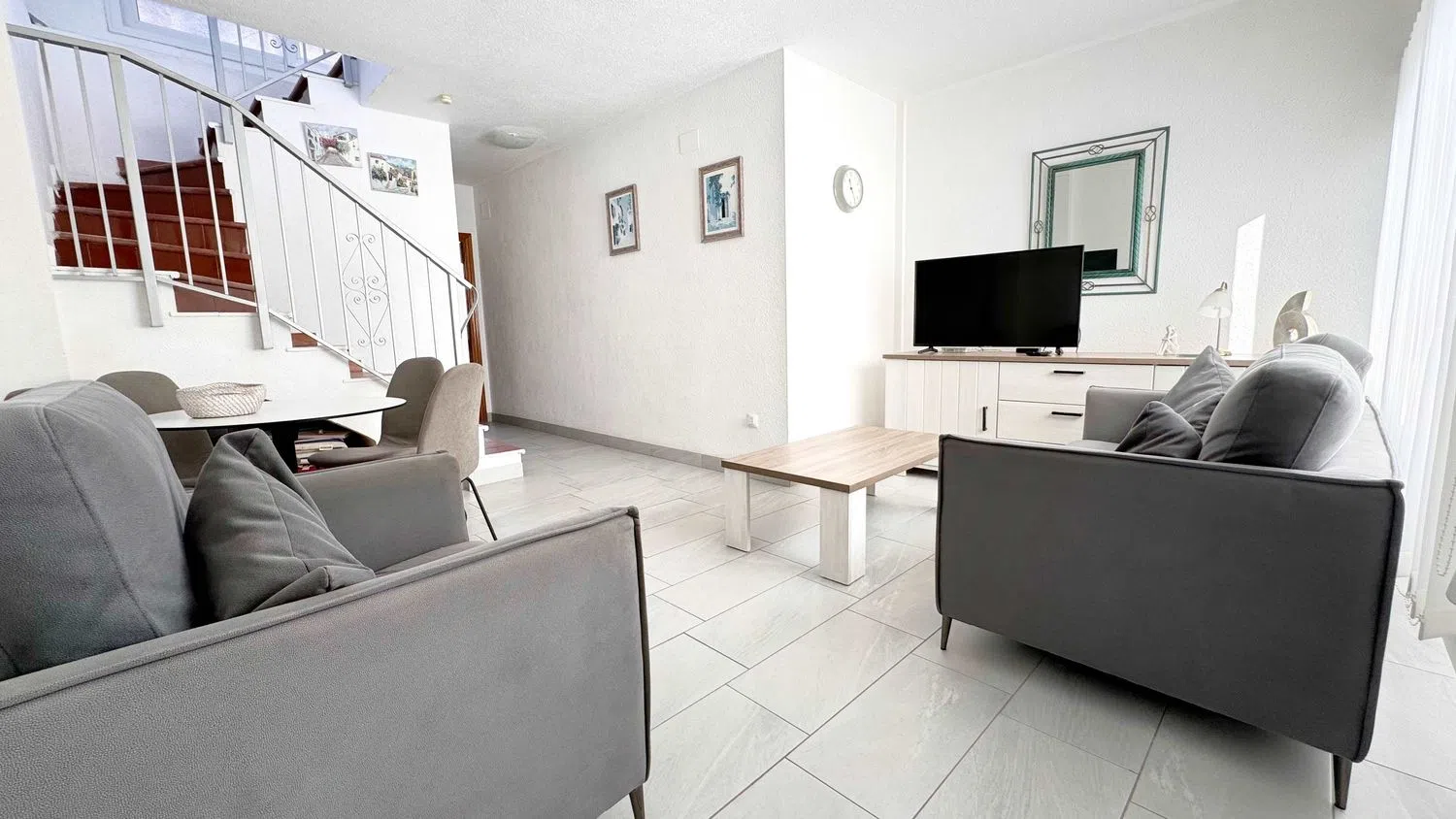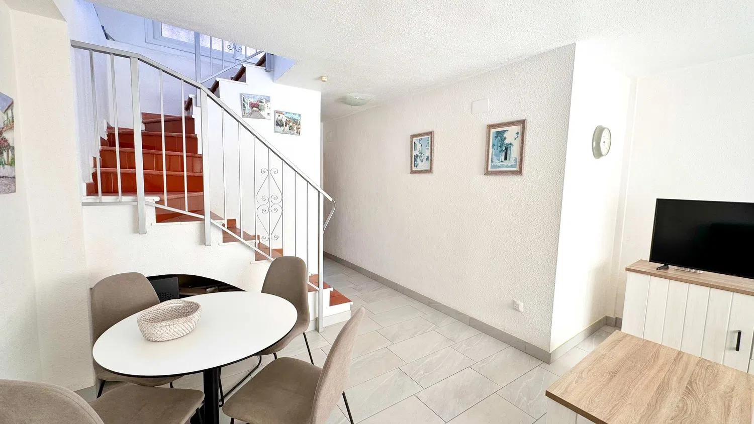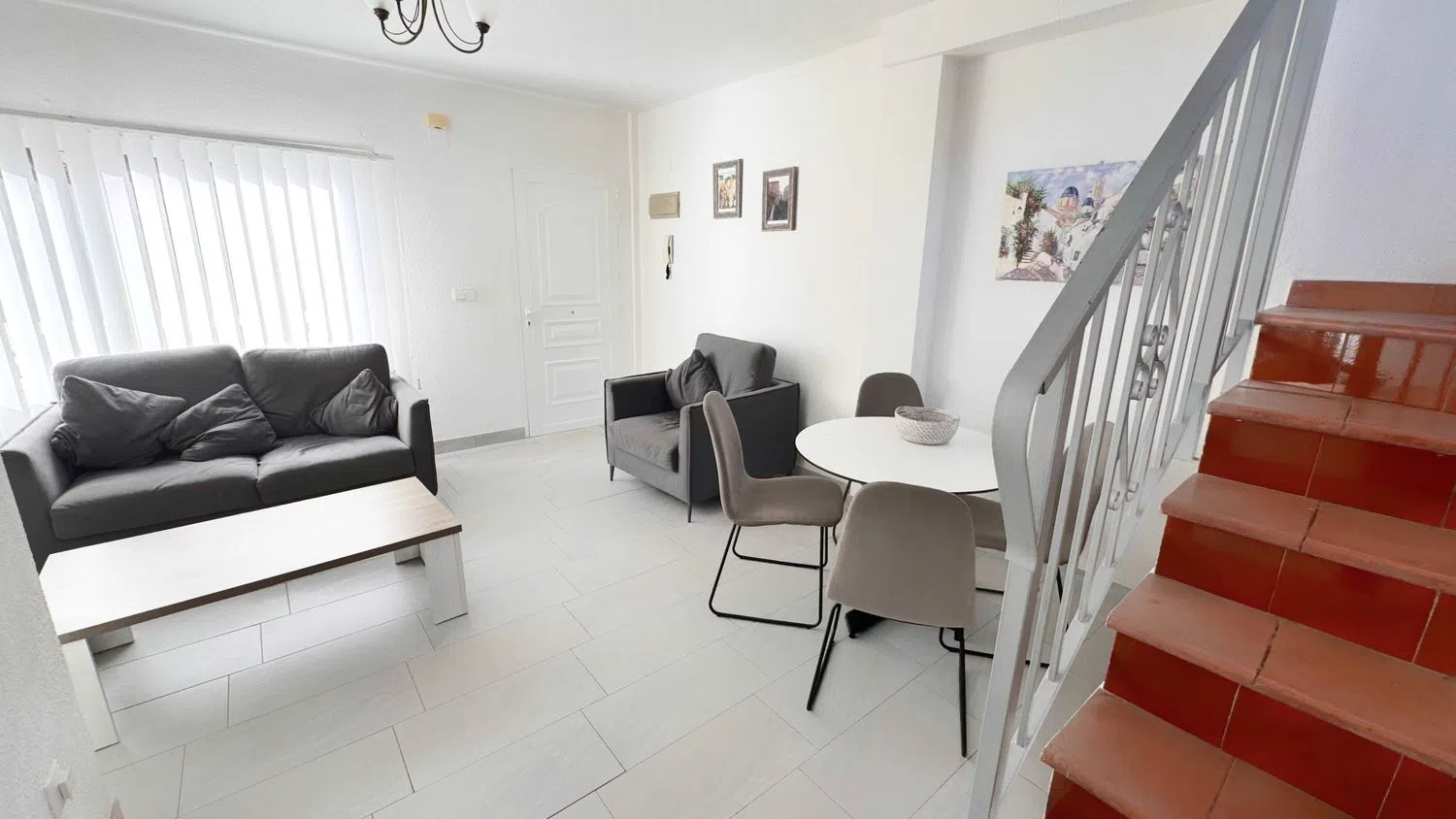 Hier präsentieren wir Ihnen ein hochwertig renoviertes Duplex-Apartment mit zwei Schlafzimmern, das über eine Treppe zur Haupttür zugänglich ist. Direkt vor Ihnen erwartet Sie ein privater Balkon, der morgens von der Sonne verwöhnt wird und perfekt ist, um Ihr Frühstück zu genießen.