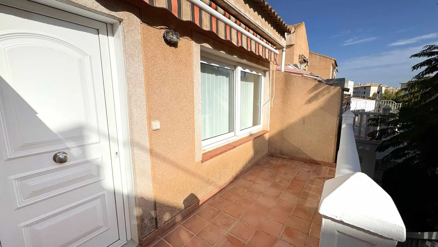 Beim Betreten der unteren Etage gelangen Sie in den geräumigen Wohnbereich, der eine komplett ausgestattete, abgeschlossene Küche sowie ein Schlafzimmer mit praktischen Einbauschränken bietet. Im oberen Stockwerk befindet sich das Hauptschlafzimmer, das mit einem modernen Badezimmer mit Dusche ausgestattet ist, sowie ein weiterer Balkon, der nach Westen ausgerichtet ist und Ihnen die Möglichkeit bietet, die Abendsonne zu genießen.