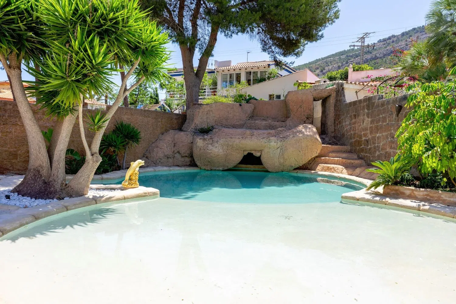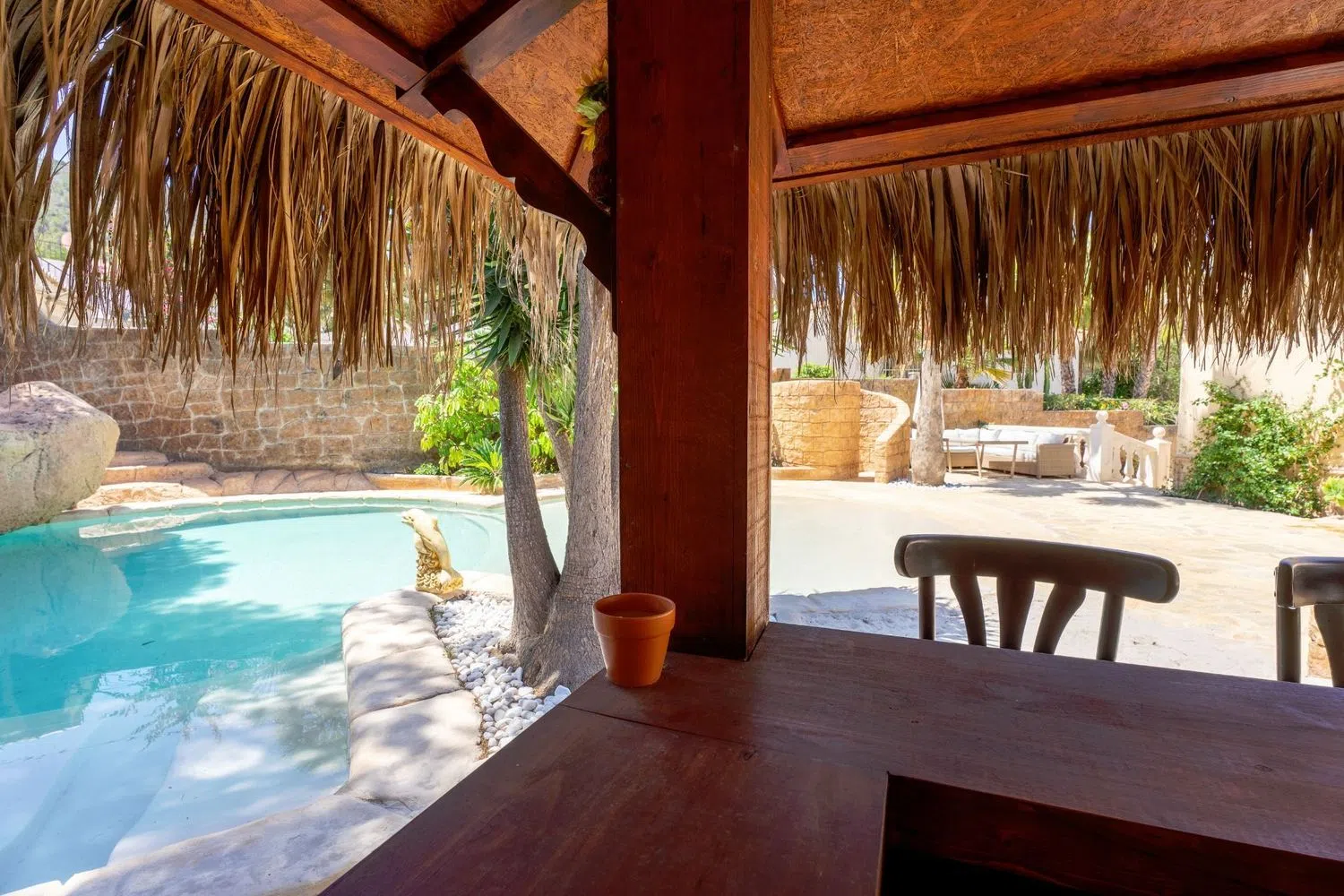 Entdecken Sie eine bezaubernde Villa in einer äußerst ruhigen Gegend, die durch eine beeindruckende Lagunenpool-Anlage mit Wasserfall und hochwertigen Liegen besticht. Direkt neben dem Pool befindet sich eine Bartheke sowie ein kleiner Strandbereich, der das Gefühl eines exotischen Resorts vermittelt.