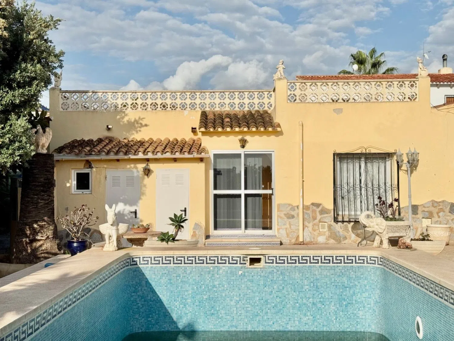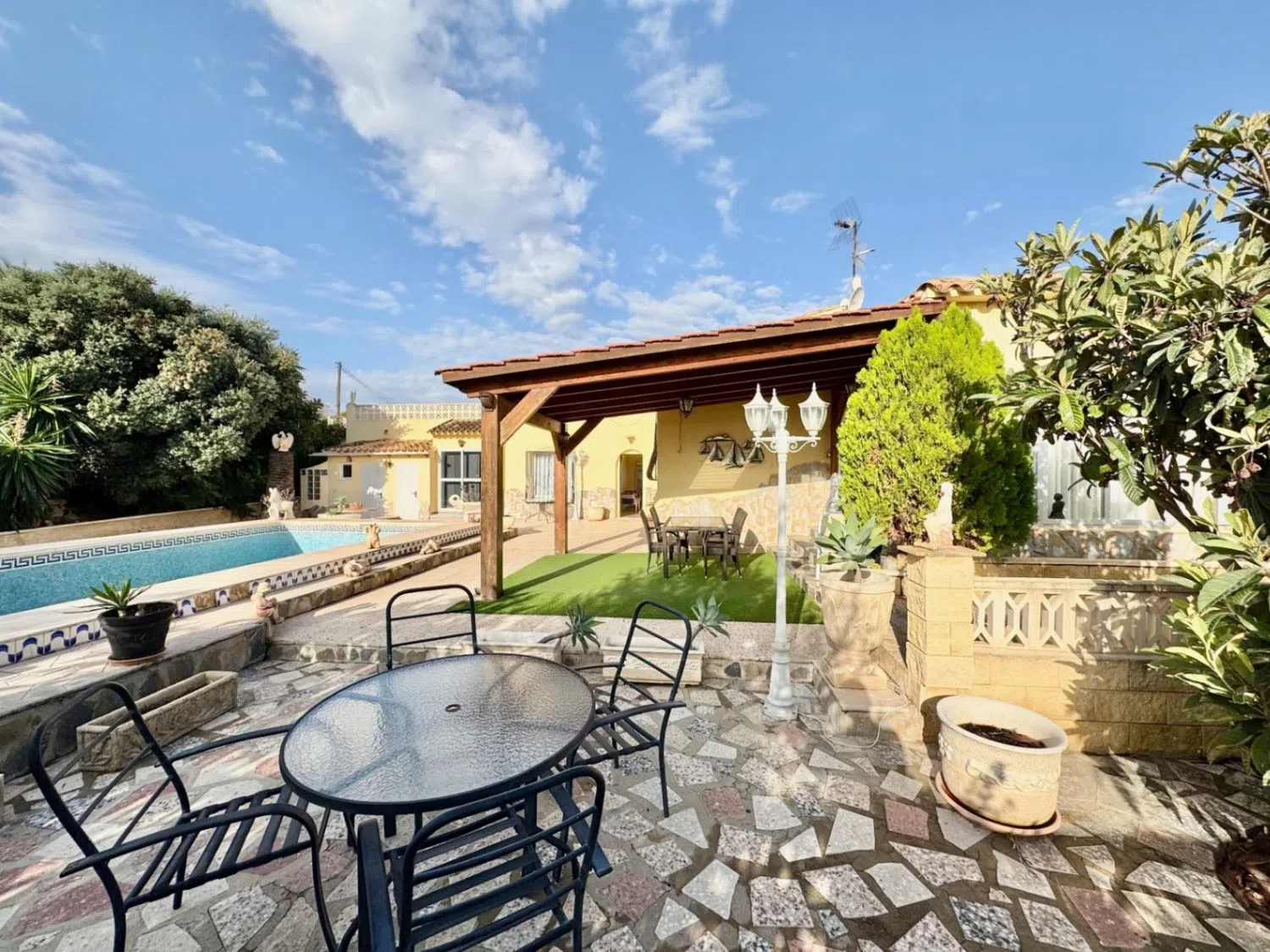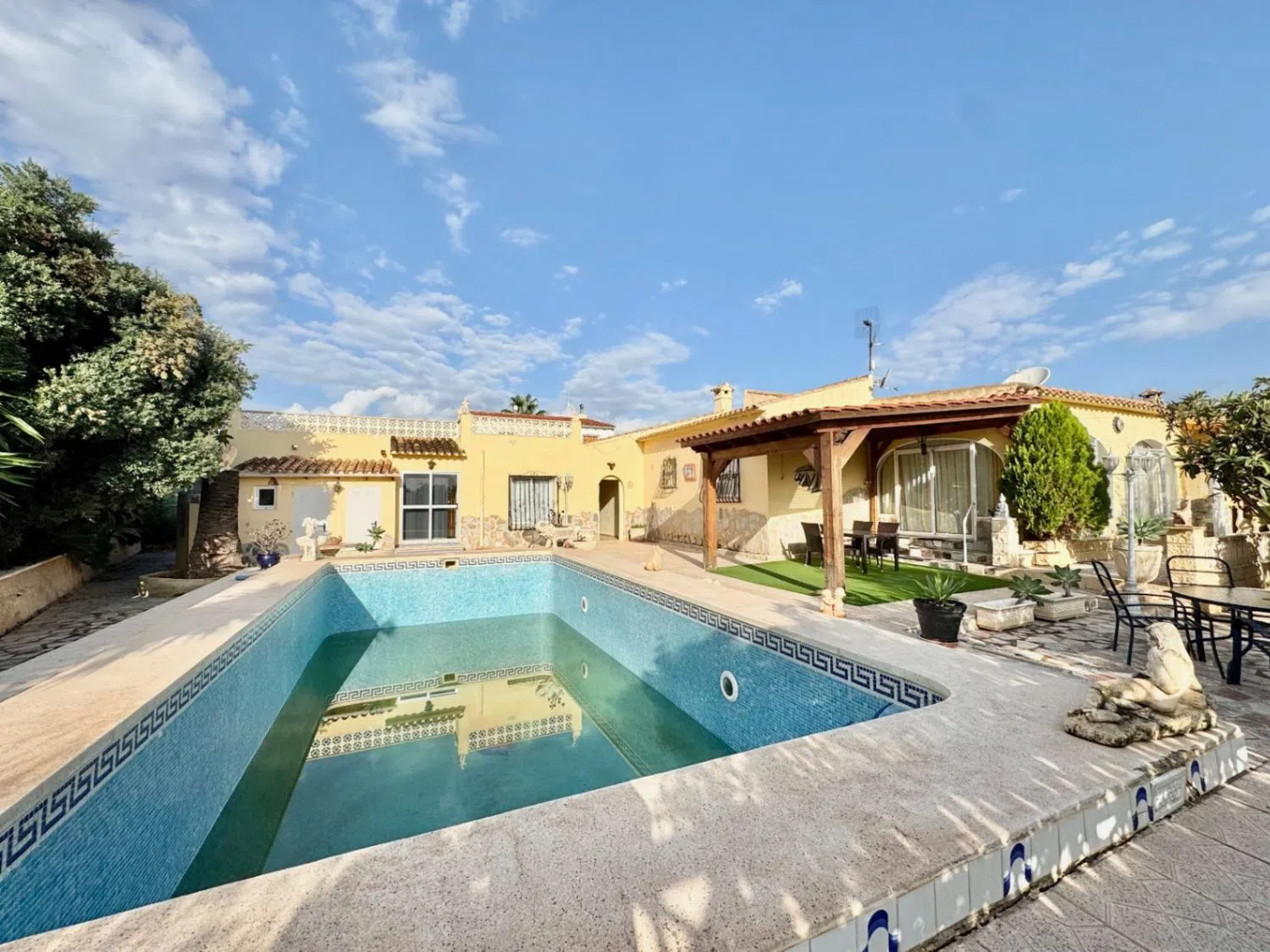 Das Grundstück umfasst ca. 923 m² und bietet ausreichend Platz für Privatsphäre und Erholung. Zu den Annehmlichkeiten gehören eine überdachte Terrasse mit Sommerküche, ein Stellplatz sowie ein Carport. Die Poollandschaft liegt im Südosten der Immobilie und lädt zu entspannten Stunden im Freien ein. Insgesamt bietet diese Villa ein hohes Maß an Privatsphäre und viel Potenzial für individuelle Gestaltung.