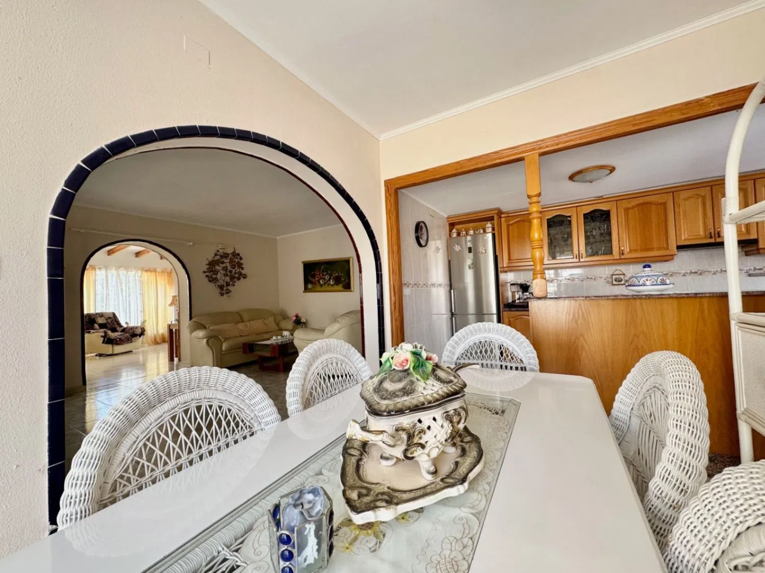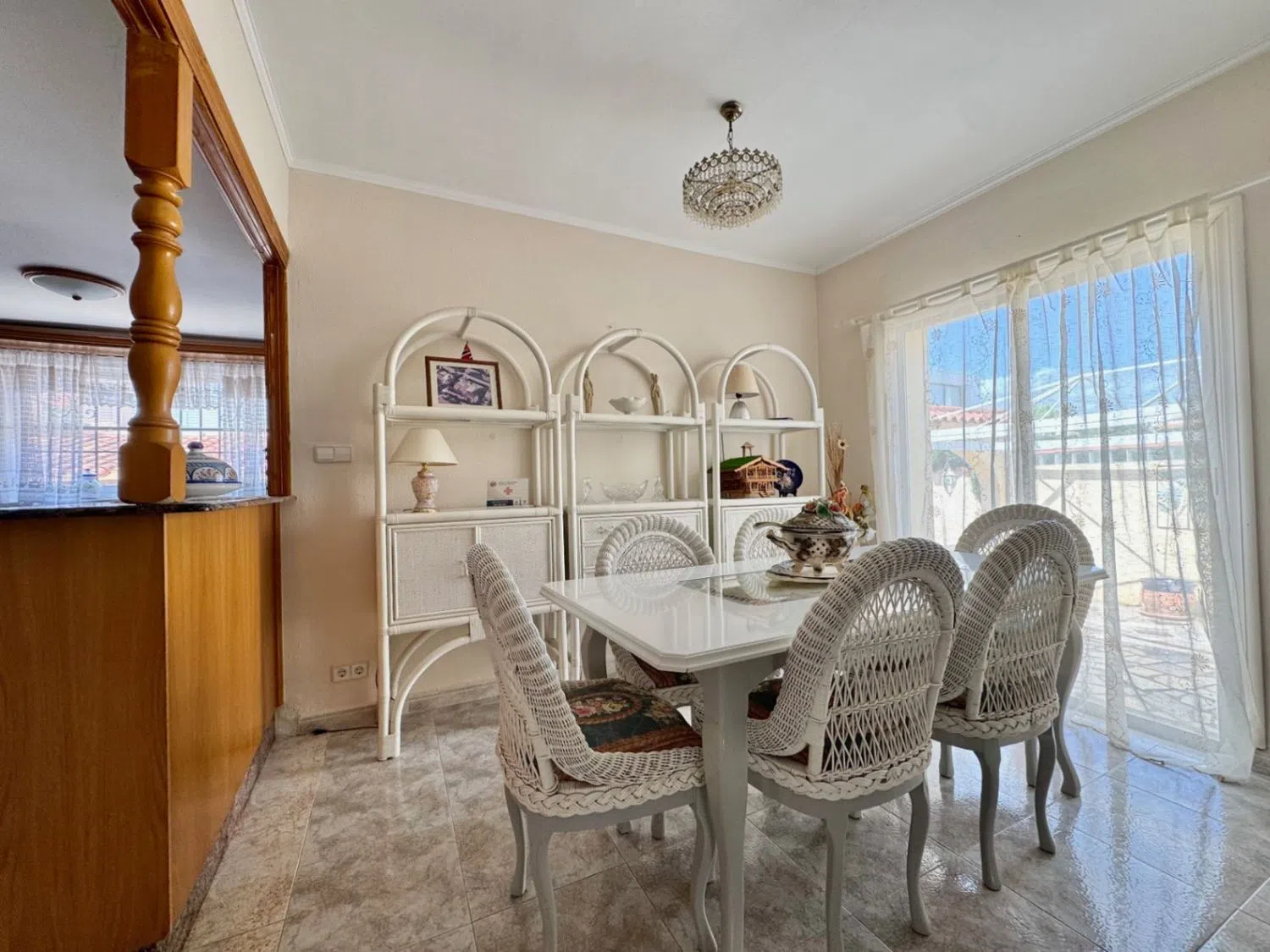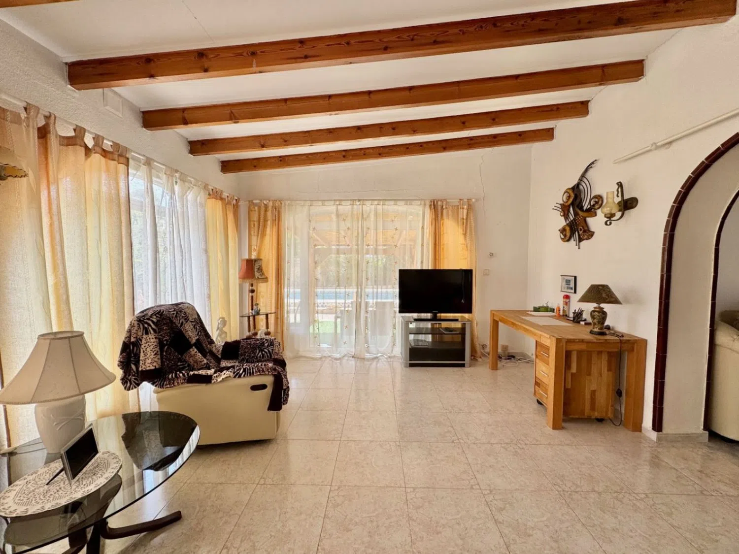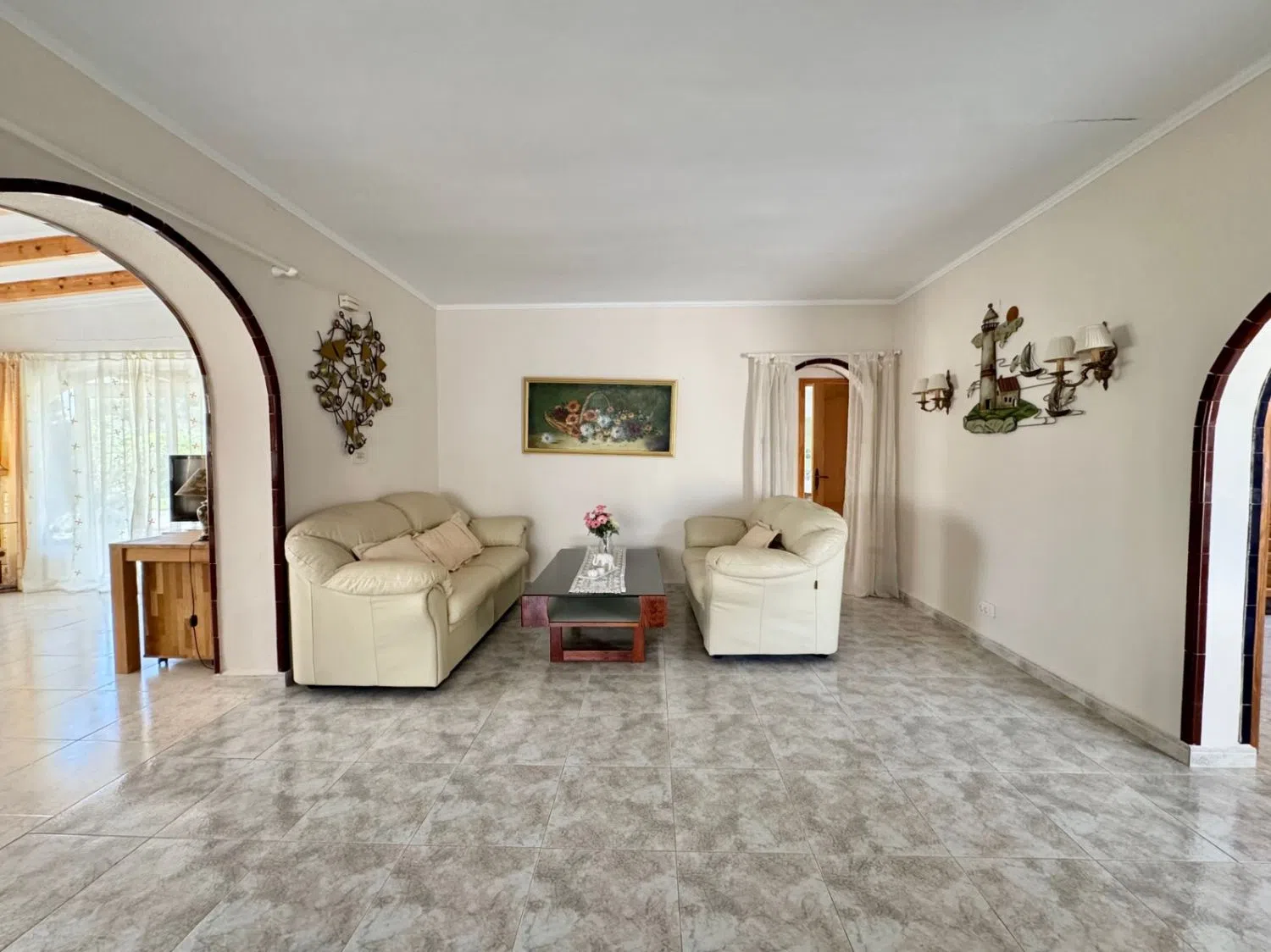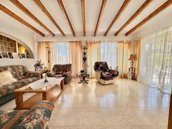 Die Villa erstreckt sich über 185 m² und verfügt über zwei Schlafzimmer, zwei Bäder sowie eine offene Küche, die nahtlos in das Wohn- und Esszimmer übergeht. Ein großzügiger Wohnbereich und eine verglaste Terrasse ermöglichen den Zugang zum Garten, der mit einer einladenden Poolanlage ausgestattet ist. Darüber hinaus gibt es ein separates Gästeapartment mit eigener Küche, Essbereich, Wohnzimmer, einem Schlafzimmer und einem Badezimmer, was ideale Voraussetzungen für Besuche oder Vermietung bietet.