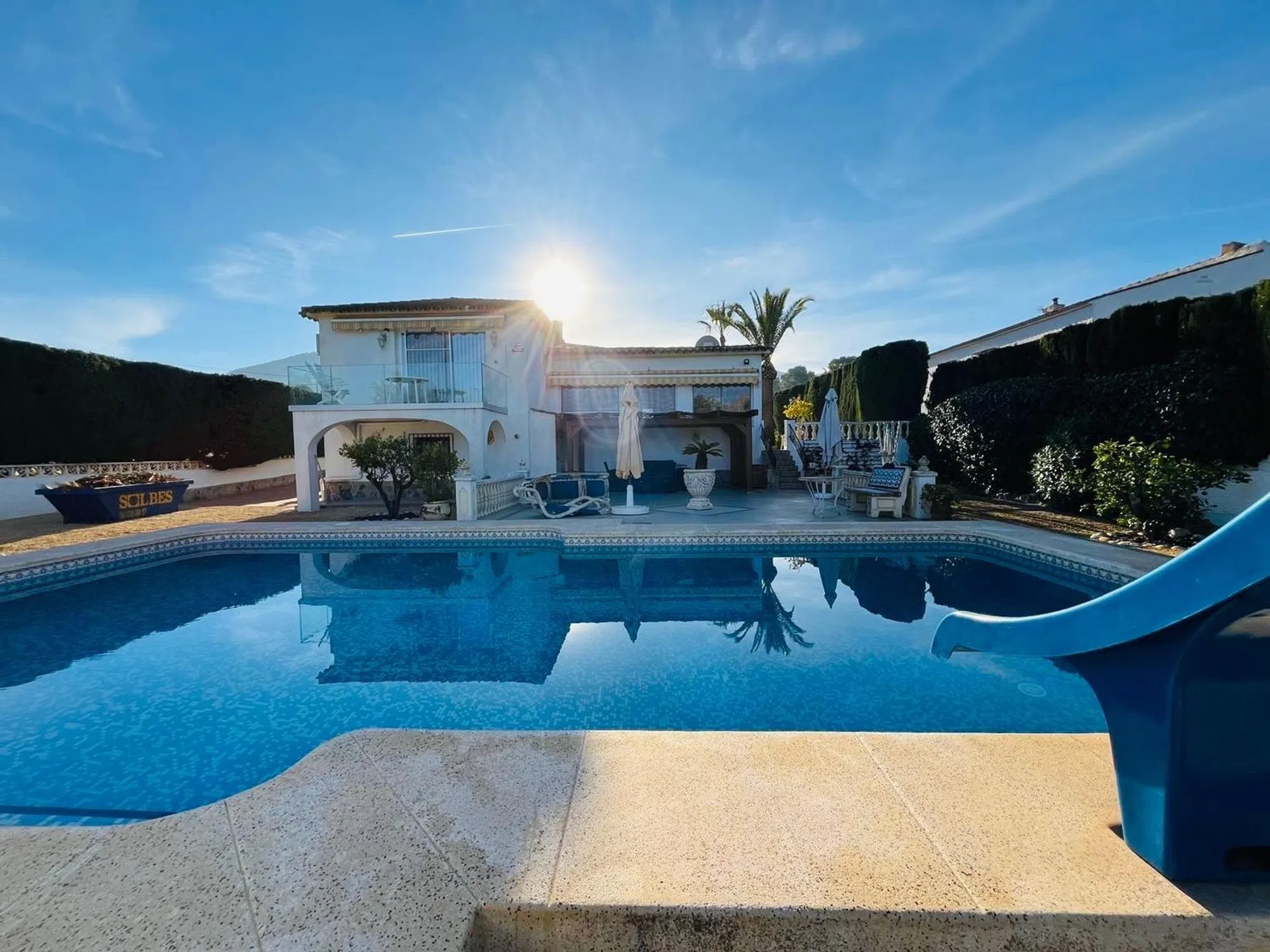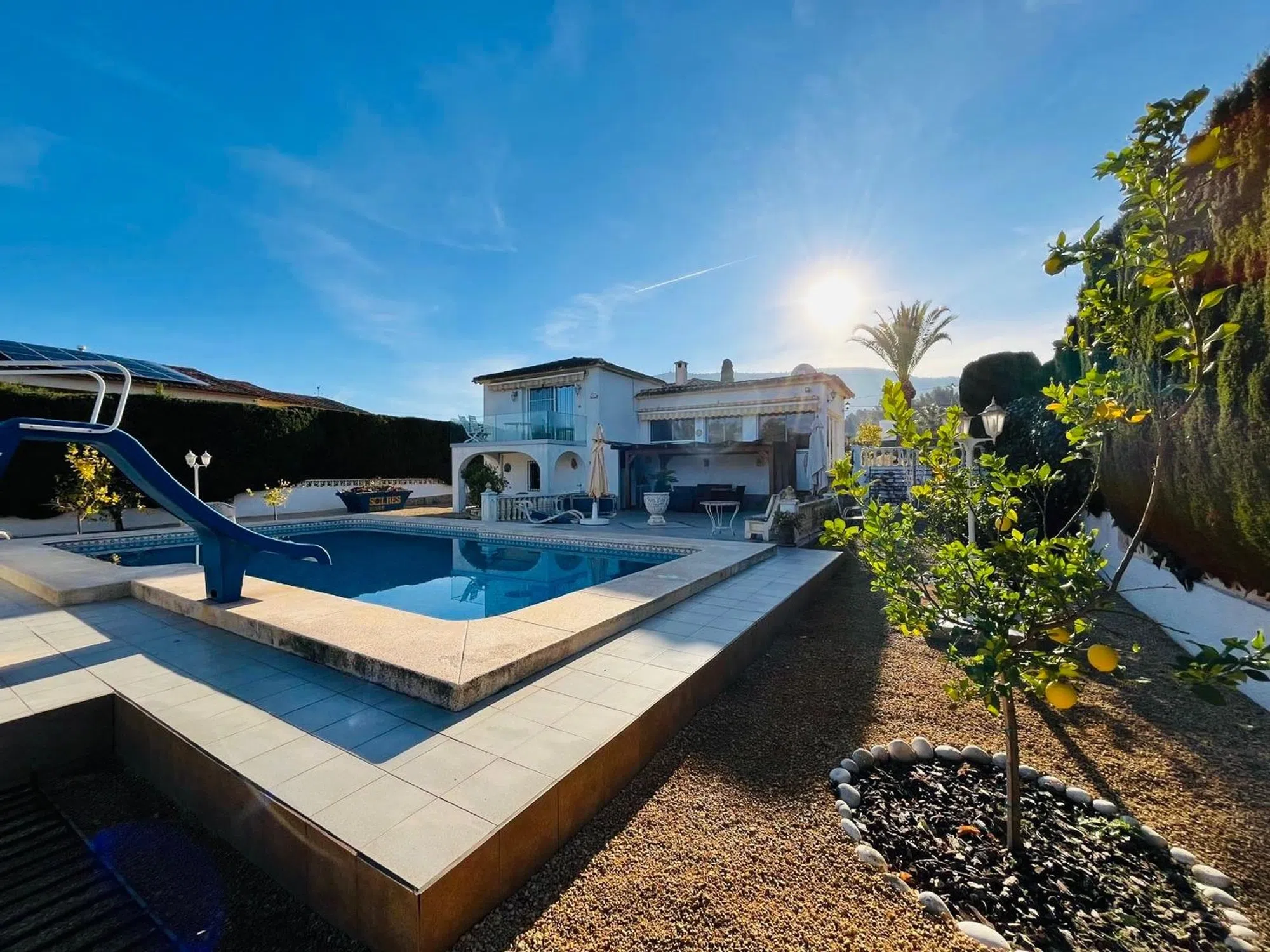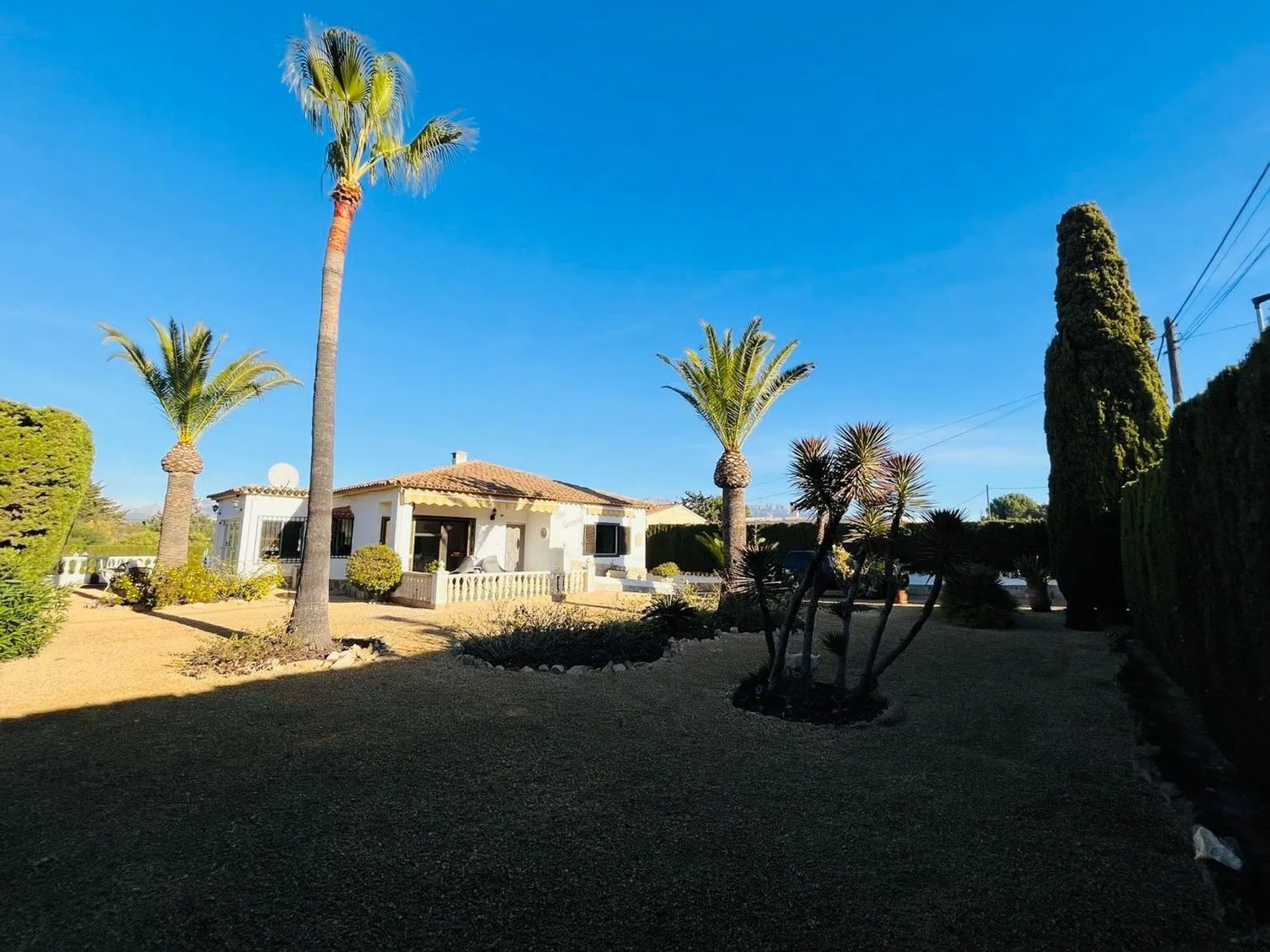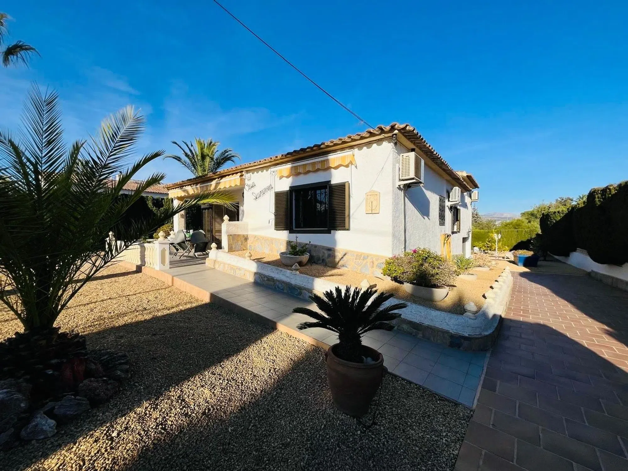 Elegante villa de 200m2 en una sola planta con una gran parcela de 1140m2 con hermosas palmeras en una zona muy tranquila a un paso del centro del Albir. Esta villa, lista para entrar a vivir, cuenta con una espaciosa piscina, ducha exterior, 3 dormitorios y 2 baños, terrazas cubiertas y descubiertas, garaje. aire acondicionado en todas las habitaciones, una moderna cocina también con acceso directo a la terraza cubierta y al jardín.
