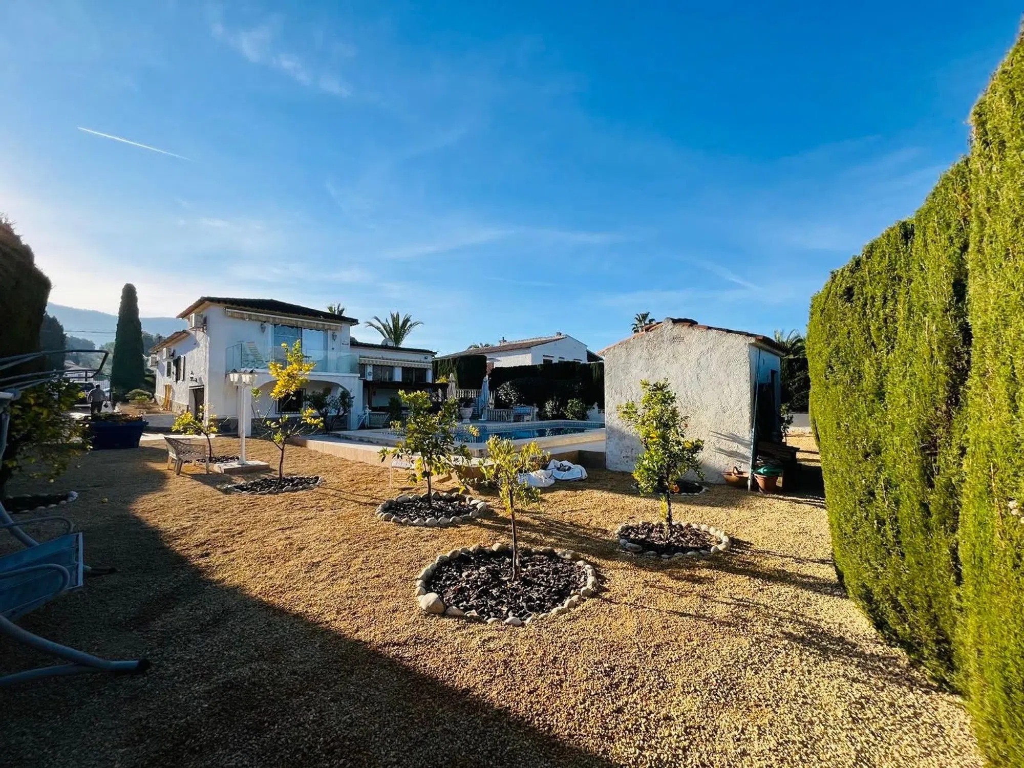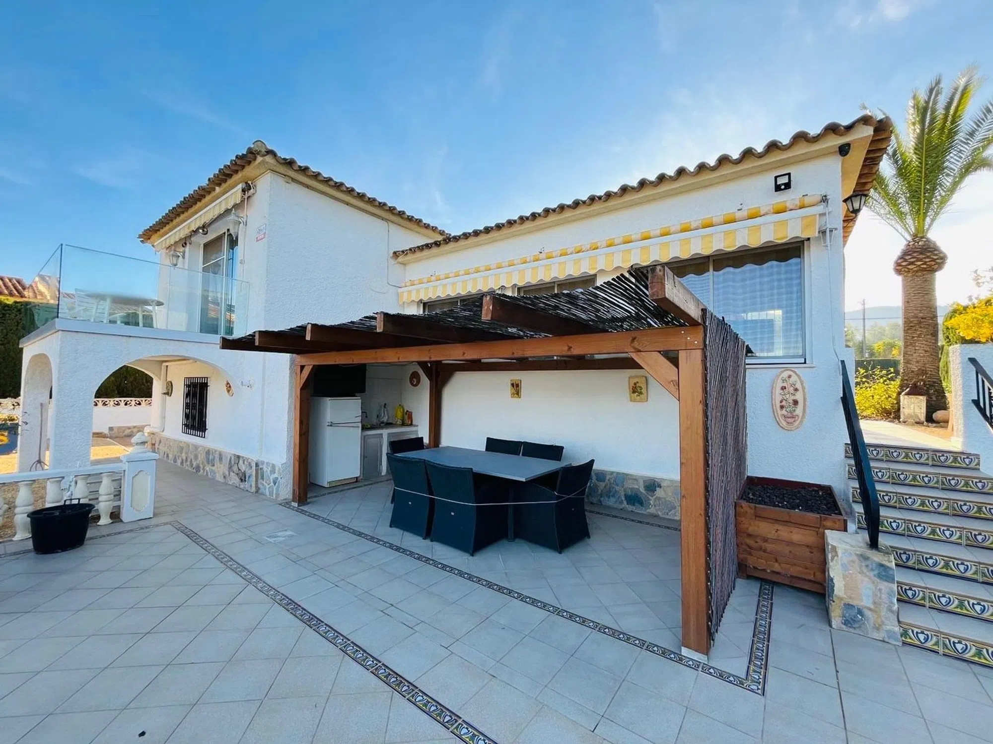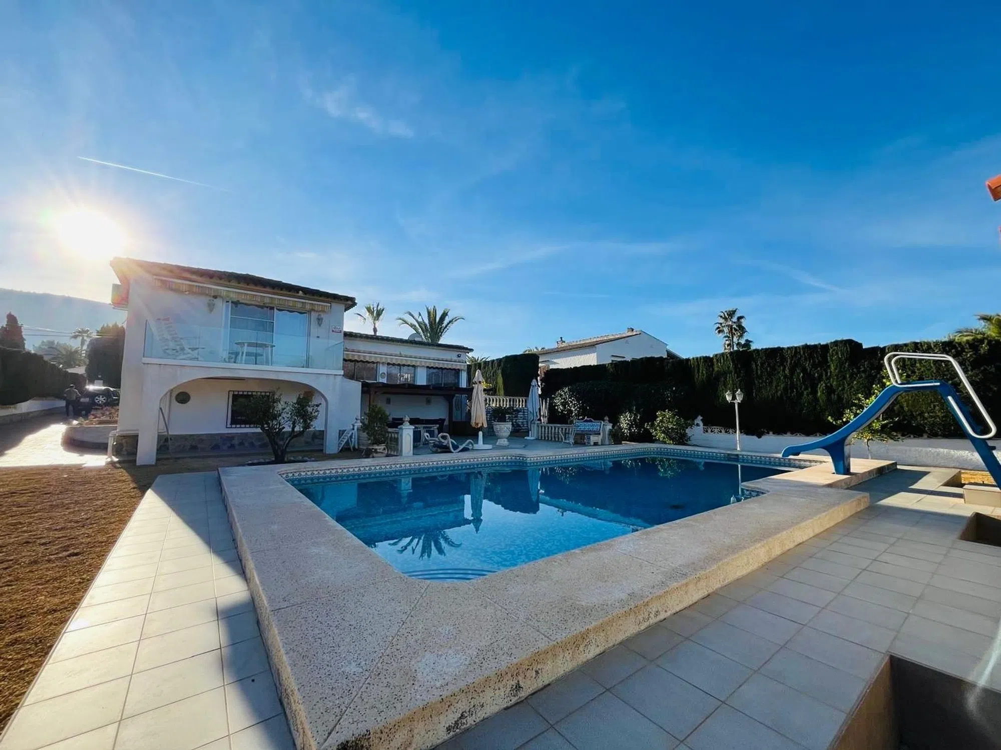 Elegante villa de 200m2 en una sola planta con una gran parcela de 1140m2 con hermosas palmeras en una zona muy tranquila a un paso del centro del Albir. Esta villa, lista para entrar a vivir, cuenta con una espaciosa piscina, ducha exterior, 3 dormitorios y 2 baños, terrazas cubiertas y descubiertas, garaje. aire acondicionado en todas las habitaciones, una moderna cocina también con acceso directo a la terraza cubierta y al jardín.