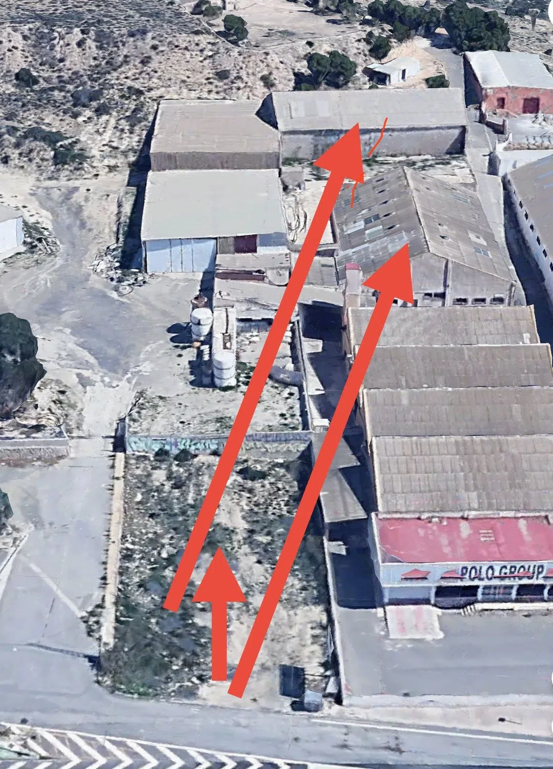 Parcela industrial de 720m con fachada a la carretera y parcela de 2000 m con dos naves independientes de 1000 metros y 700 m, más. Altura de las naves máxima de 8,50 m y mínima 5 m.