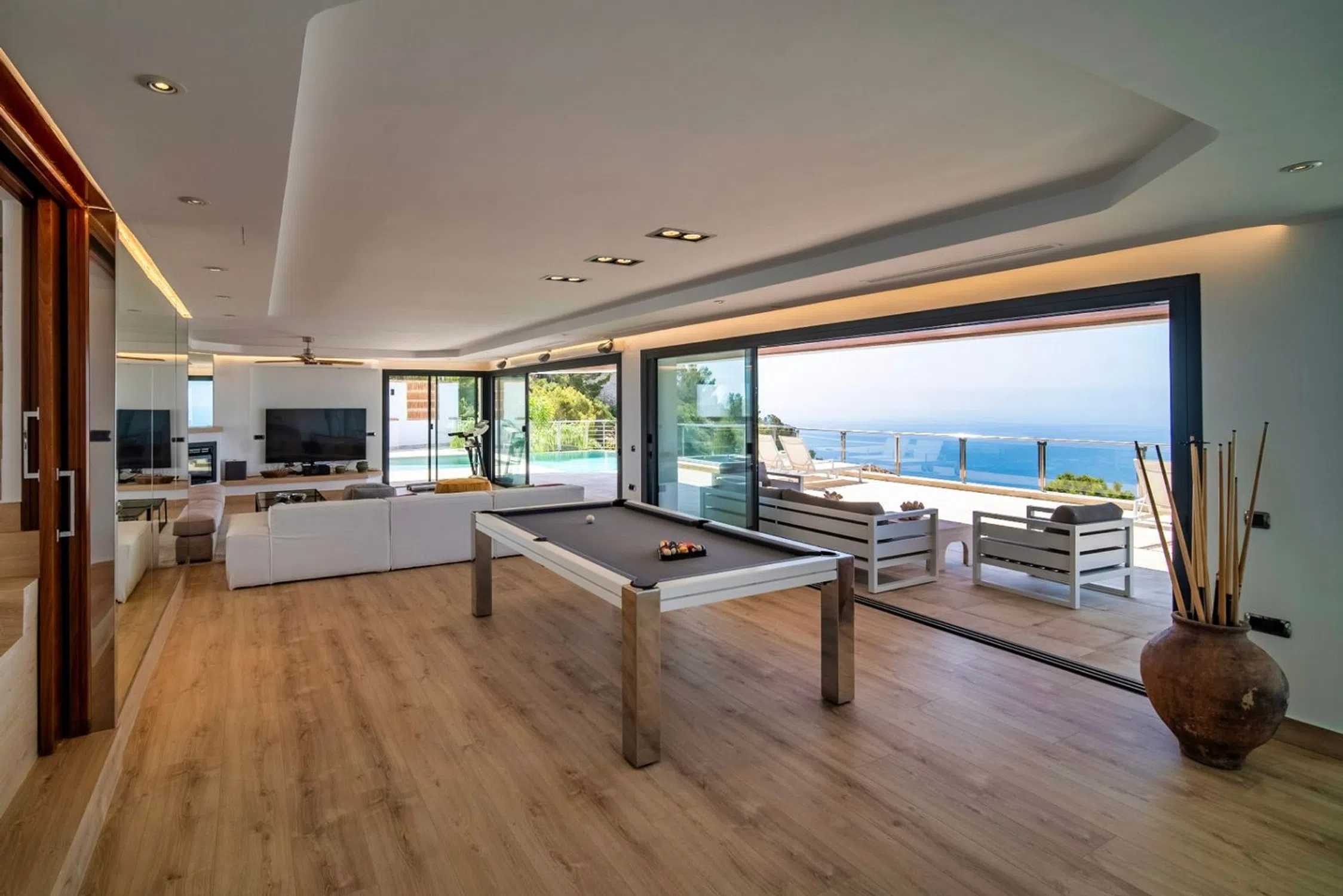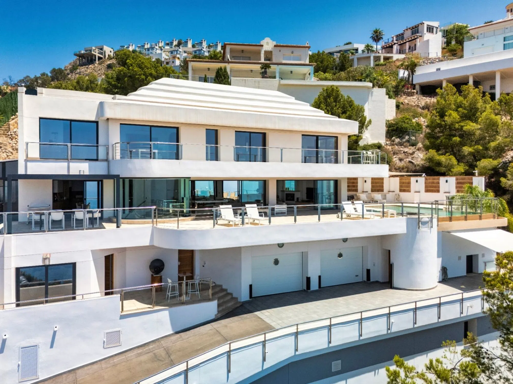 Ubicada en la prestigiosa urbanización Altea Hills, nos complace presentar esta imponente villa independiente que representa la esencia del lujo mediterráneo. Con una superficie útil de 600 m² distribuidos en una parcela de 1,077 m², esta extraordinaria propiedad combina arquitectura contemporánea, materiales de alta calidad y vistas sublimemente al mar, las montañas y el encantador pueblo de Altea, visibles desde prácticamente todas las habitaciones. La residencia se distribuye en varios niveles que ofrecen privacidad, amplitud y funcionalidad. En la planta baja, se encuentra un apartamento completamente independiente con dos dormitorios y dos baños, ideal para huéspedes o personal. La planta principal alberga dos apartamentos adicionales, cada uno con un dormitorio y baño en suite, asegurando el máximo confort y autonomía. En el nivel principal se encuentra una sala de estar de generosas dimensiones con un área de estar y espacio para billar, dos cocinas totalmente equipadas, un lavadero, un aseo para invitados y una magnífica terraza cubierta de 67 m² con piscina de agua salada, jacuzzi y sauna, que invitan a la relajación y el entretenimiento en un entorno incomparable. Una elegante escalera conduce al piso superior, donde tres dormitorios, tres baños, un vestidor, una oficina y una terraza panorámica de 30 m² abrazan la fachada principal, ofreciendo una experiencia visual inigualable. La propiedad está equipada con tecnología y acabados de primer nivel: calefacción aerotérmica, aire acondicionado central, chimenea de pellets, ventanas de doble acristalamiento, persianas eléctricas, sistema de hogar inteligente, cine en casa, ascensor, puerta blindada y sistemas de alarma con videovigilancia tanto en interiores como en exteriores. El acceso a la vivienda se realiza a través de una entrada automatizada que conduce a un amplio aparcamiento exterior para varios vehículos, dos garajes cerrados y un porche con un techo y sistema de iluminación automáticos. Un detalle único es el corredor de acceso desde el sótano, donde se ha preservado la roca natural de la montaña, creando una atmósfera de autenticidad y distinción. Situada en una comunidad cerrada con vigilancia las 24 horas, esta villa ofrece un ambiente seguro, privado y sereno, a solo 4 km de la playa de Mascarat y a aproximadamente 70 km del aeropuerto de Alicante-Elche. Su ubicación estratégica permite acceder en solo siete minutos tanto al centro histórico de Altea como a Calpe, donde se pueden encontrar todos los servicios, escuelas, tiendas y una amplia gama de ofertas gastronómicas y culturales. Con una calificación energética de B y diseñada para cumplir con los estándares más exigentes, esta residencia representa una oportunidad única para aquellos que buscan un hogar exclusivo en uno de los enclaves más solicitados de la Costa Blanca.