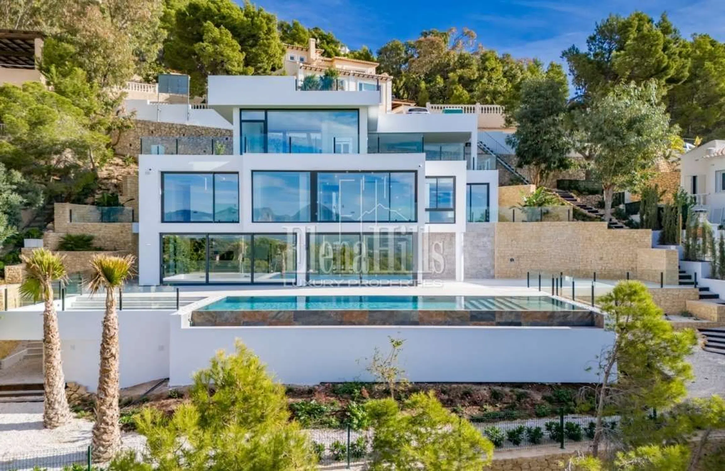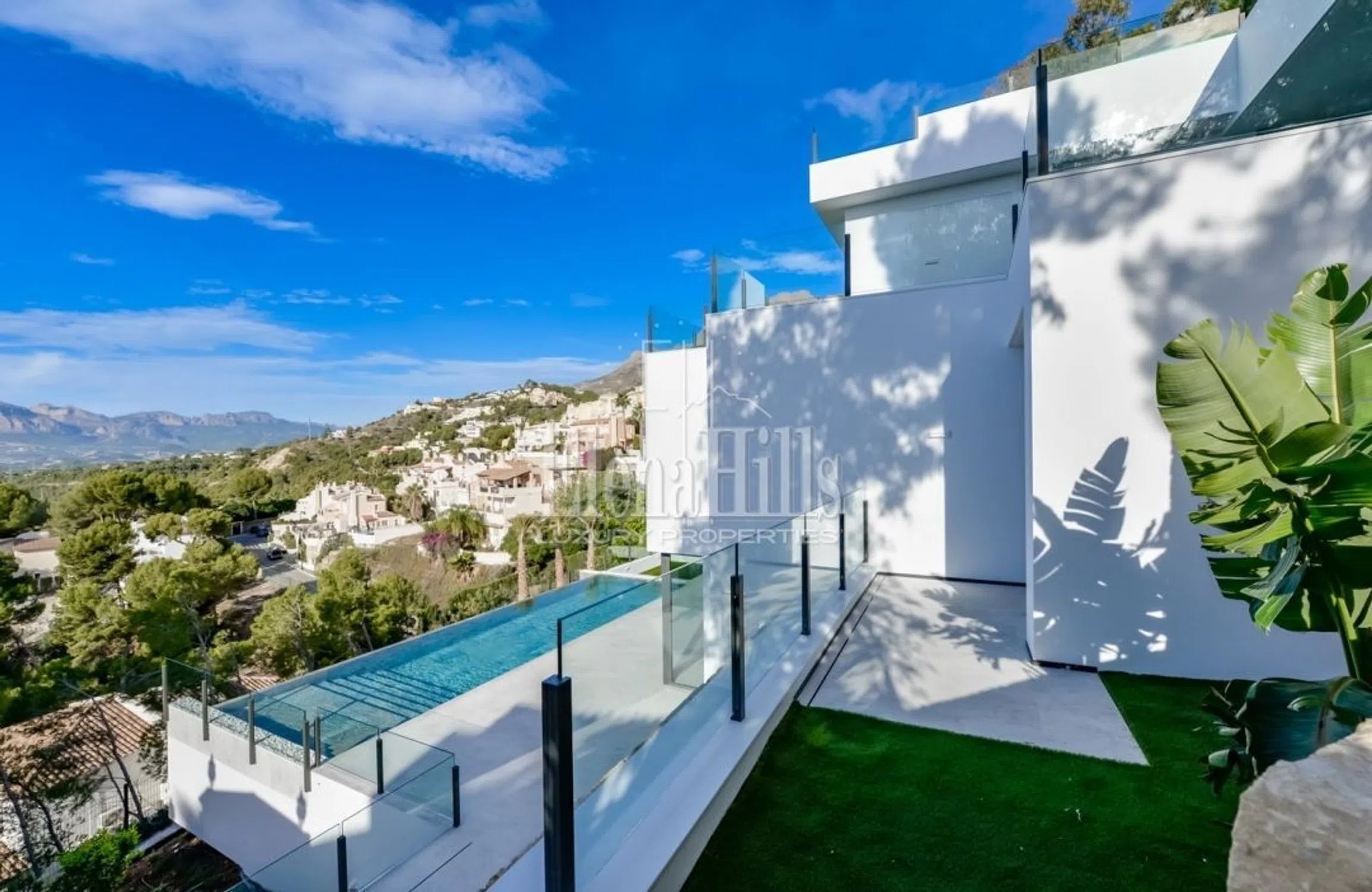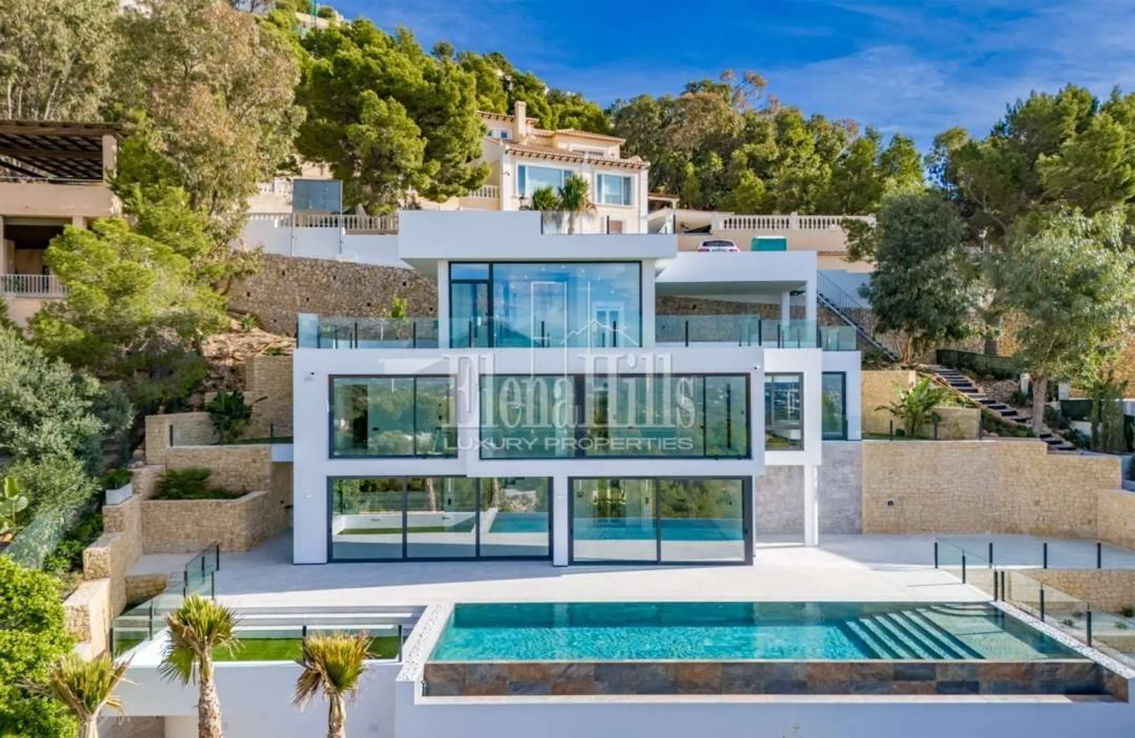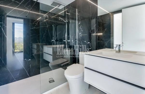 Nueva villa con vistas panorámicas al mar y a las montañas, ubicada en Altea Hills, la urbanización más segura y prestigiosa, famosa por sus impresionantes vistas y villas, así como por el silencio y la privacidad garantizados. La villa tiene 3 plantas, la superficie total de la casa es de 560 m2 y la superficie de la parcela es de 817 m2. En la entrada a la parcela hay a un estacionamiento abierto para 2 coches, así como una zona exterior con impresionantes vistas al mar y a la montaña. Más abajo por las escaleras, se llega al nivel superior de la villa hasta la entrada principal de la casa con ascensor. A la izquierda de la entrada principal hay un guardarropa. Bajando un piso, te encuentras en un piso con 4 dormitorios con baños privados, cada dormitorio tiene un lugar para un guardarropa, el dormitorio principal tiene un lugar para un guardarropa separado o un dormitorio para niños, y en el baño principal, además a una ducha, también hay un jacuzzi. Bajando un piso más, te encuentras en una amplia sala de estar, donde también hay una cocina abierta y un comedor. Junto a la cocina hay un trastero que puede acomodar una lavadora, un congelador y otros electrodomésticos. También en esta planta hay un dormitorio de invitados y un aseo de invitados con ducha. Desde el salón se accede a una amplia terraza con impresionantes vistas al mar, piscina infinity y zona de barbacoa. Hay una ducha cerca de la piscina. La casa está equipada con aire acondicionado, suelo radiante y sistema “casa inteligente”.