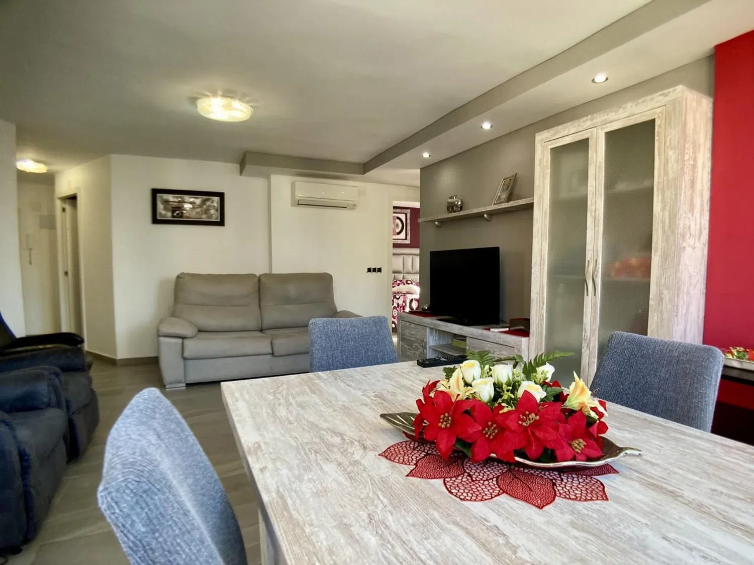 Piso en venta situado en la zona Levante de Benidorm, muy cerca de la famosa Plaza Triangular, en una urbanización con zonas verdes comunes y piscina comunitaria. El piso tiene 95 m2 construidos distribuidos en 3 dormitorios dobles con armario empotrado, salón comedor, amplía terraza acristalada, cocina independiente totalmente equipada y 2 baños completos con ducha (1 ensuite). El piso está totalmente reformado y se encuentra en perfecto estado, dispone de aire acondicionado frío-calor y se queda completamente amueblado, listo para entrar a vivir. Plaza de garaje cabinada opcional en otro edificio, cerca del piso, en 28.000 € más. La zona de donde se encuentra el piso es muy demanda, por tener la comodidad de disponer de todos los servicios alrededor, así como: cafeterías, supermercados, restaurantes, sucursales de bancos, farmacias, . y a un paso del Ayuntamiento de Benidorm, uno de los edificios más emblemáticos de la ciudad. Está tendido horizontalmente y alzado sobre el suelo, rompiendo con la imagen de verticalidad de una ciudad de rascacielos que reúne alguna de las construcciones más altas de España. Se sitúa dentro del famoso Parque de l´Aigüera, una zona verde con elementos arquitectónicos que hacer recordar al neoclasicismo.