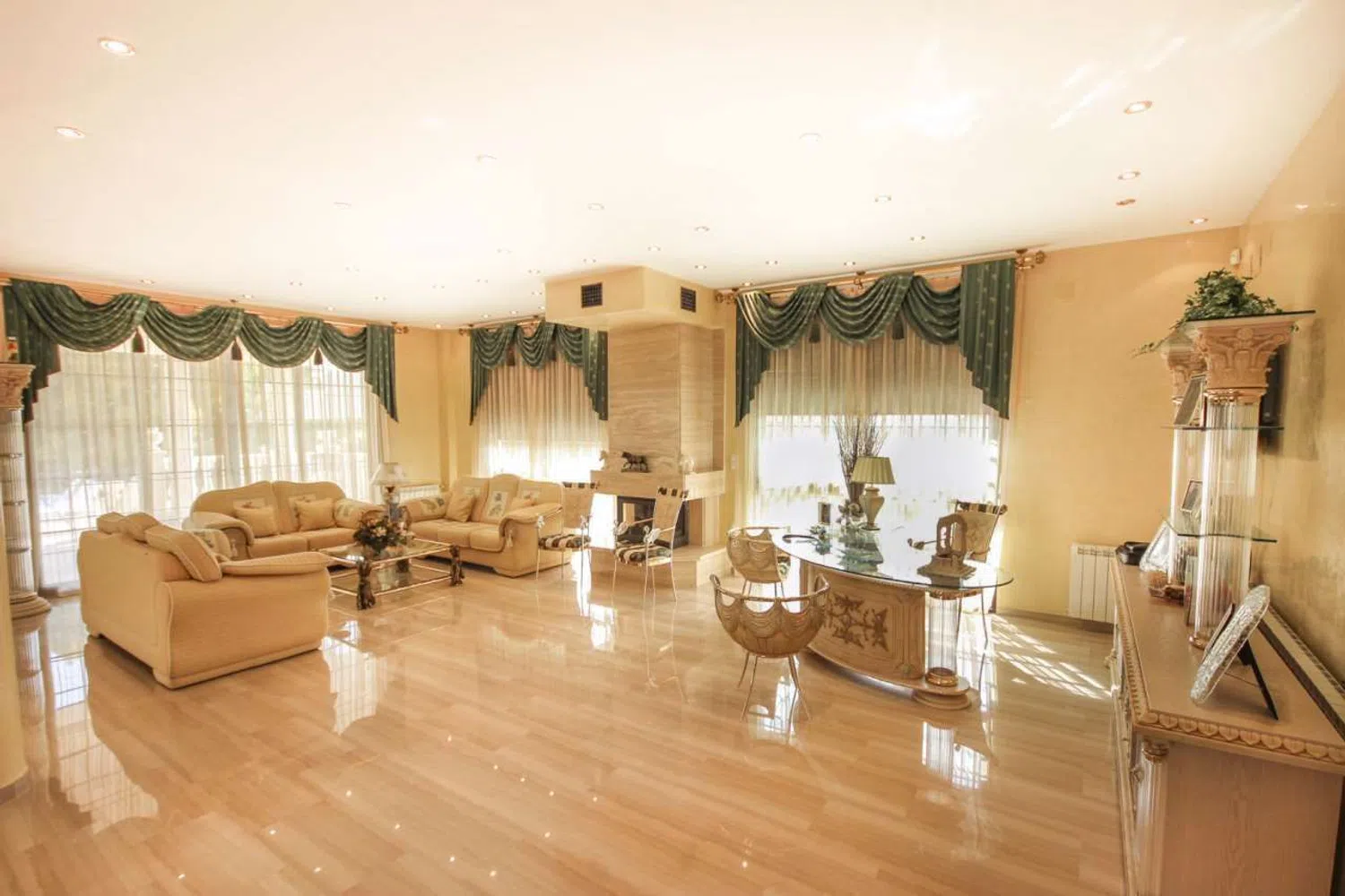 Auf drei Etagen verteilt, bietet die Villa eine großzügige Wohnfläche von insgesamt 865 m2. Das Erdgeschoss empfängt Sie mit einem beeindruckenden Eingangsbereich, der von einer eleganten Treppe flankiert wird. Hier finden Sie ein stilvolles Büro, ein geräumiges Wohn- und Esszimmer mit gewölbter Decke und Kamin, eine unabhängige, große Küche sowie zwei Schlafzimmer mit Badezimmer en Suite und ein Gäste-WC.