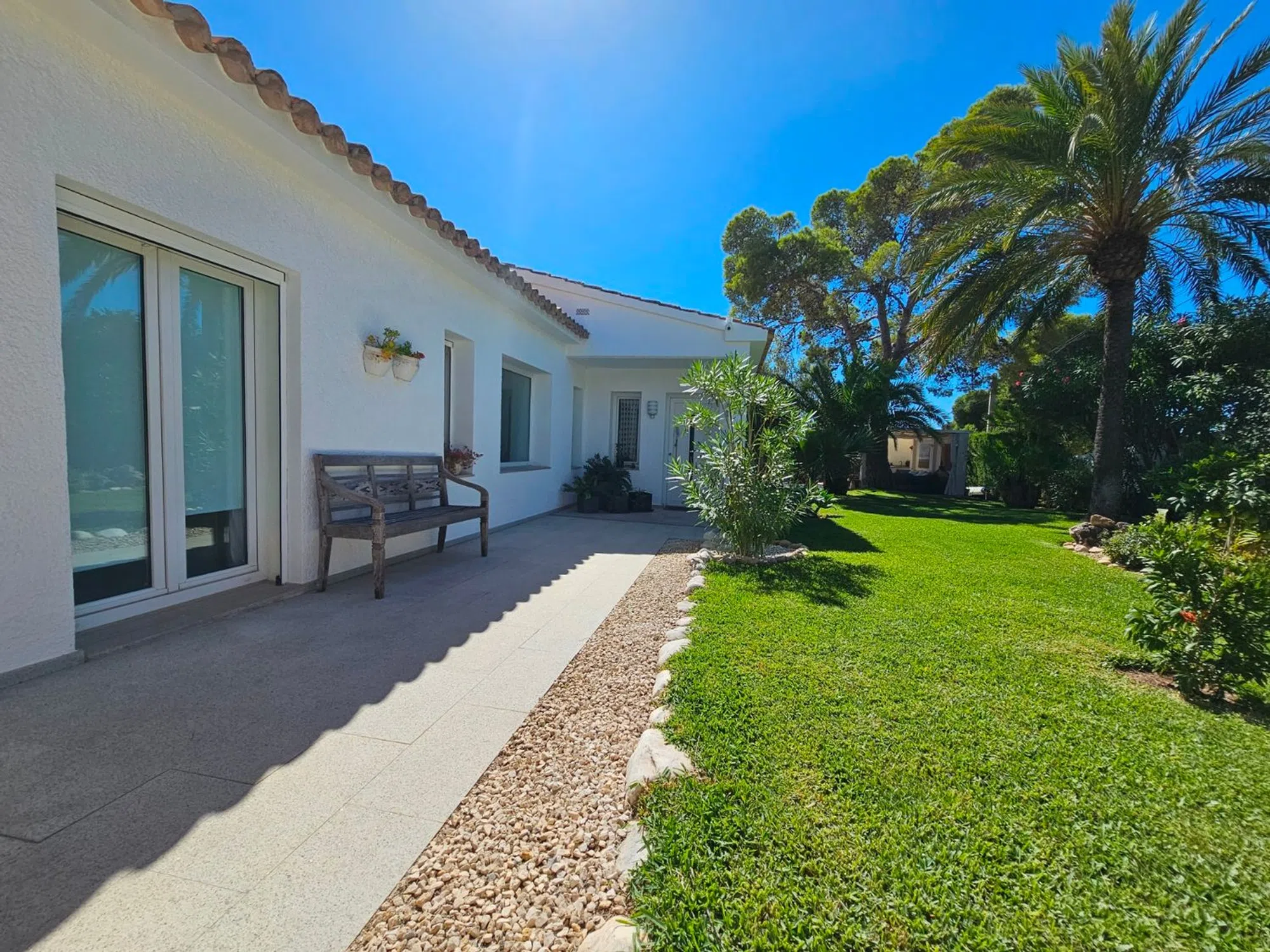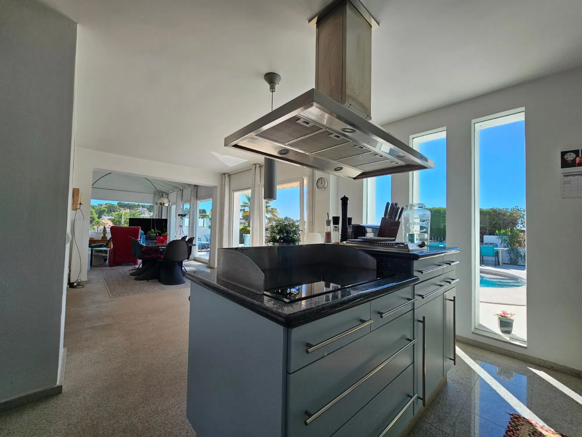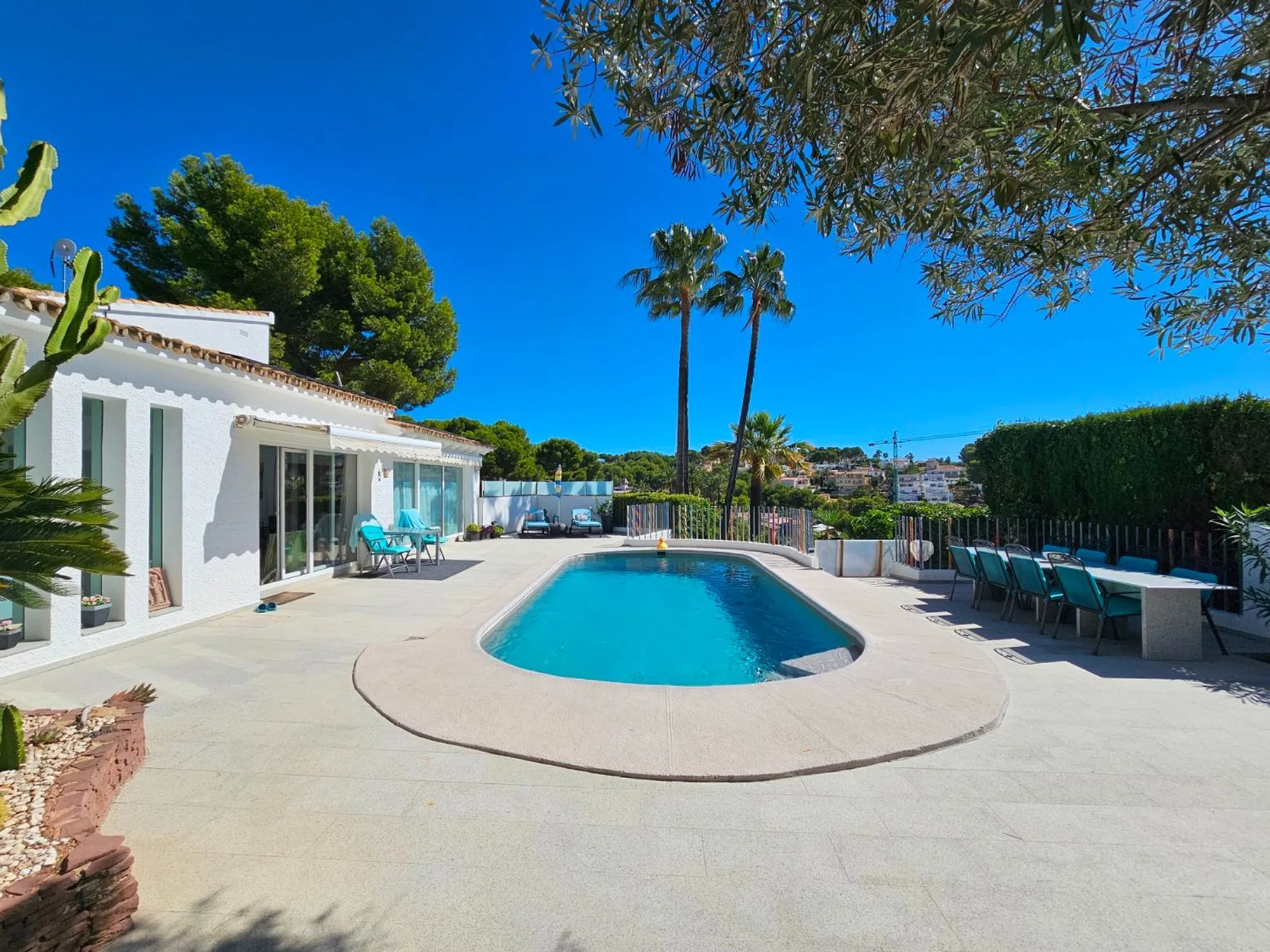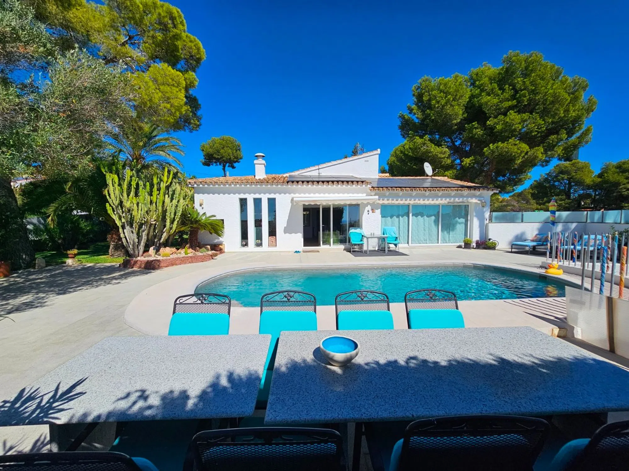 Villa de lujo reformada en el campo de golf de San Jaime, cerca de Moraira. Esta villa recientemente renovada se encuentra en la pintoresca primera línea del famoso campo de golf de San Jaime, Benissa. Con cinco dormitorios y tres baños, es una casa familiar ideal. En la planta baja la villa se abre a un amplio y luminoso salón - comedor con grandes puertas que se abren a una piscina de 9 x 4,5 my una gran terraza con vistas al mar y al Peñón de Ifach. En esta terraza encontramos también una acogedora cocina de verano. La moderna cocina adyacente al salón está equipada con electrodomésticos y acabados de calidad. La primera planta está dedicada a la relajación y la privacidad, donde también se encuentra el dormitorio principal. Aquí encontrará un aseo de invitados y un baño generosamente grande con ducha y bañera que se comparte con el dormitorio doble. Ambos dormitorios tienen puertas de terraza. La villa tiene paneles solares con un sistema de almacenamiento de batería. Además encontramos aire acondicionado, calefacción por suelo radiante, doble acristalamiento y un sistema de riego en el jardín. La zona exterior se complementa con una barbacoa y una amplia zona de aparcamiento junto con una acogedora casa de invitados. Todo está rodeado por un hermoso y cuidado jardín mediterráneo. El sótano ofrece varios trasteros. Allí también se encuentra el apartamento con su cocina abierta al salón y dos habitaciones individuales, que comparten un baño.