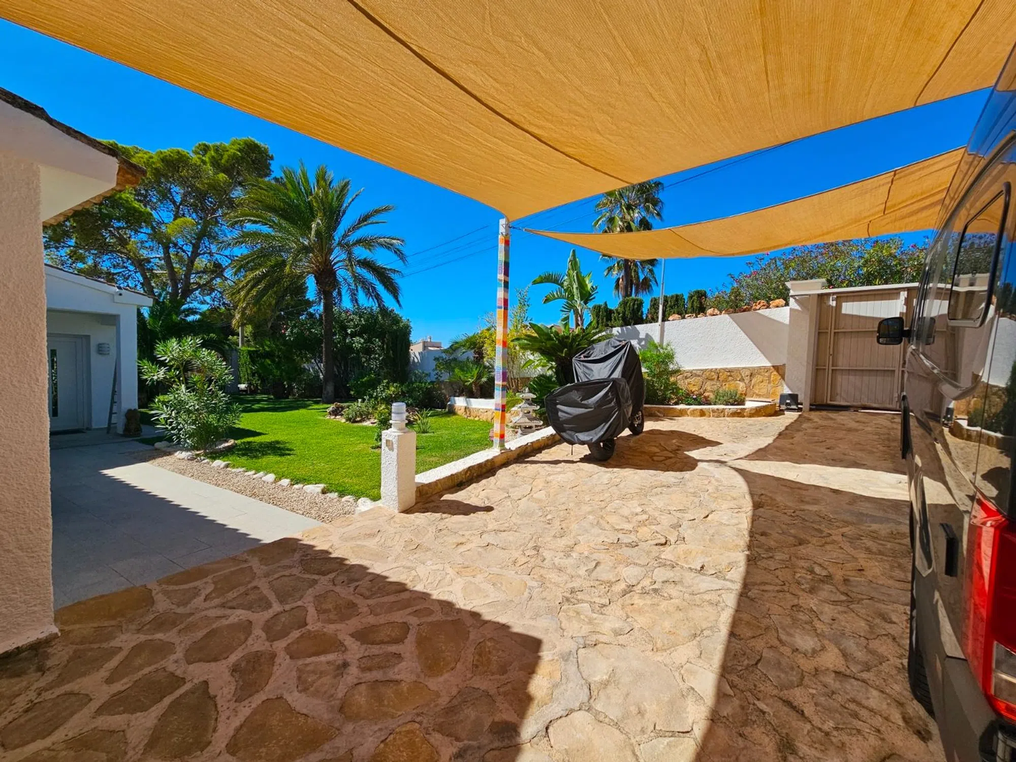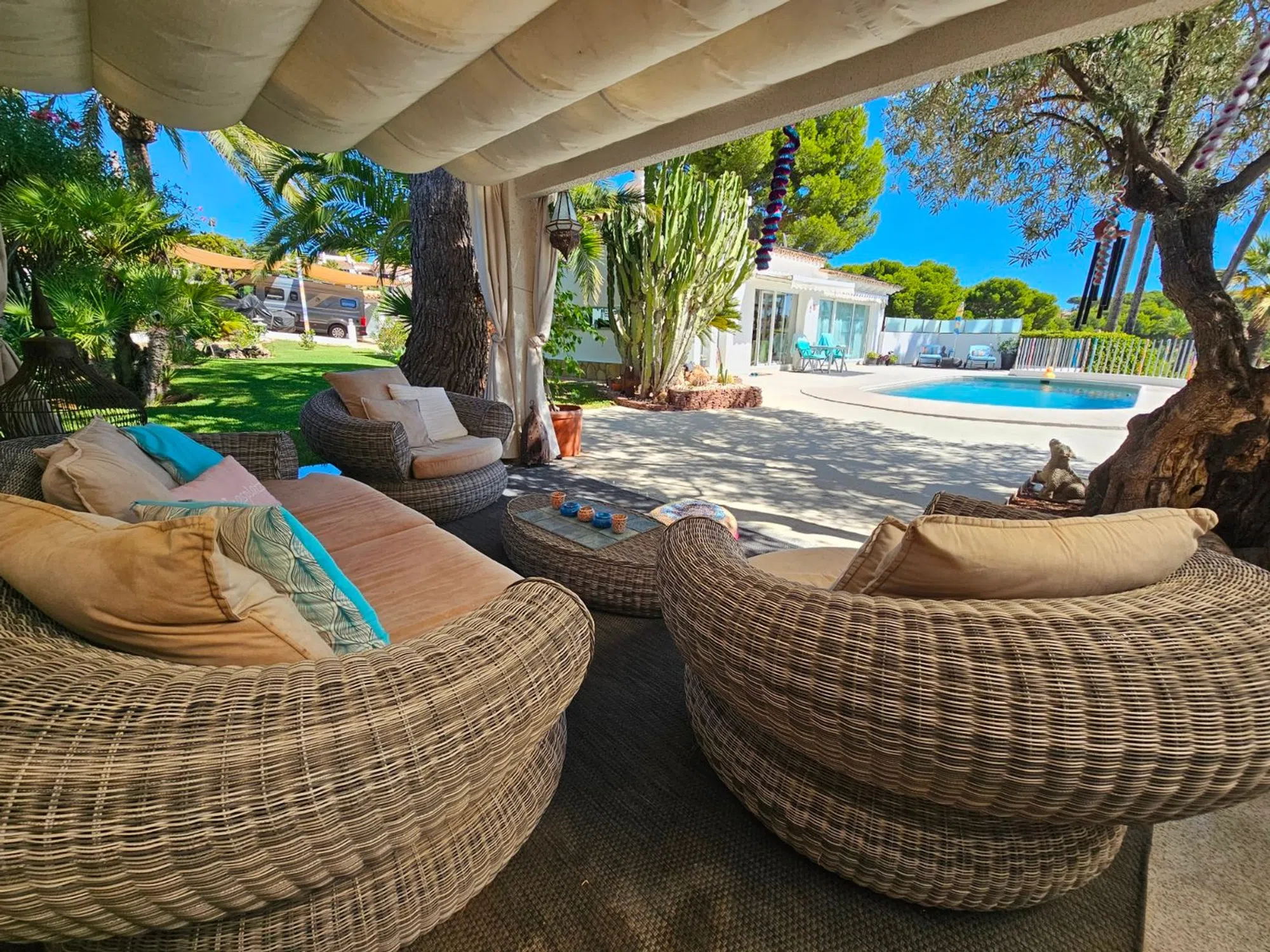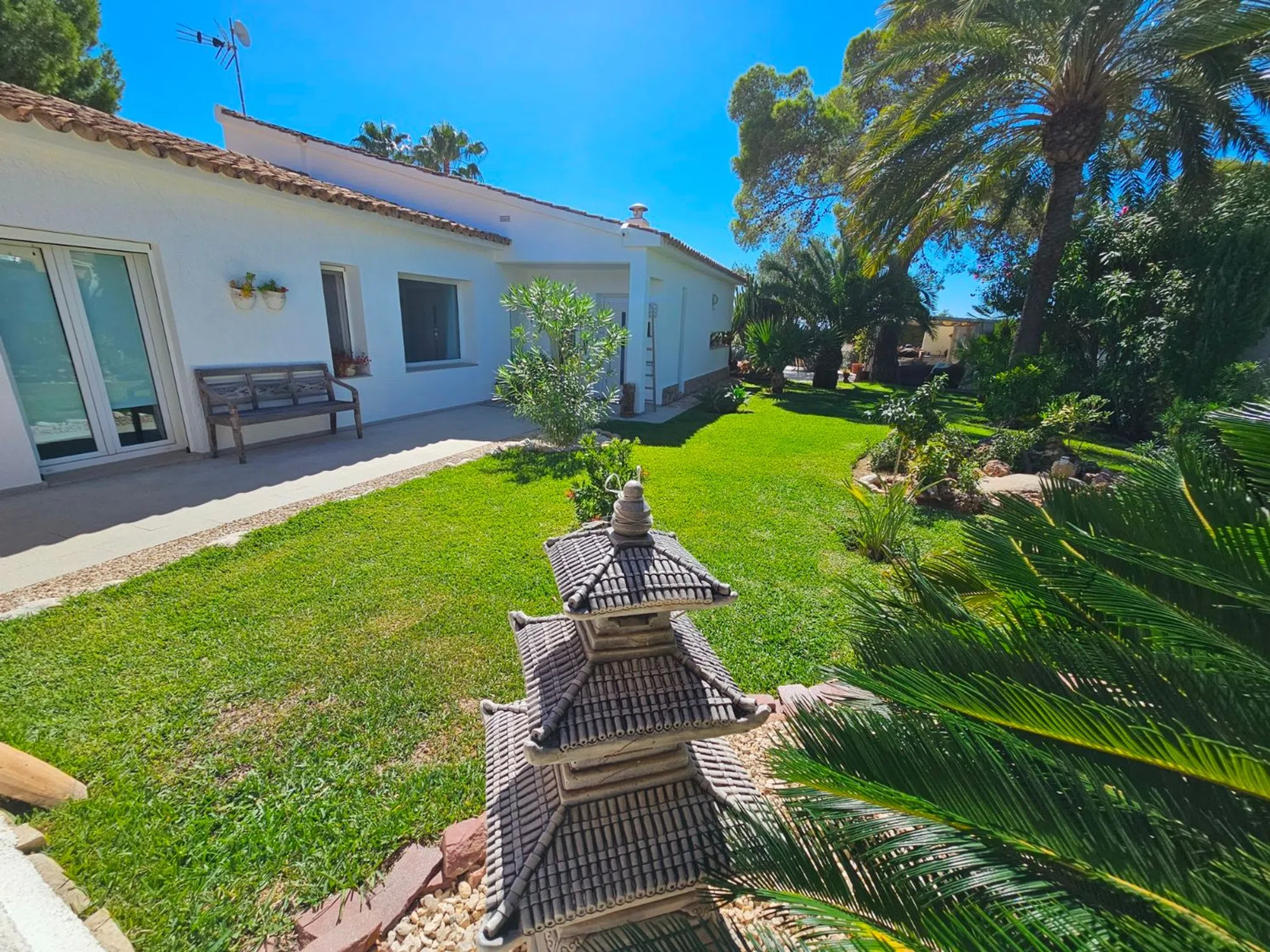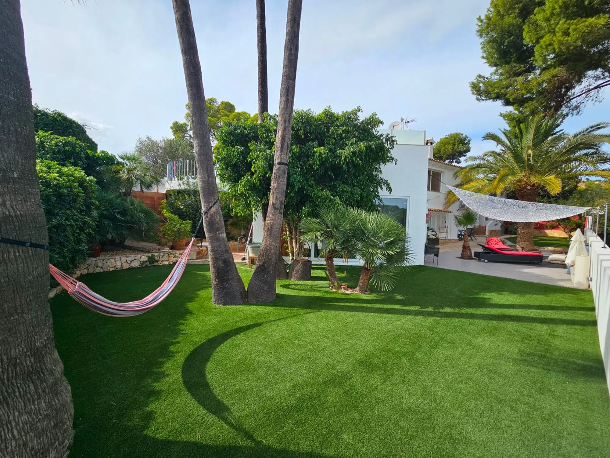 Villa de lujo reformada en el campo de golf de San Jaime, cerca de Moraira. Esta villa recientemente renovada se encuentra en la pintoresca primera línea del famoso campo de golf de San Jaime, Benissa. Con cinco dormitorios y tres baños, es una casa familiar ideal. En la planta baja la villa se abre a un amplio y luminoso salón - comedor con grandes puertas que se abren a una piscina de 9 x 4,5 my una gran terraza con vistas al mar y al Peñón de Ifach. En esta terraza encontramos también una acogedora cocina de verano. La moderna cocina adyacente al salón está equipada con electrodomésticos y acabados de calidad. La primera planta está dedicada a la relajación y la privacidad, donde también se encuentra el dormitorio principal. Aquí encontrará un aseo de invitados y un baño generosamente grande con ducha y bañera que se comparte con el dormitorio doble. Ambos dormitorios tienen puertas de terraza. La villa tiene paneles solares con un sistema de almacenamiento de batería. Además encontramos aire acondicionado, calefacción por suelo radiante, doble acristalamiento y un sistema de riego en el jardín. La zona exterior se complementa con una barbacoa y una amplia zona de aparcamiento junto con una acogedora casa de invitados. Todo está rodeado por un hermoso y cuidado jardín mediterráneo. El sótano ofrece varios trasteros. Allí también se encuentra el apartamento con su cocina abierta al salón y dos habitaciones individuales, que comparten un baño.
