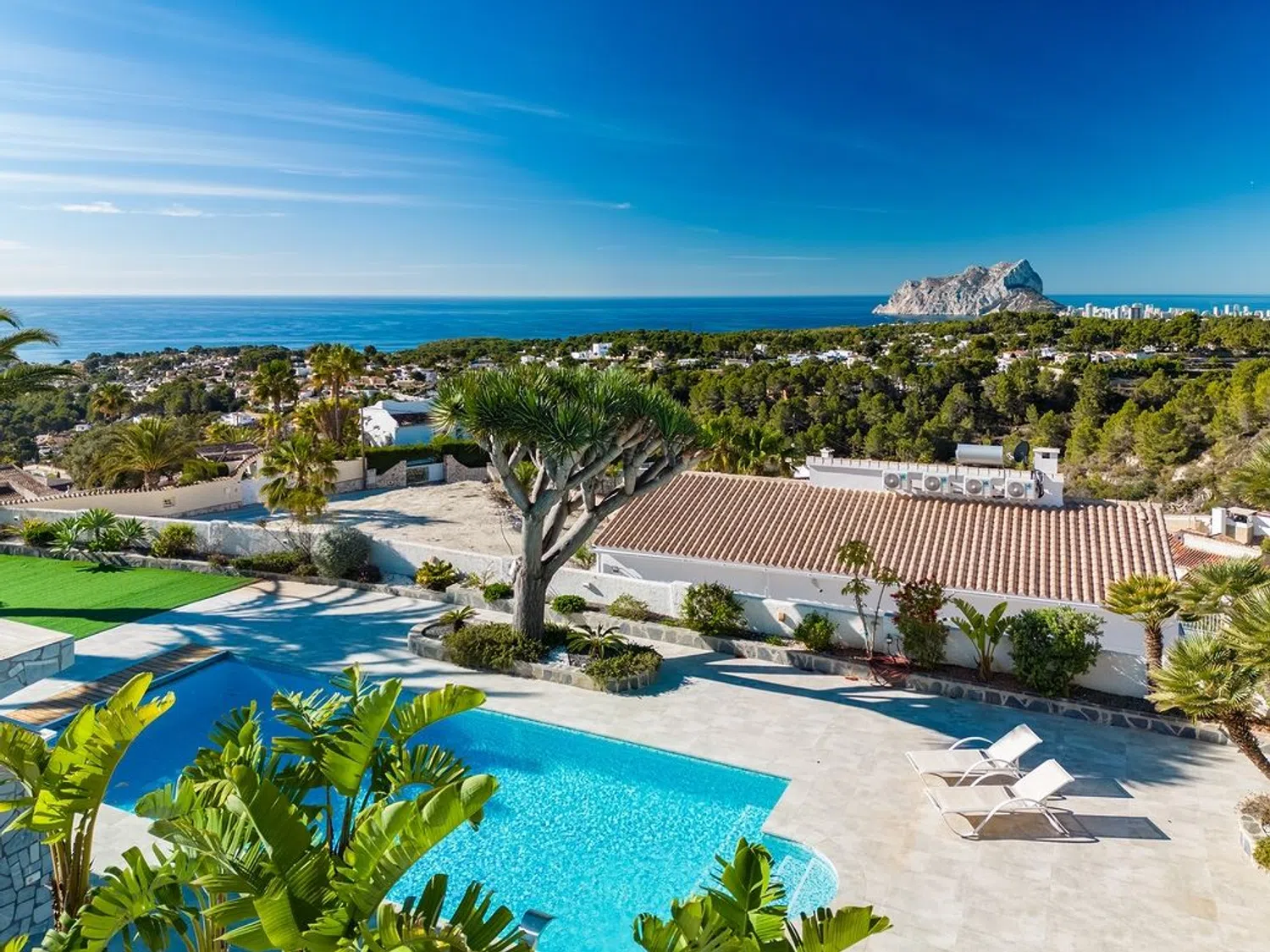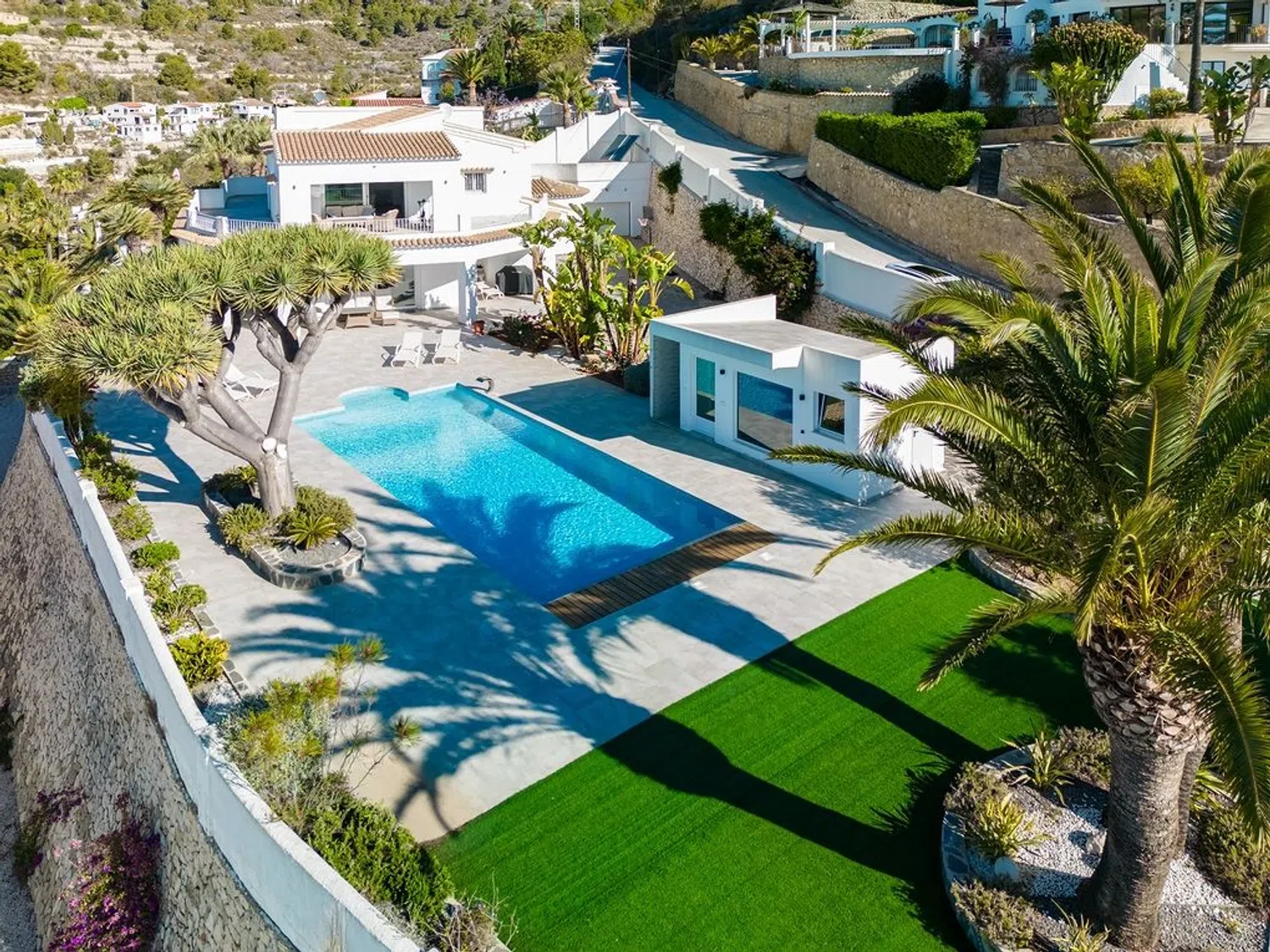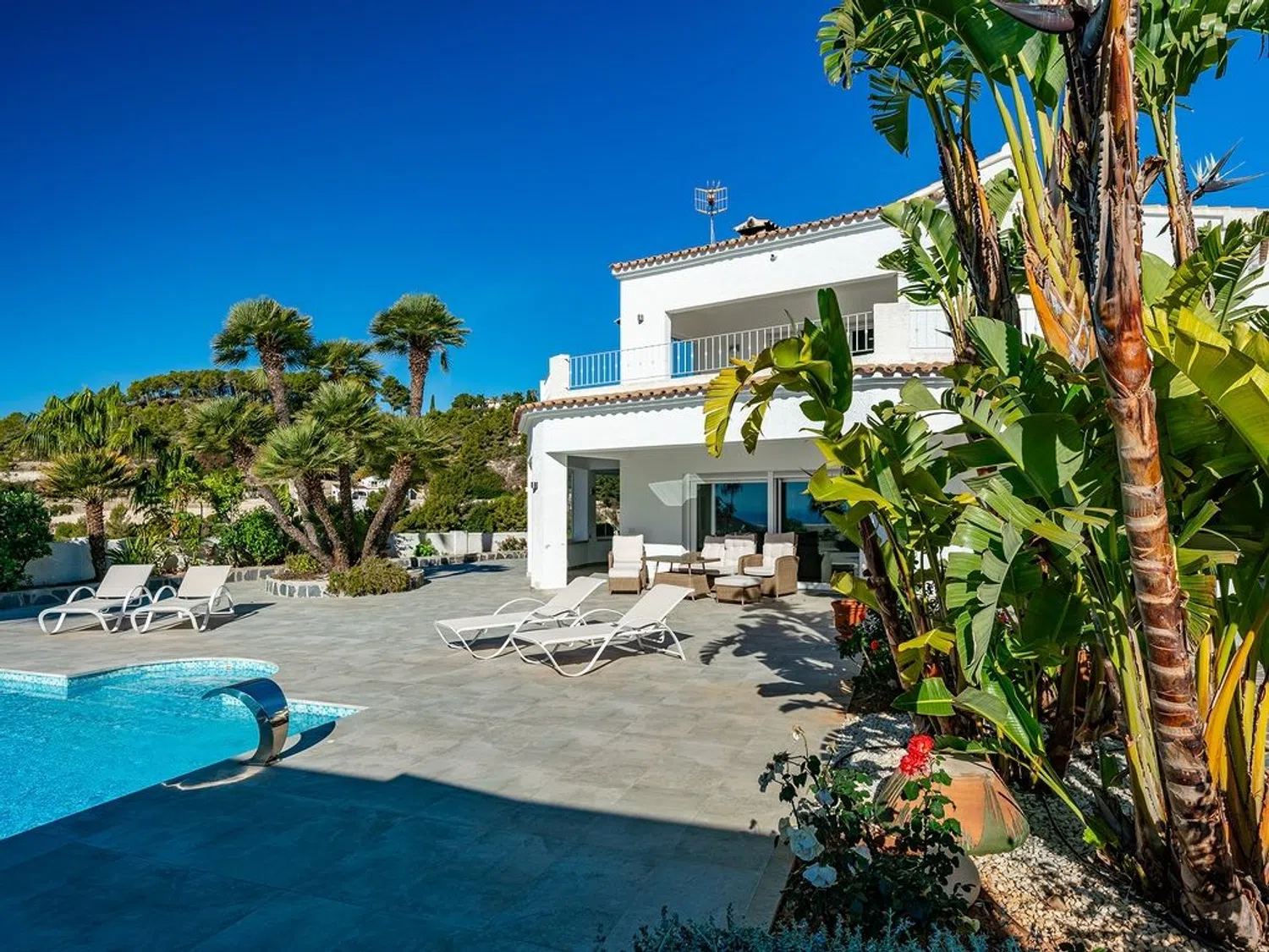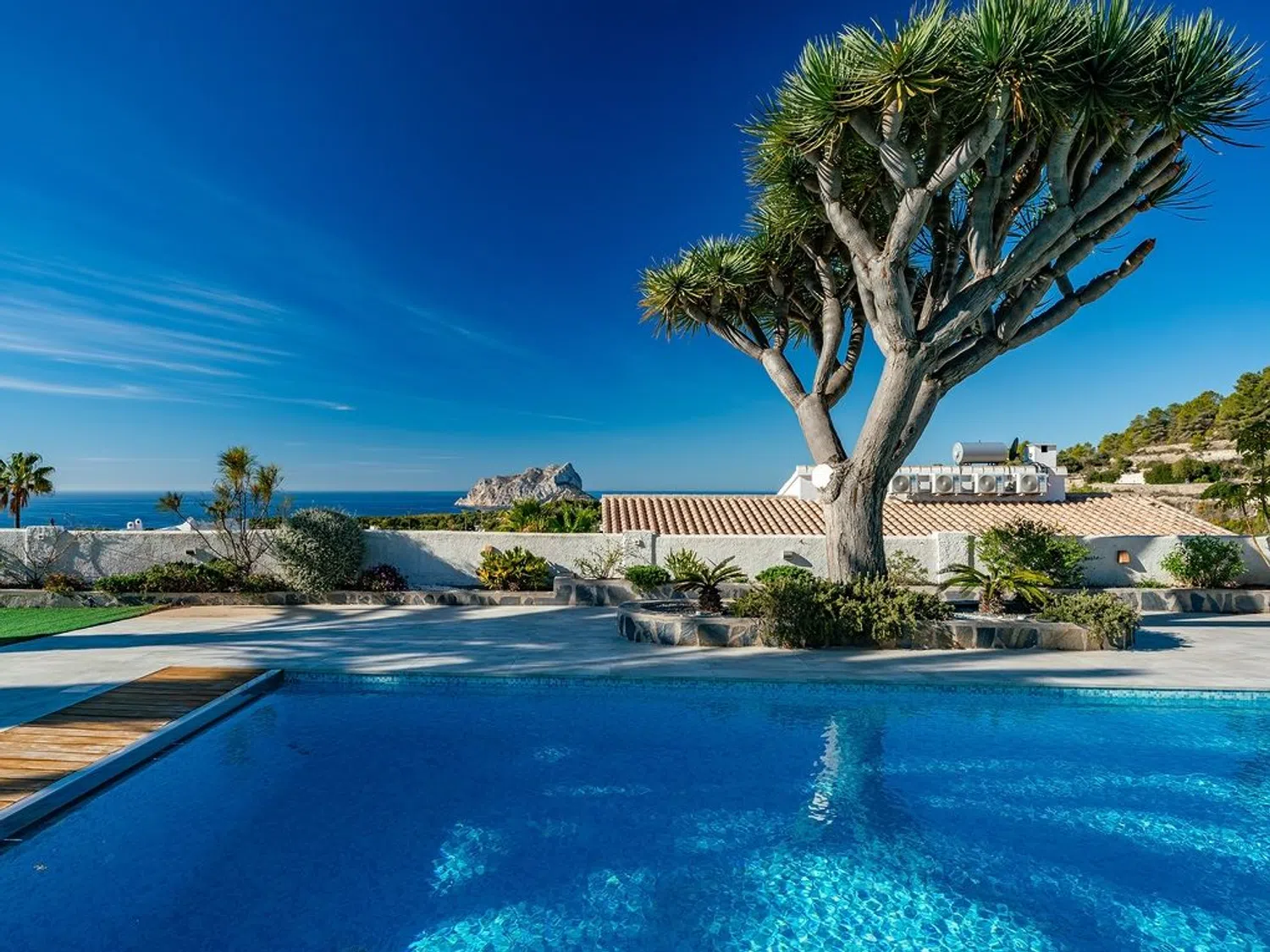 Der separierte Schlafbereich bietet viel Privatsphäre und verfügt über ein Hauptschlafzimmer mit eigenem Bad und Zugang zur Terrasse, sowie zwei weitere Schlafzimmer und ein zusätzliches Badezimmer. Im Außenbereich wurde großer Wert auf indirekte Beleuchtung gelegt, die eine einzigartige und ganz besondere Atmosphäre schafft, insbesondere in der Nacht, mit dem großen Pool, der Sauna (mit beneidenswertem Ausblick) und dem beeindruckenden Mittelmeer als Kulisse zum Entspannen und Abschalten bei einem Glas Wein.
