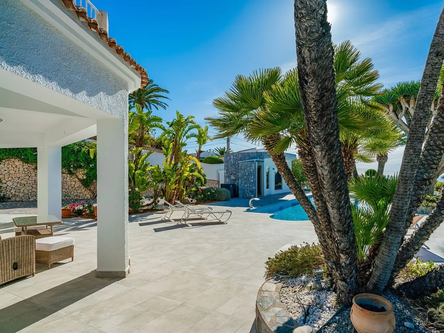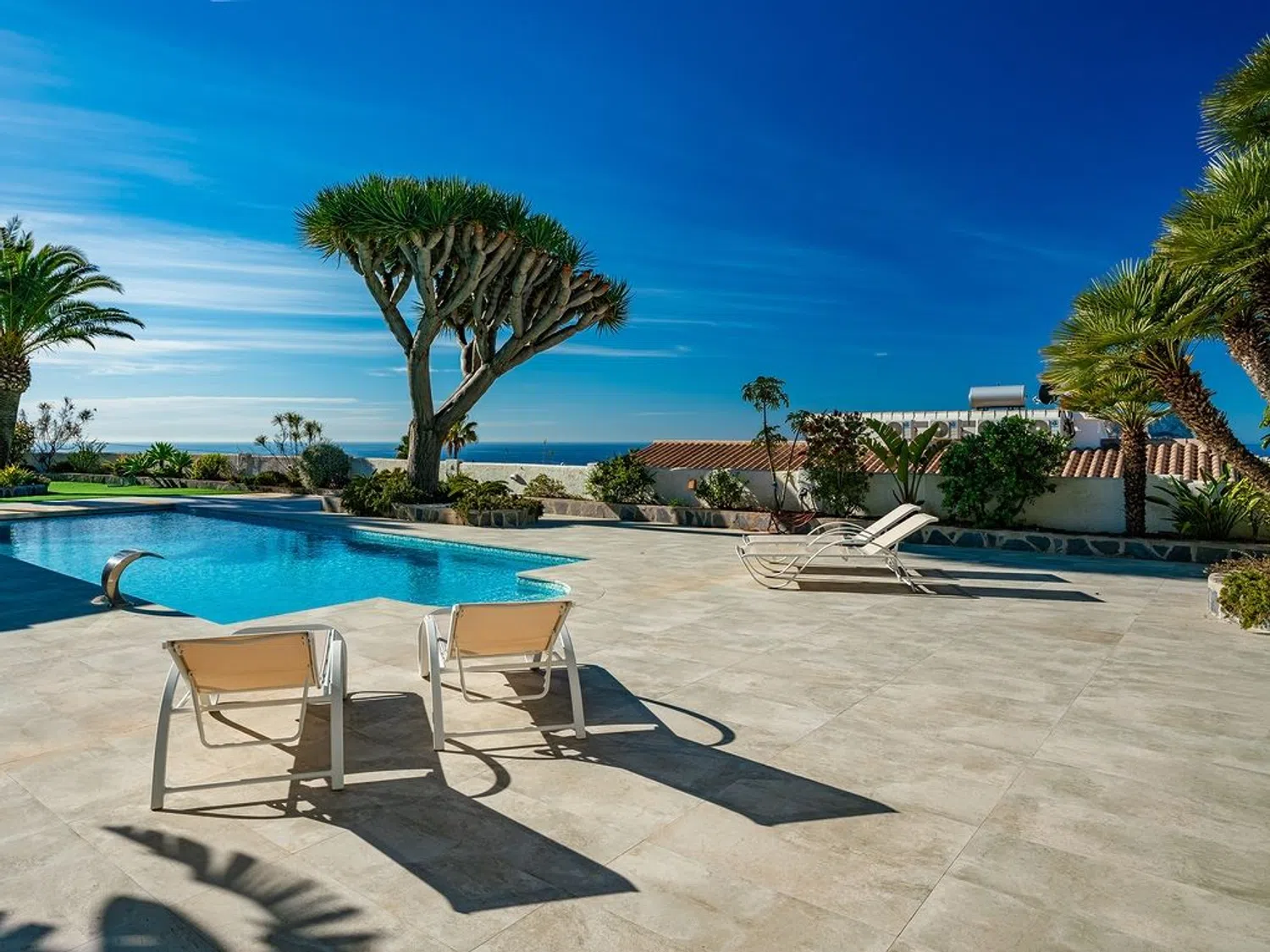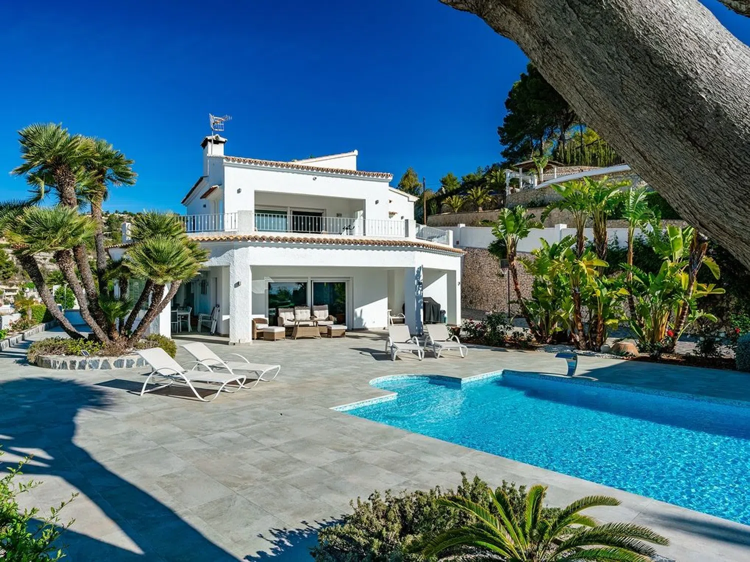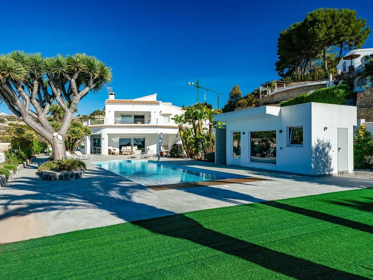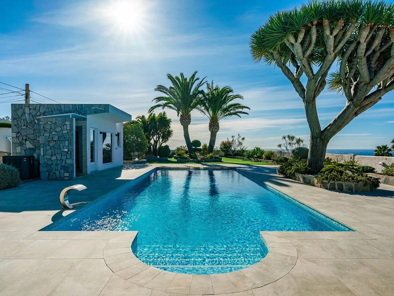 Der separierte Schlafbereich bietet viel Privatsphäre und verfügt über ein Hauptschlafzimmer mit eigenem Bad und Zugang zur Terrasse, sowie zwei weitere Schlafzimmer und ein zusätzliches Badezimmer. Im Außenbereich wurde großer Wert auf indirekte Beleuchtung gelegt, die eine einzigartige und ganz besondere Atmosphäre schafft, insbesondere in der Nacht, mit dem großen Pool, der Sauna (mit beneidenswertem Ausblick) und dem beeindruckenden Mittelmeer als Kulisse zum Entspannen und Abschalten bei einem Glas Wein.