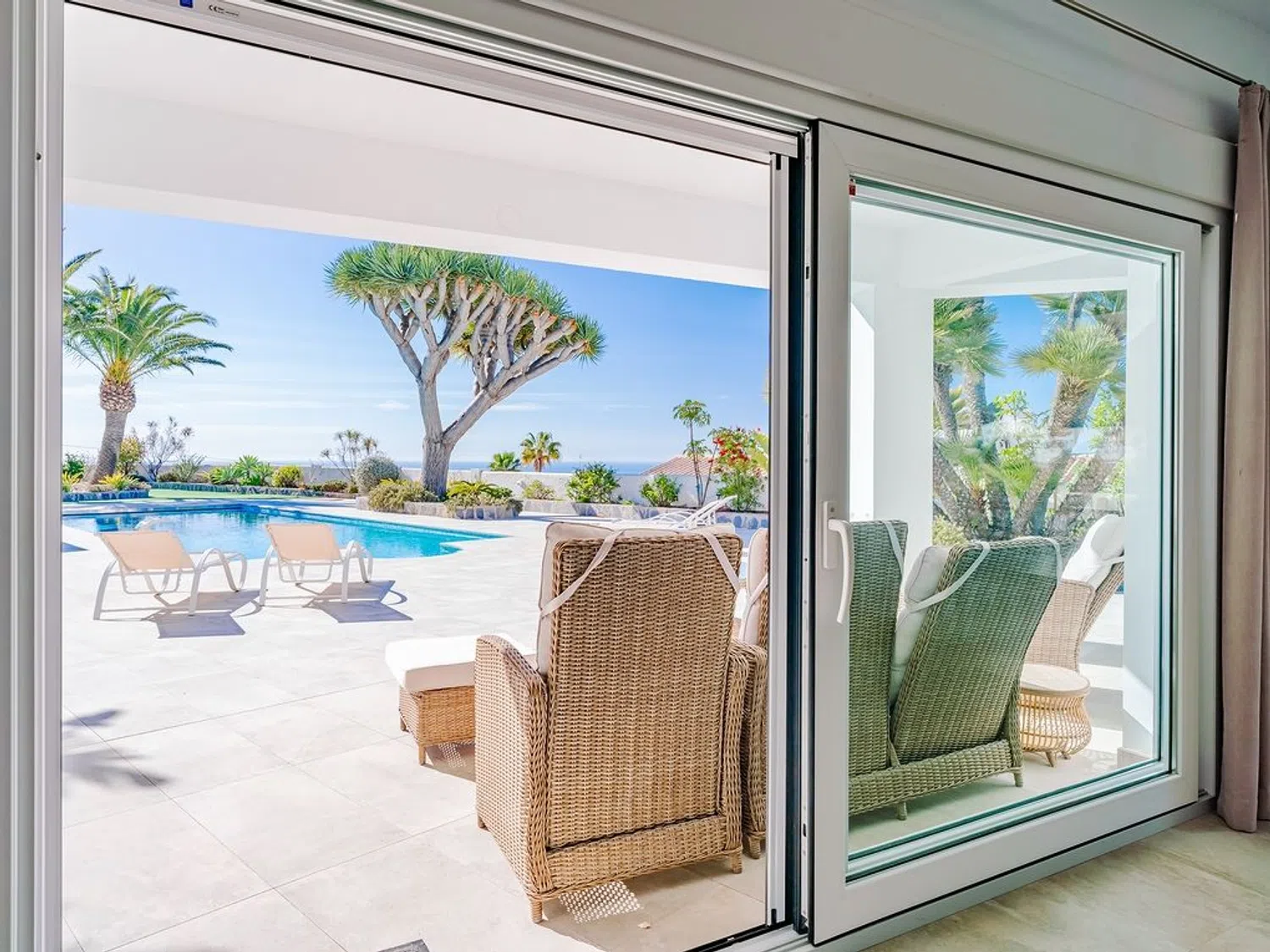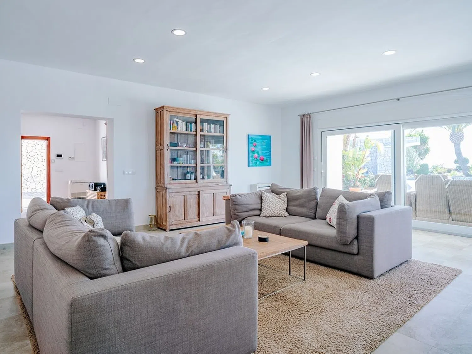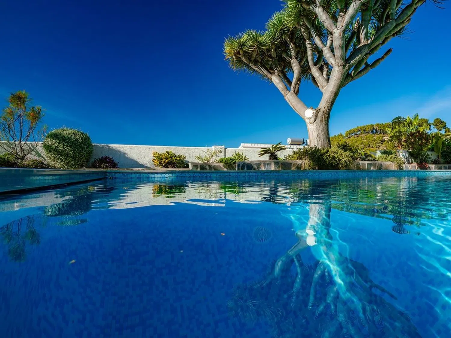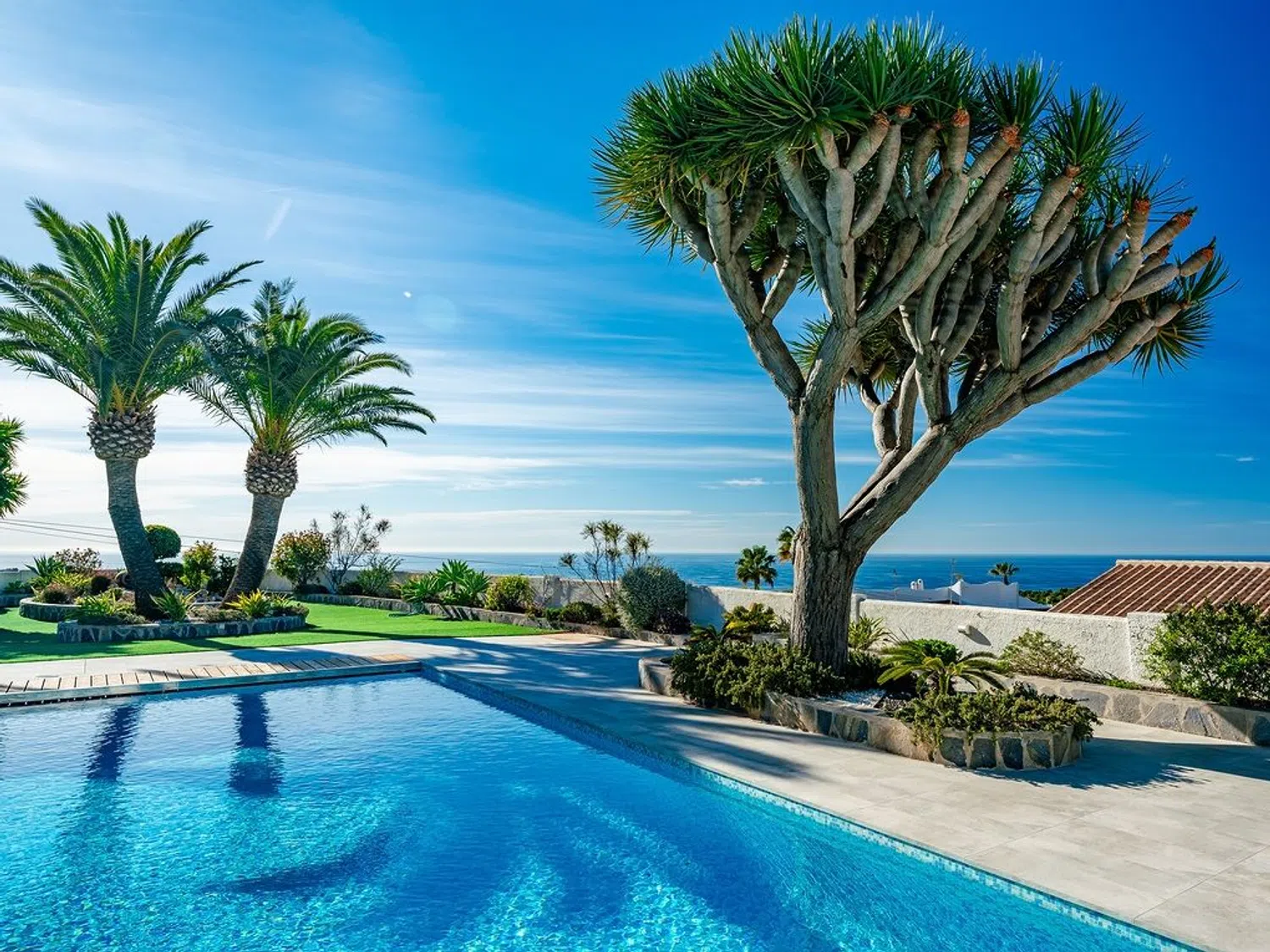 Der separierte Schlafbereich bietet viel Privatsphäre und verfügt über ein Hauptschlafzimmer mit eigenem Bad und Zugang zur Terrasse, sowie zwei weitere Schlafzimmer und ein zusätzliches Badezimmer. Im Außenbereich wurde großer Wert auf indirekte Beleuchtung gelegt, die eine einzigartige und ganz besondere Atmosphäre schafft, insbesondere in der Nacht, mit dem großen Pool, der Sauna (mit beneidenswertem Ausblick) und dem beeindruckenden Mittelmeer als Kulisse zum Entspannen und Abschalten bei einem Glas Wein.