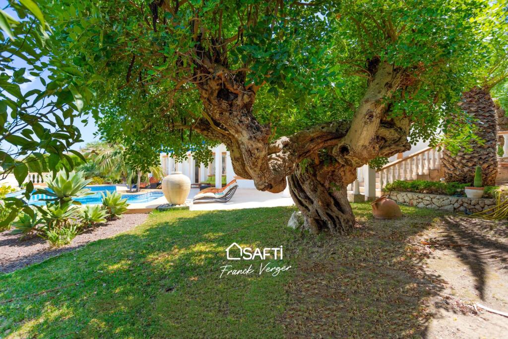 Über die Außentreppe gelangen Sie in einen prachtvollen, baumbestandenen Garten, der zu den sonnigen Terrassen führt, die eine luxuriöse, türkisfarbene Poollandschaft umrahmen, ergänzt durch eine Palette, die den Bereich noch weiter verschönert. Diese einladenden Terrassen bieten einen atemberaubenden Ausblick auf die mediterrane Landschaft, eine Außendusche sowie eine separate Toilette.