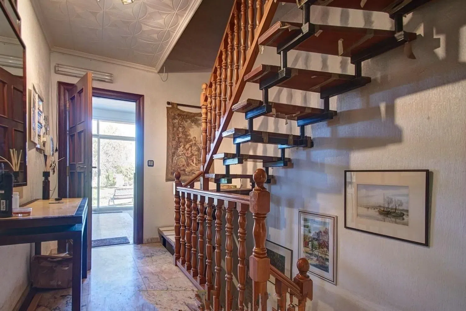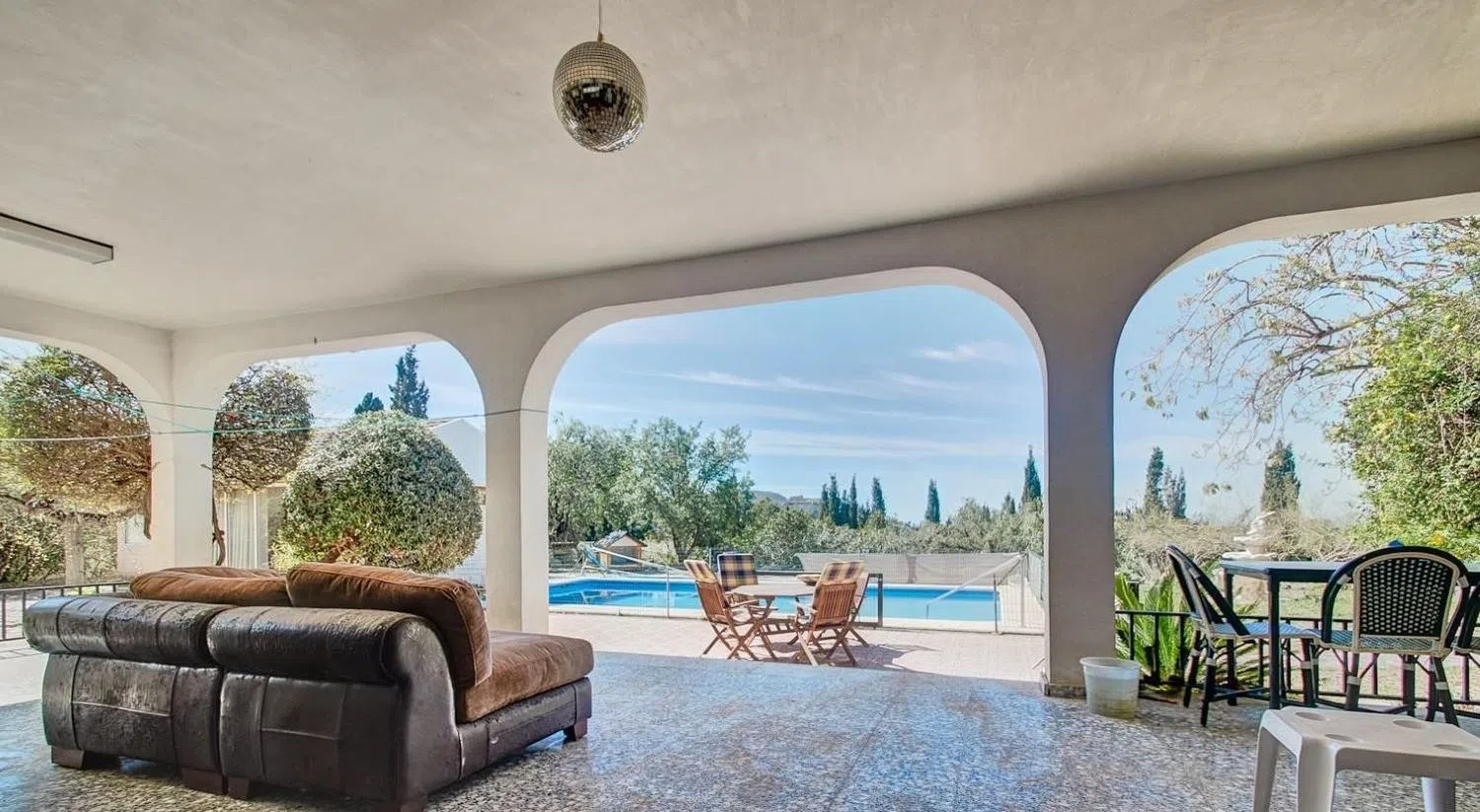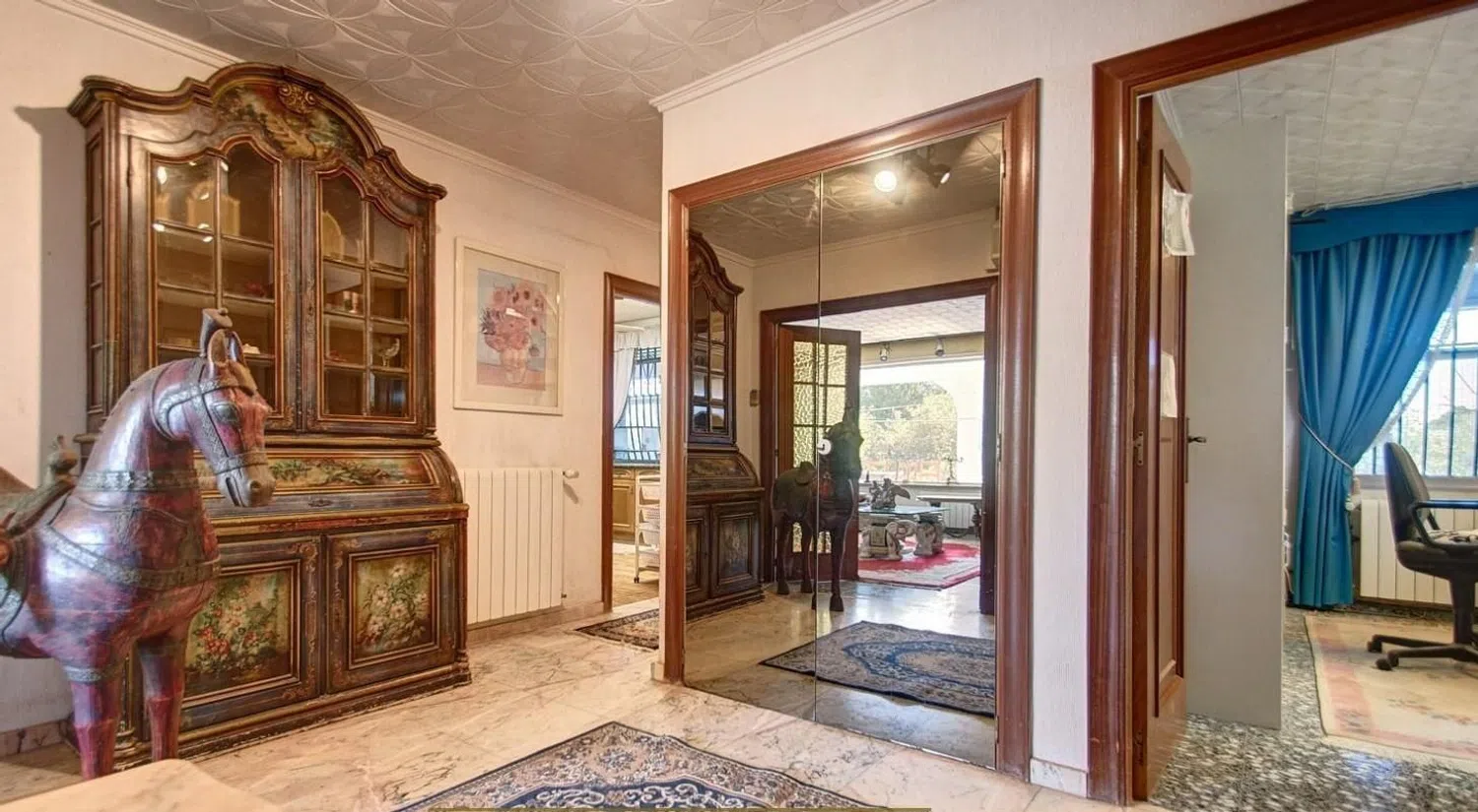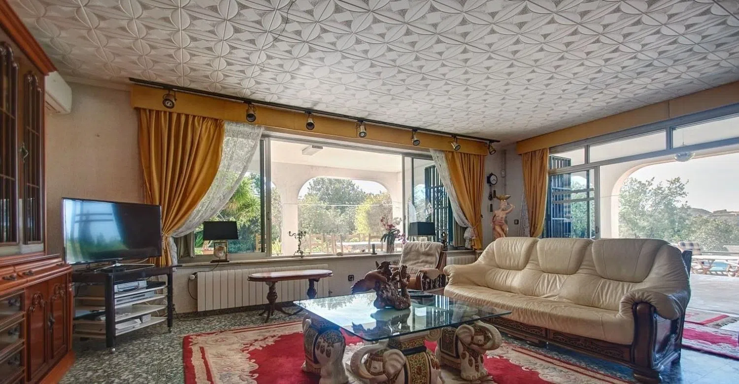 Eingebettet in die Natur, genießen Sie die atemberaubende Schönheit der Umgebung mit unhinterbrochenen Blicke auf die Berge und eine friedliche Atmosphäre. Das großzügige Anwesen mit einem charmanten Garten und einem geräumigen privaten Pool lädt zur Erkundung ein. Mit insgesamt drei Etagen eröffnet das Haus zahlreiche Möglichkeiten, darunter bis zu sieben Schlafzimmer, zwei Badezimmer, eine Bibliothek und ein Fitnessraum mit Blick auf den 10x5 Meter großen Pool.