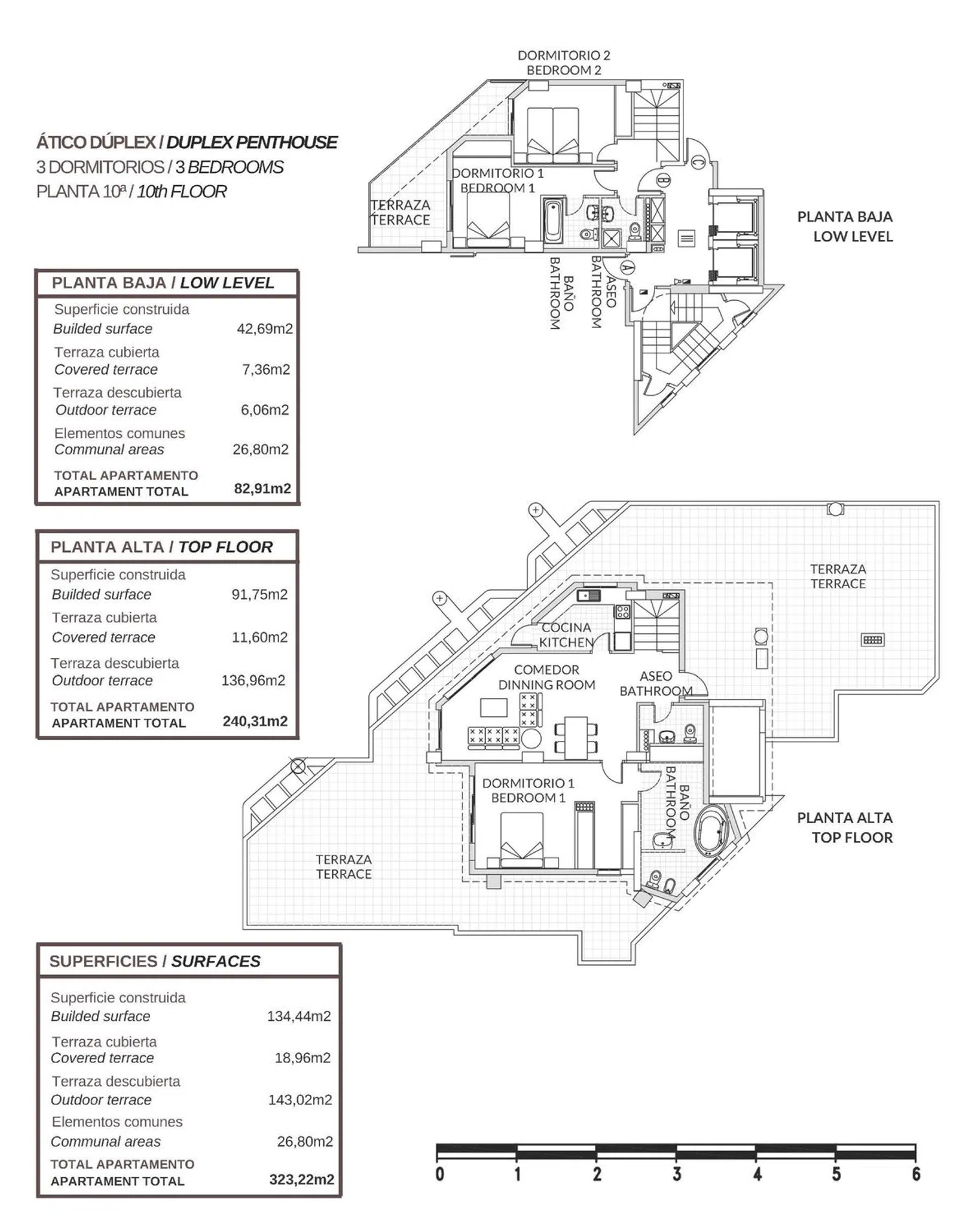 Beim Betreten der Wohnung finden Sie im Untergeschoss einen einladenden Eingang, zwei geräumige Schlafzimmer mit Zugang zu einer gemeinsamen Terrasse sowie zwei voll ausgestattete Badezimmer, von denen eines en Suite ist. Im Obergeschoss erwartet Sie ein großes Hauptschlafzimmer mit eigenem Badezimmer, ein weitläufiges Wohnzimmer mit Essbereich, eine voll ausgestattete unabhängige Küche und ein Gäste-WC. Alle Zimmer bieten Zugang zur Sonnenterrasse.