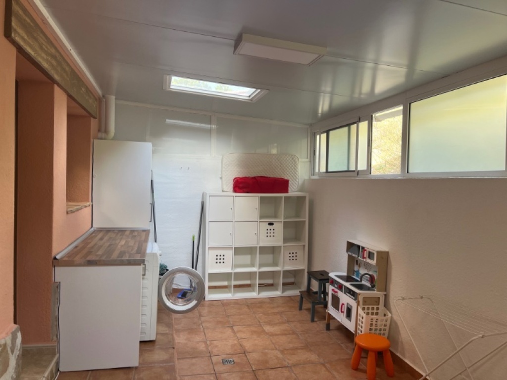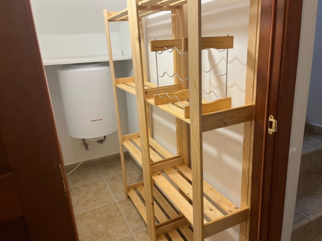 Der Charme setzt sich im Erdgeschoss mit einem hellen Wohnzimmer fort, das zur Entspannung einlädt, und einem praktischen Vorratsraum/Waschraum, der genügend Platz für deine täglichen Bedürfnisse bietet, einschließlich Schränken und Fläche zum Wäschetrocknen. Zudem entdeckst du unter der Treppe einen handlichen Abstellraum mit Regalen und einem elektrischen Warmwasserbereiter.