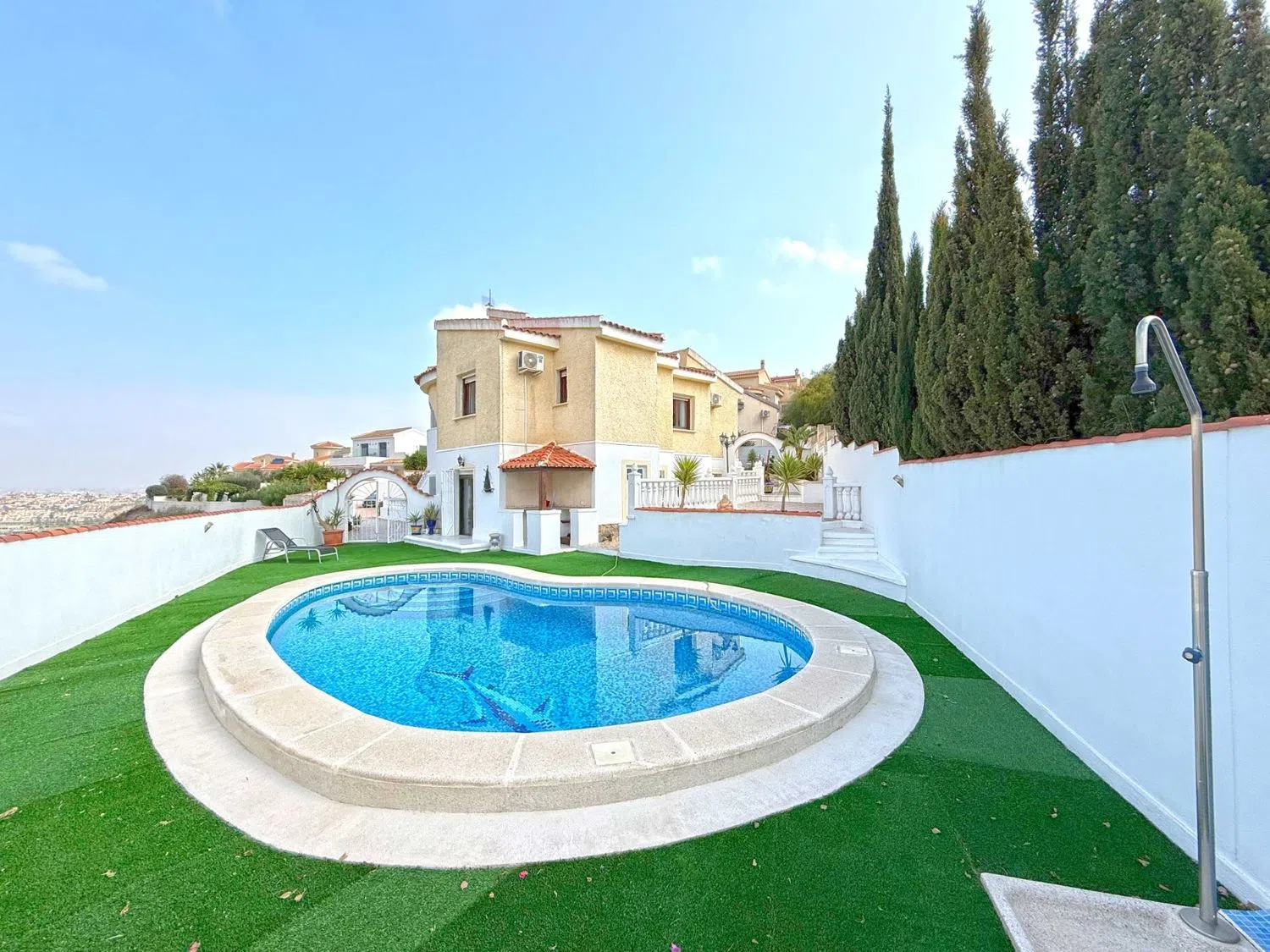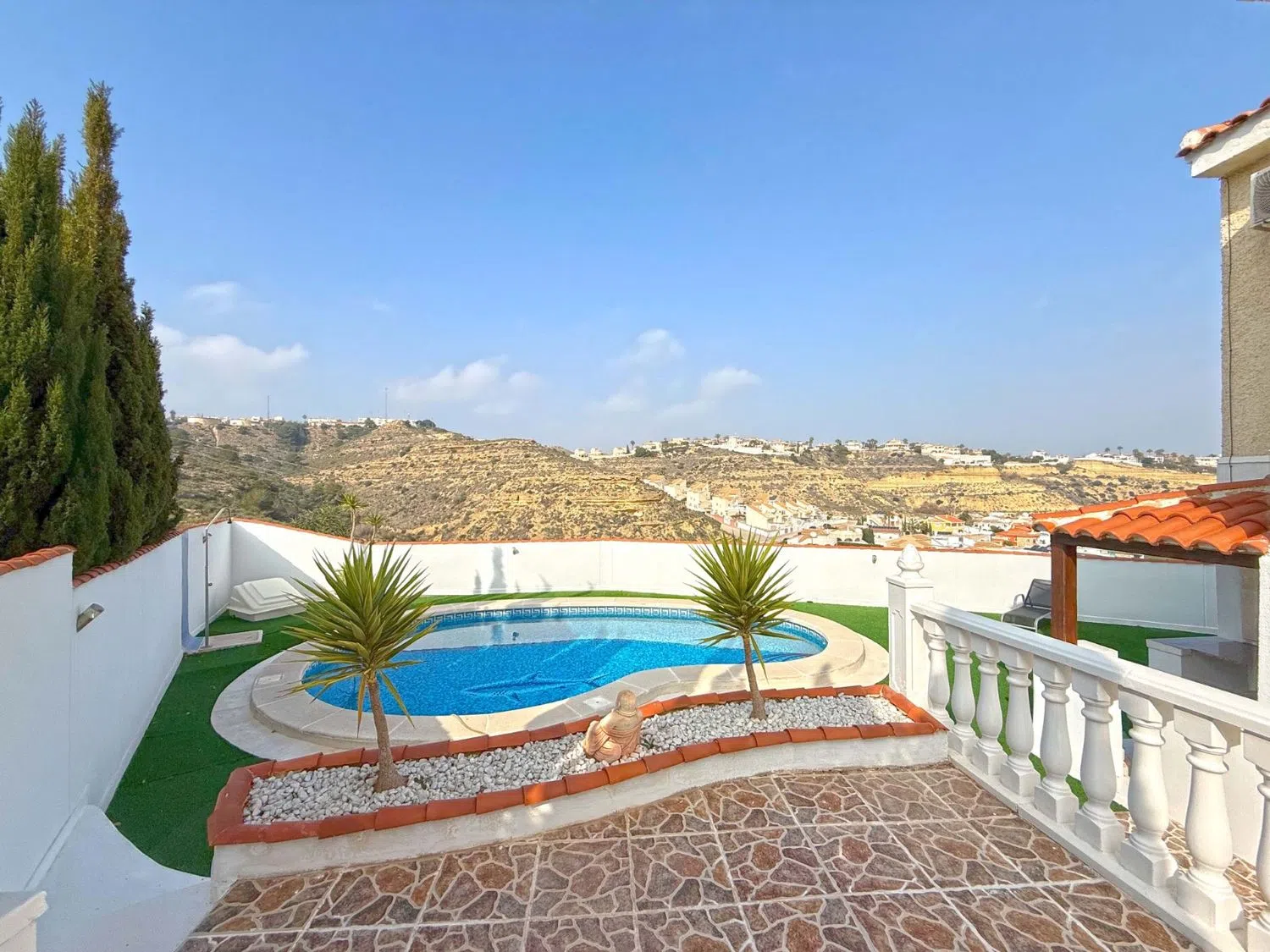 Descubra esta excepcional villa independiente en esquina, ubicada al final de una tranquila calle sin salida en la codiciada zona de Ciudad Quesada. Esta espaciosa y cuidada propiedad ofrece la combinación perfecta de privacidad, comodidad y vistas impresionantes al campo de golf La Marquesa. Situada en una amplia parcela, esta villa cuenta con 5 dormitorios y 3 baños, lo que la convierte en una opción ideal para familias numerosas o para recibir invitados. La planta principal dispone de un luminoso y acogedor salón, una cocina independiente totalmente equipada y un encantador comedor, diseñados para ofrecer el máximo confort y funcionalidad. En el exterior, encontrará su propio paraíso privado, con una piscina privada y varias terrazas donde podrá relajarse y disfrutar del sol mediterráneo. Tanto si disfruta de un café por la mañana como si organiza reuniones con amigos por la tarde, las vistas panorámicas al campo de golf ofrecen un entorno incomparable. Características adicionales: Aire acondicionado en toda la vivienda para su confort durante todo el añoGaraje privado y espacio de estacionamiento para varios vehículosAmplio espacio de almacenamiento y zonas exteriores versátiles para comer y relajarse Ubicada cerca de servicios locales, restaurantes y a poca distancia en coche de las hermosas playas de la Costa Blanca, esta villa ofrece un estilo de vida lujoso en una de las zonas más deseadas de Ciudad Quesada. Su hogar mediterráneo de ensueño le espera: ¡Contacte con nosotros hoy mismo para concertar una visita!