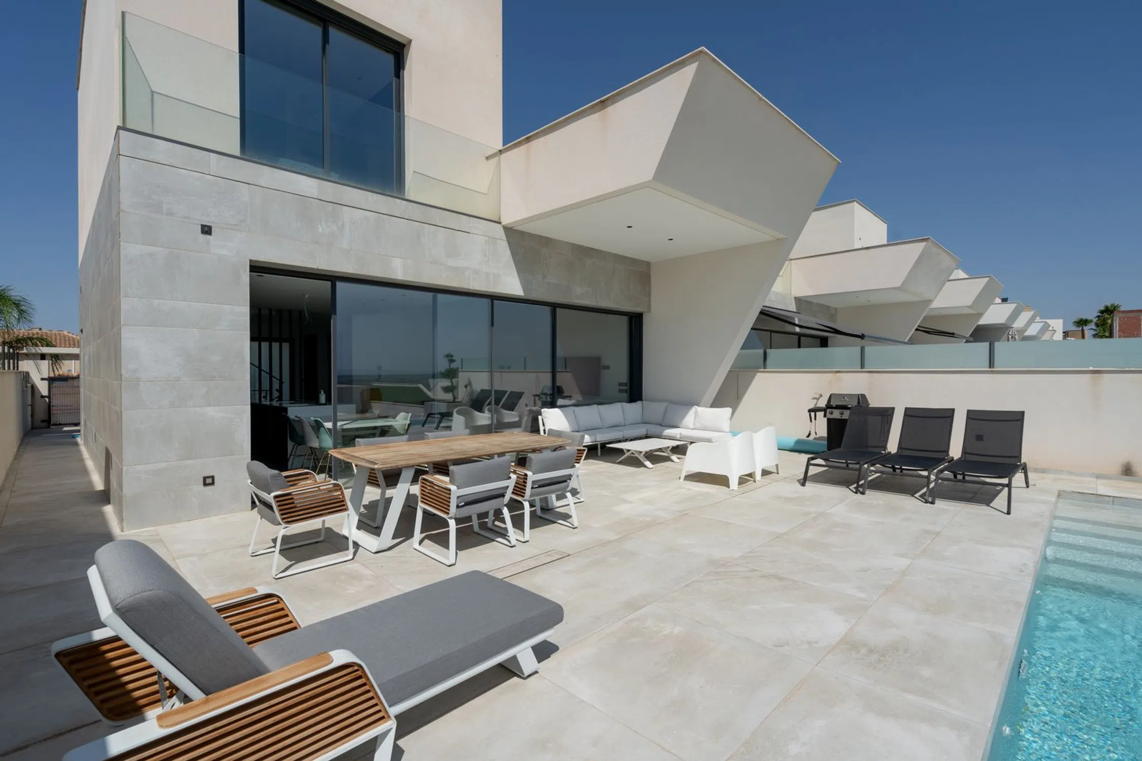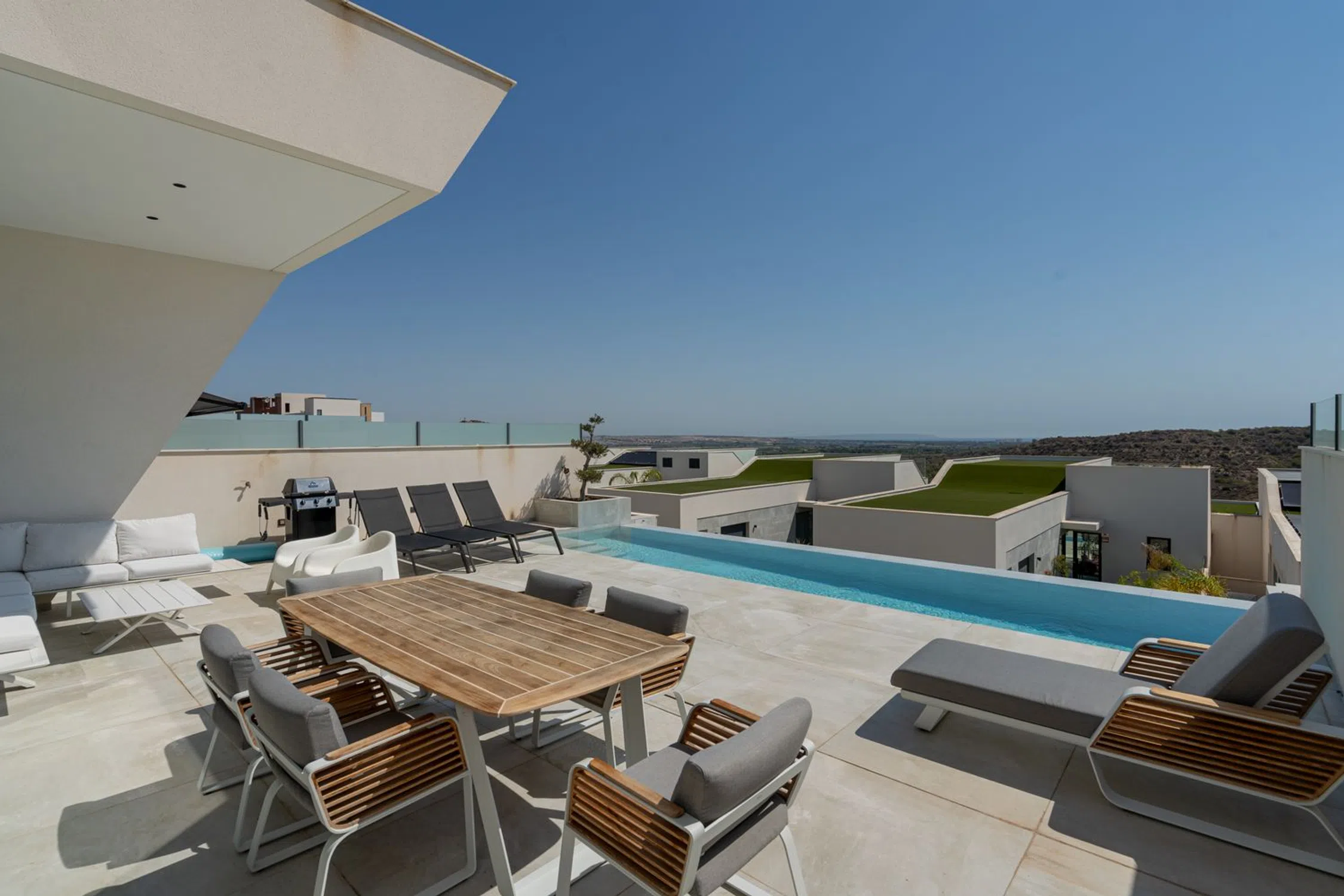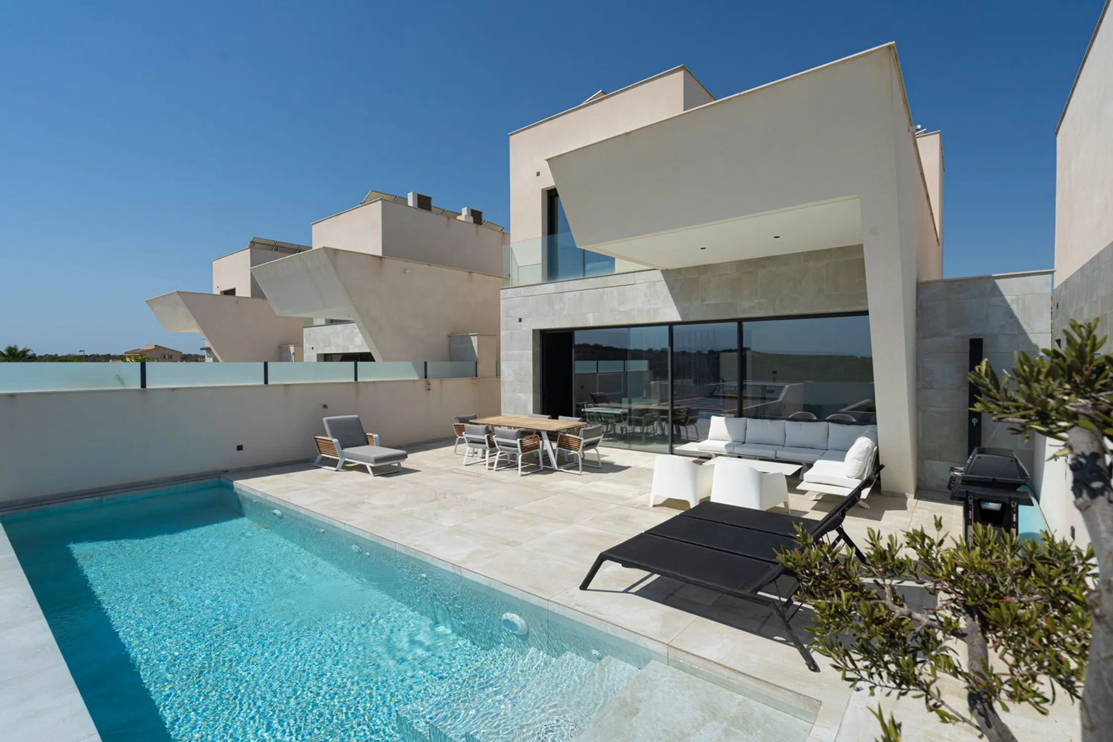 En SkandiaMäklarna, Torrevieja, nos complace dar la bienvenida a esta amplia y maravillosa villa en la codiciada urbanización Residencial Oceanic, justo encima del campo de golf La Marquesa en Ciudad Quesada. La villa consta de tres plantas. En la planta de entrada se encuentra un amplio salón con cocina abierta, un dormitorio con baño en suite, un recibidor y un aseo de invitados. Desde el salón se puede disfrutar de una vista panorámica a la preciosa parcela, donde encontrará amplias zonas de socialización y una piscina infinita. En la parte delantera hay espacio para aparcar el coche y un frondoso patio. Subiendo por una escalera, se encuentran dos dormitorios, cada uno con su propio baño en suite. Desde uno de los dormitorios también hay un balcón. Bajando por una escalera se accede al amplio sótano. Aquí se encuentran un lavadero, un garaje, un dormitorio con baño en suite, un amplio salón con sauna, otro baño y un patio. La casa se terminó de construir en 2020, por lo que se encuentra prácticamente nueva, con un estilo moderno, lujoso y agradable. Ciudad Quesada es una zona con mucha gente y actividad durante todo el año. Dispone de una amplia gama de restaurantes, bares, tiendas y todos los servicios que necesita durante su estancia. Hay opciones de entretenimiento como minigolf, golf, bolos, rutas de senderismo, parque acuático, etc. ¡Quesada es una zona con opciones para todas las edades! También hay un colegio noruego. En 10 minutos en coche se puede llegar a varias playas y a las ciudades de Torrevieja y Guardamar. Desde la casa se puede ir andando a uno de los mejores parques de la zona y también al campo de golf de La Marquesas. Si busca un alojamiento lujoso y espacioso, ha encontrado el lugar ideal. Bienvenido a casa.