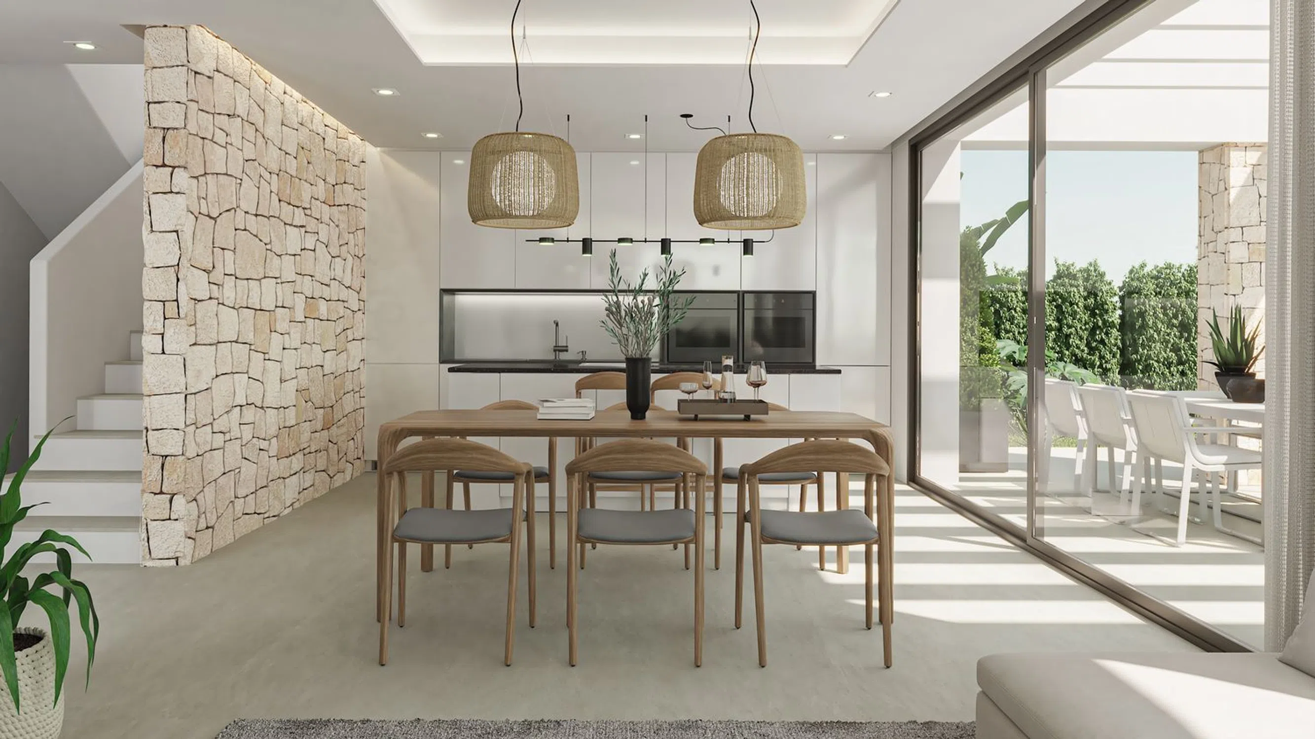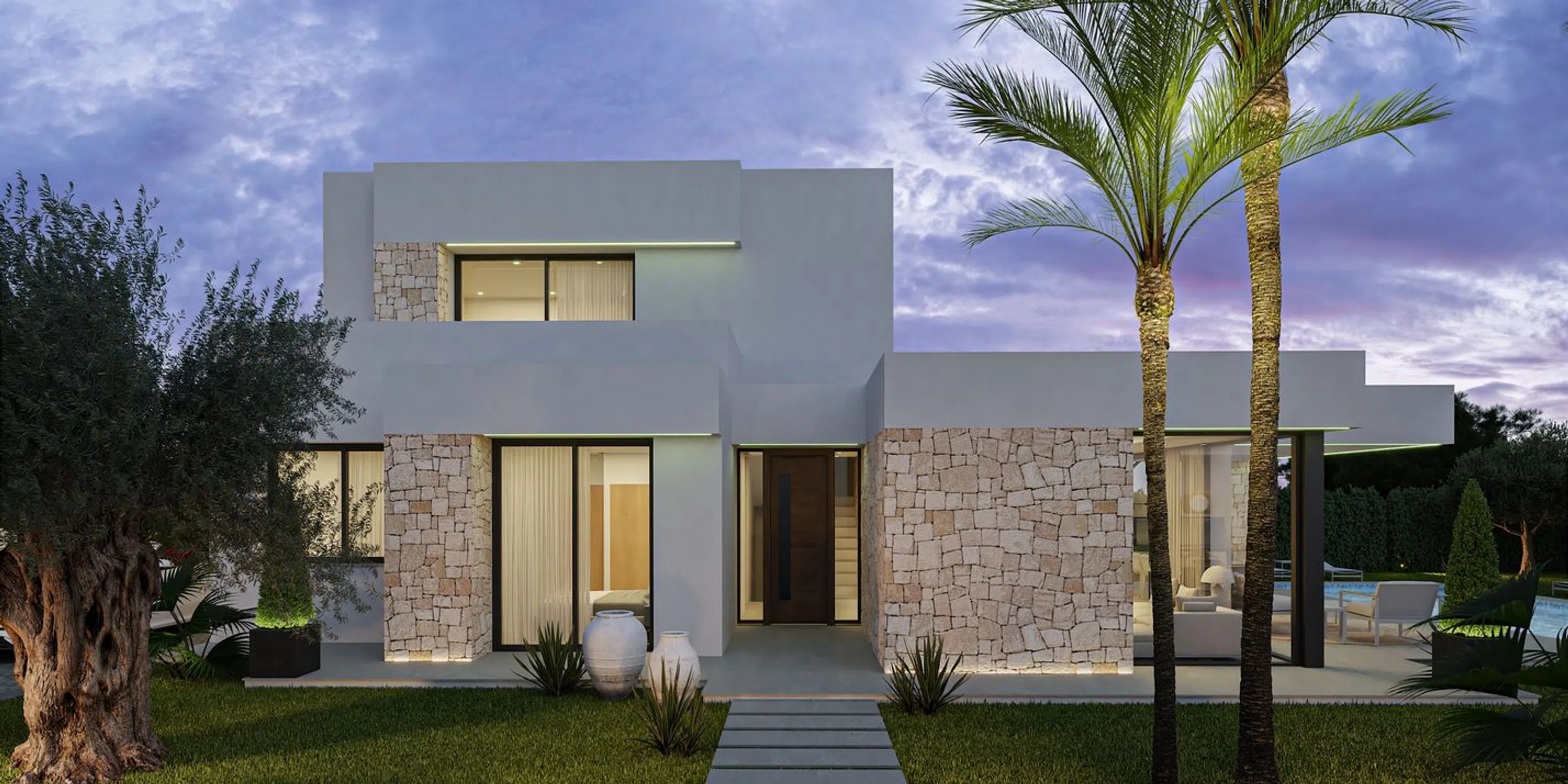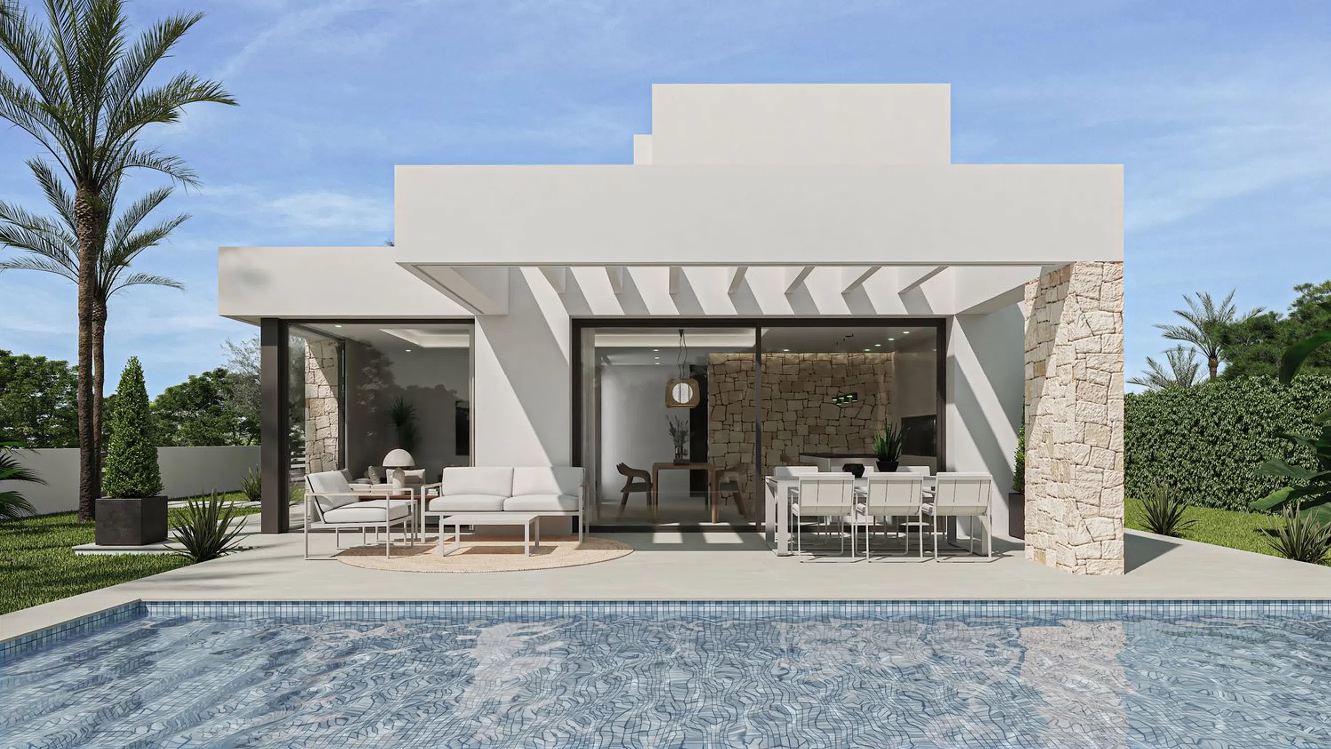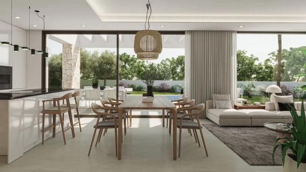 Villa Alborcer – Villa de obra nueva con piscina privada y 4 dormitorios en una de las mejores zonas residenciales de Dénia Villa Alborcer es una elegante vivienda unifamiliar de obra nueva situada en una zona residencial tranquila y soleada, a solo cinco minutos del centro de Dénia y sus playas. Su arquitectura contemporánea combina líneas limpias con revestimientos en piedra natural, logrando una perfecta armonía con el entorno y una excelente luminosidad durante todo el año. La vivienda se distribuye en tres plantas. En la planta baja se ubican dos dormitorios, un baño completo y un aseo de cortesía, además de una amplia zona de salón-comedor con cocina integrada en concepto abierto, que se conecta directamente con el jardín y la piscina. En la planta superior se encuentra el dormitorio principal, con baño en suite, vestidor y una terraza privada ideal para disfrutar del sol y las vistas. En la planta semisótano, iluminada por un patio inglés, se dispone un cuarto dormitorio con baño completo y espacio adicional para sala de juegos, despacho o zona de ocio. El exterior ofrece todo lo necesario para disfrutar del clima mediterráneo: piscina privada, zonas ajardinadas con vegetación autóctona (olivos, palmeras, plantas aromáticas), terraza con zona de estar, comedor exterior y pérgola para dos vehículos. La parcela está completamente vallada y goza de privacidad y buena orientación solar. Villa Alborcer es una opción ideal tanto como residencia habitual como para segunda vivienda, gracias a su ubicación estratégica, su diseño de calidad y su distribución funcional. Una casa lista para entrar a vivir en una de las zonas más demandadas de la Costa Blanca.