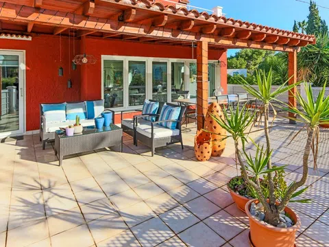 RANDOF Real Estate con oficinas ubicadas en Dénia, Jávea y Moraira le ofrece esta Increíble villa de lujo en Las Rotas, a pocos pasos del mar cerca de La Marienta Casiana. Con una parcela completamente vallada y plana de 2.950 m², esta propiedad está rodeada de exuberante vegetación, impresionantes palmeras y plataneros, bellos jardines y detalles que te enamorarán. La villa cuenta con una piscina de 14x7 m, un baño exterior, varias terrazas con diferentes orientaciones para disfrutar del sol o la sombra según el momento del día, una zona de barbacoa y un área chill out cubierta ideal para relajarse. Además, dispone de un garaje privado con espacio para varios coches, trastero, y una amplia zona de aparcamiento para tus invitados. En la planta baja disponemos de un acogedor apartamento independiente, perfecto para familiares o amigos, que incluye un salón, cocina con despensa y salida a una terraza, dos dormitorios y un baño completo. En la planta principal, se encuentra el corazón de la vivienda: un amplio salón-comedor rodeado de ventanales que inundan el espacio de luz natural y una chimenea que aporta calidez. Este espacio tiene acceso directo a una gran terraza que rodea todo el salón, ofreciendo vistas espectaculares a la montaña y un amplio espacio para disfrutar de comidas al aire libre con la familia y amigos. Además, también encontraremos una cocina independiente con despensa, totalmente equipada, cuatro dormitorios dobles con armarios empotrados, un baño completo y un aseo de cortesía (una de las habitaciones tiene salida a otras terrazas con vistas a la montaña y la piscina). En la segunda planta, la joya de la villa: la suite principal. Este espacio exclusivo incluye un dormitorio con baño en suite, un vestidor hecho a medida y acceso a dos terrazas privadas que ofrecen tranquilidad y bonitas vistas. La propiedad cuenta con materiales de alta calidad: ventanas de PVC aislantes de ruido y temperatura, radiadores, aire acondicionado frío-calor, una chimenea funcional, un pozo de agua propio, y detalles pensados para maximizar la privacidad y la luz natural en cada rincón. Esta villa es el refugio perfecto para quienes buscan exclusividad, confort y proximidad al mar. ¡No dejes pasar esta oportunidad única y ven a visitarla! [IW].