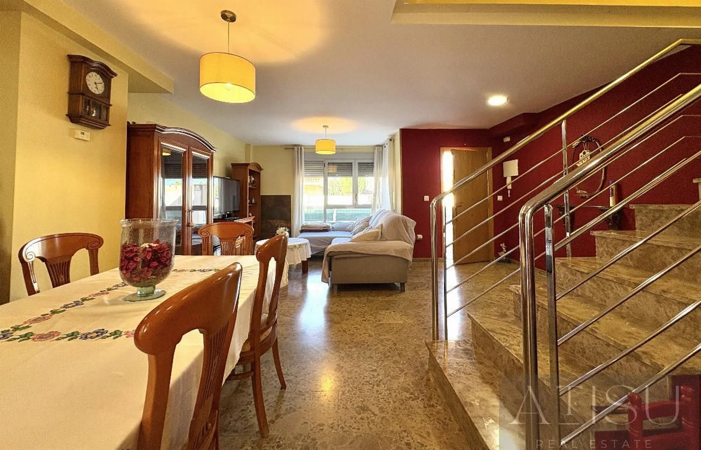 VENTA - Precioso Adosado en Venta en El Campello - Espacio, Confort y Ubicación Ideal Presentamos esta magnífica propiedad adosada de cuatro alturas, ubicada en una zona residencial tranquila y bien comunicada de El Campello. Un hogar ideal para familias que valoran el confort, la amplitud y la cercanía a todos los servicios: colegios, centros comerciales, zonas verdes, transporte público, a tan solo 1,5 km de la playa y a escasos minutos del centro urbano. Con una superficie construida de 229 m², esta vivienda se encuentra en excelente estado de conservación y lista para entrar a vivir. Su distribución es funcional y equilibrada, maximizando el aprovechamiento del espacio y la entrada de luz natural. Al ingresar a la vivienda, nos recibe un hall distribuidor que da paso a un amplio salón-comedor de más de 35 m², con acceso directo a una agradable terraza delantera, perfecta como zona de comedor exterior o de descanso. En esta misma planta se sitúa la cocina independiente totalmente equipada, con pasaplatos y salida a una segunda terraza trasera con galería, además de un aseo de cortesía que aporta funcionalidad a la planta principal. En la primera planta se ubica el dormitorio principal con baño en suite, así como dos habitaciones adicionales, ambas luminosas y con armarios empotrados. Estas comparten un baño completo. La última planta o planta torreón está dedicada al solárium y cuenta con dos terrazas privadas, una orientada al norte con vistas a la montaña y otra al sur con vistas al mar, proporcionando un espacio versátil y agradable para disfrutar del exterior durante todo el año. En el sótano, la propiedad dispone de un garaje cerrado con capacidad para dos vehículos, además de un trastero de gran utilidad. Construida en 2008, esta vivienda cuenta con materiales de alta calidad: suelos de mármol, carpintería interior de roble, cerramientos de PVC y mosquiteras en todas las ventanas. Dispone además de aire acondicionado por conductos en las estancias principales y calefacción individual. Forma parte de una urbanización privada con piscina comunitaria, ideal para familias con niños. En definitiva, se trata de una vivienda completa, funcional y perfectamente ubicada, que combina calidad de vida, comodidad y proximidad al mar. DETALLES DE CALIDAD Y CNFORT: - Suelos de mármol - Carpintería interior en roble - Cerramientos exteriores en PVC - Mosquiteras en todas las habitaciones y puertas - Armarios empotrados - Aire acondicionado por conductos en todas las estancias principales - Calefacción individual - Piscina comunitaria - Vivienda construida en 2008. Orientación completa: norte y sur UBICACIÓN ESTRATÉGICA: La zona ofrece una excelente conexión con el transporte público, incluyendo tranvía y líneas de autobús, así como acceso rápido a la carretera nacional y a la autovía. Se encuentra próxima a centros educativos, supermercados, centros comerciales, instalaciones deportivas y zonas verdes, lo que garantiza una vida cómoda y funcional durante todo el año. Situado a pocos minutos del centro de El Campello y de sus playas, esta propiedad representa una excelente oportunidad de inversión o residencia habitual. Un entorno familiar, seguro y bien conectado que ofrece calidad de vida durante todo el año. La información contenida en este documento es de carácter orientativo, no vinculante y carece de valor contractual.