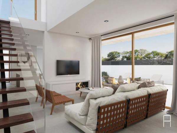 Die Villa bietet ein großzügiges Wohnzimmer mit großen Sicherheitsfenstern und direktem Zugang zum ansprechenden Garten. Die offene Küche mit zentraler Insel ist mit hochwertigen Geräten ausgestattet und lädt zum Kochen und Verweilen ein. Sie verfügt über drei Schlafzimmer, jedes mit eigenem Bad, Einbauschränken und luxuriösen Oberflächen, sowie ein zusätzliches Gäste-WC für mehr Komfort.