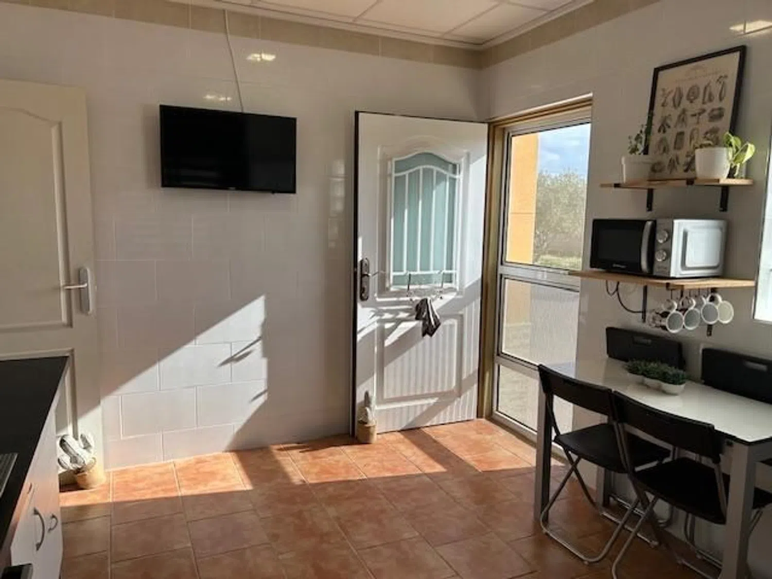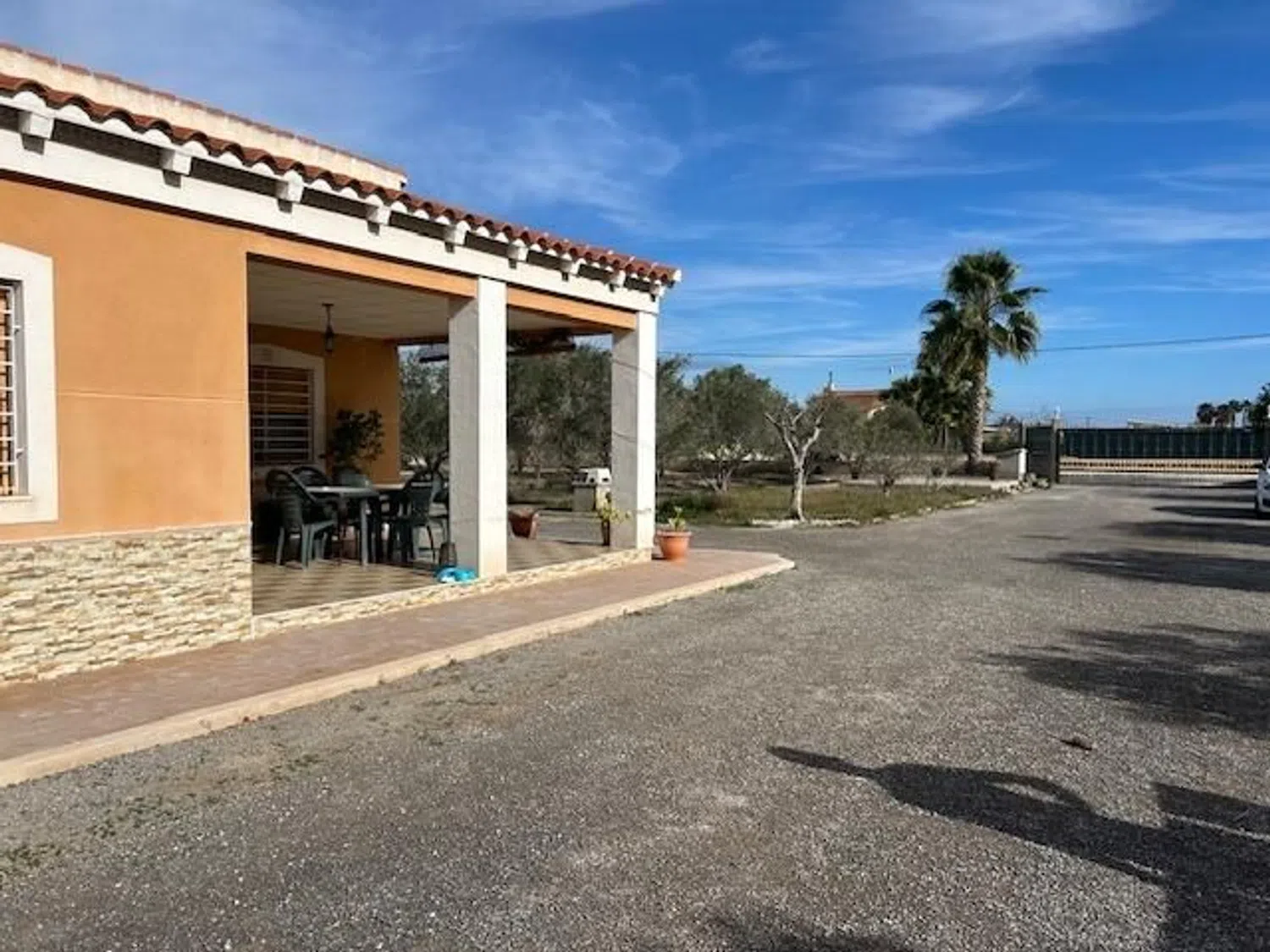 Die quadratische Küche ist geräumig und bietet direkten Zugang zum Außenbereich, während der separate Hauswirtschaftsraum zusätzliche Funktionalität bereitstellt. Für Ihre Fahrzeuge steht ein überdachter Parkplatz zur Verfügung, der Platz für bis zu drei Autos bietet.
