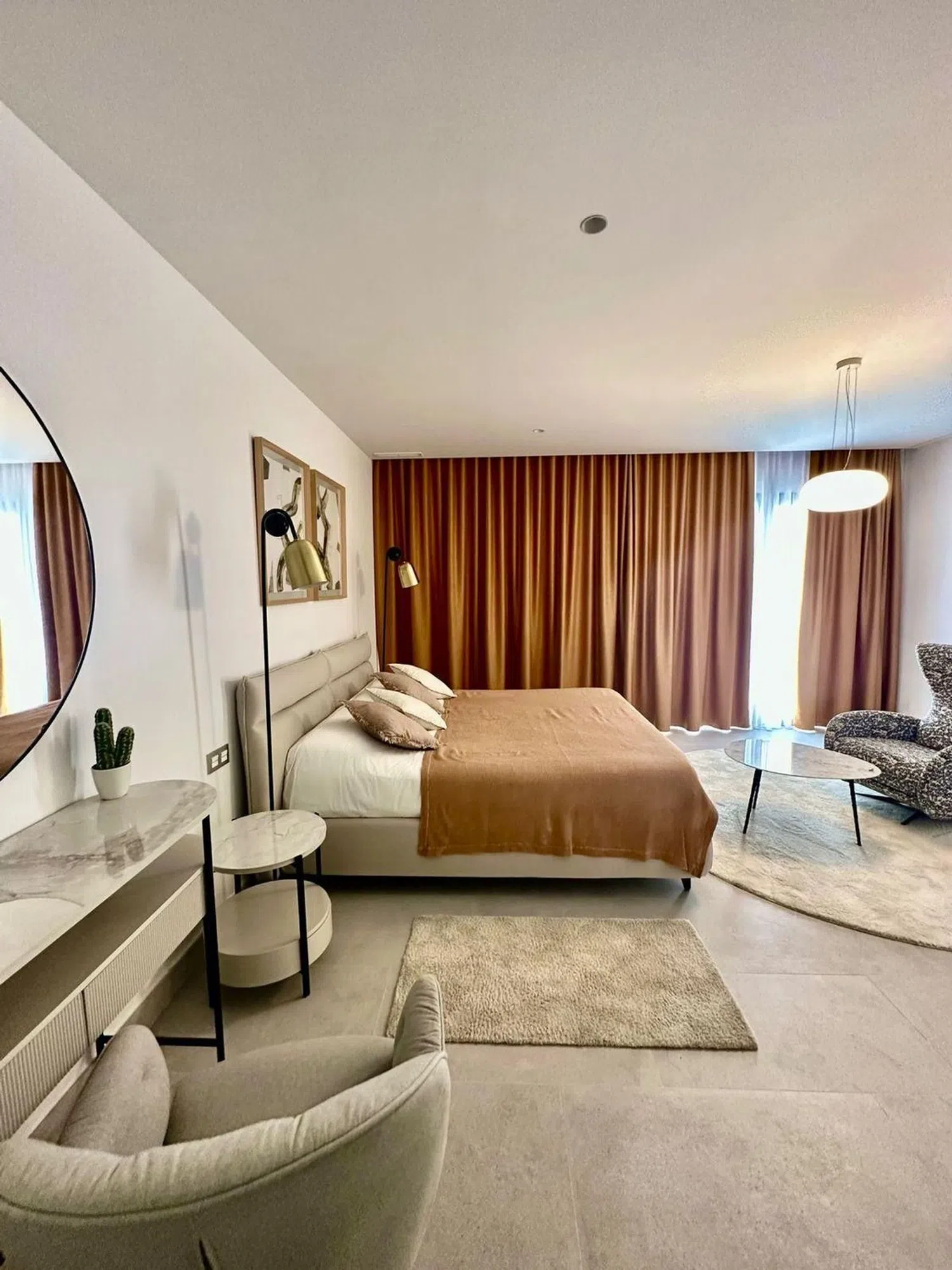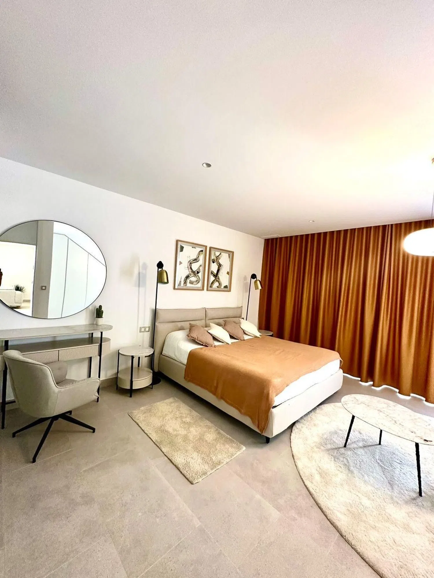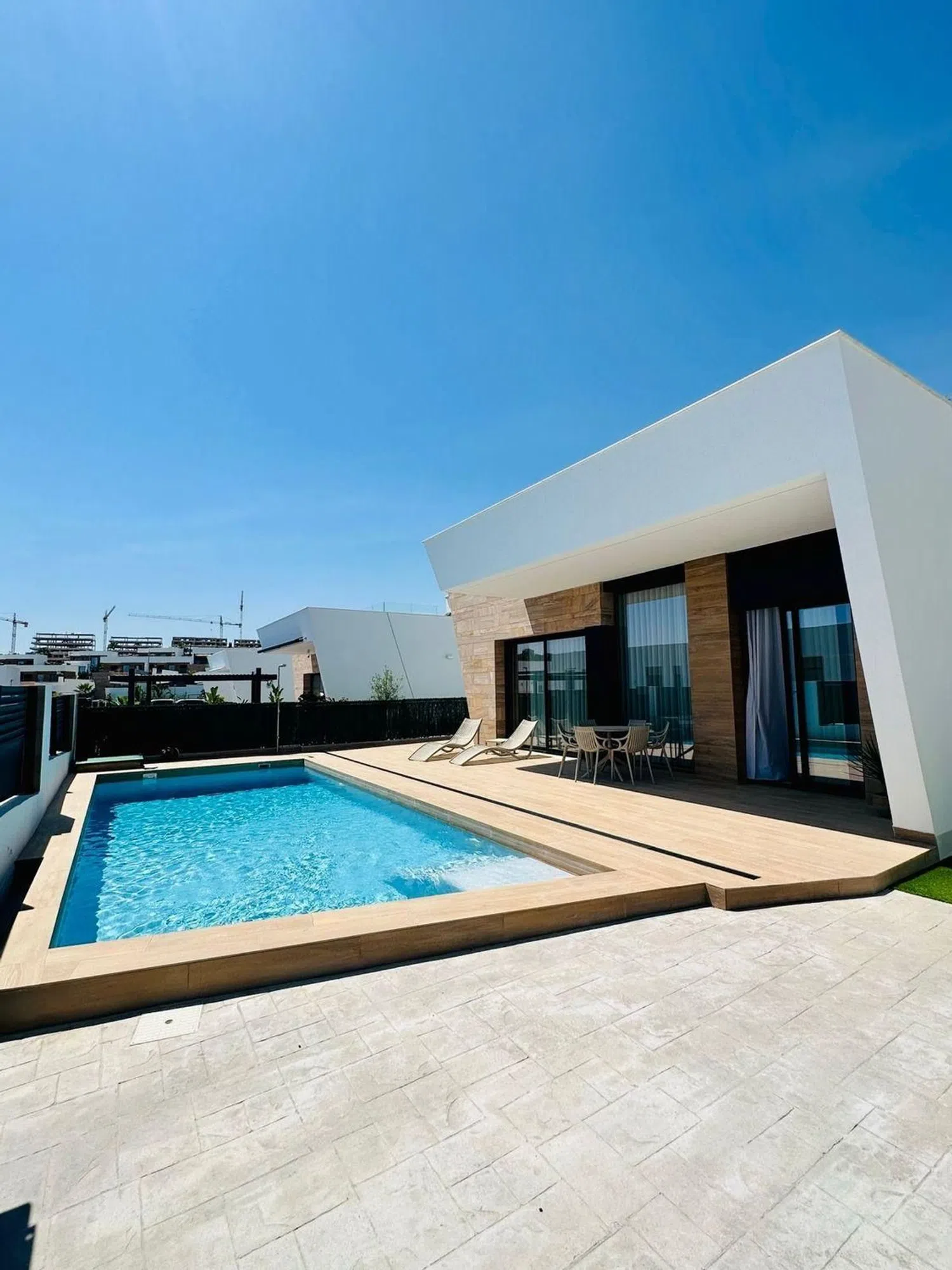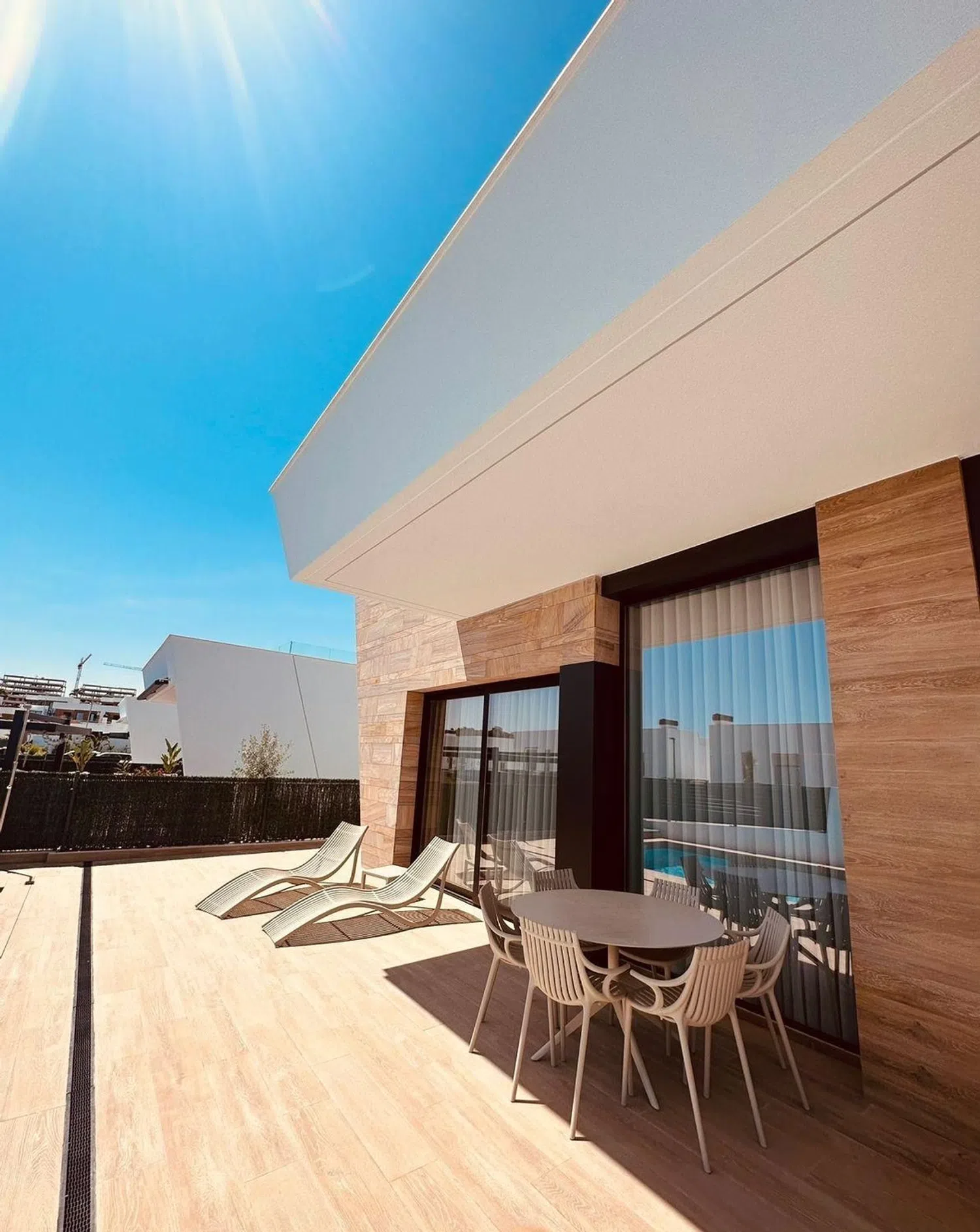 Die insgesamt fünf großzügigen Schlafzimmer und drei voll ausgestatteten Badezimmer ermöglichen komfortables Wohnen für Familien oder Gäste. Darüber hinaus sorgt die optimale Ausrichtung der Villa für lichtdurchflutete Räume und eine angenehme Atmosphäre.