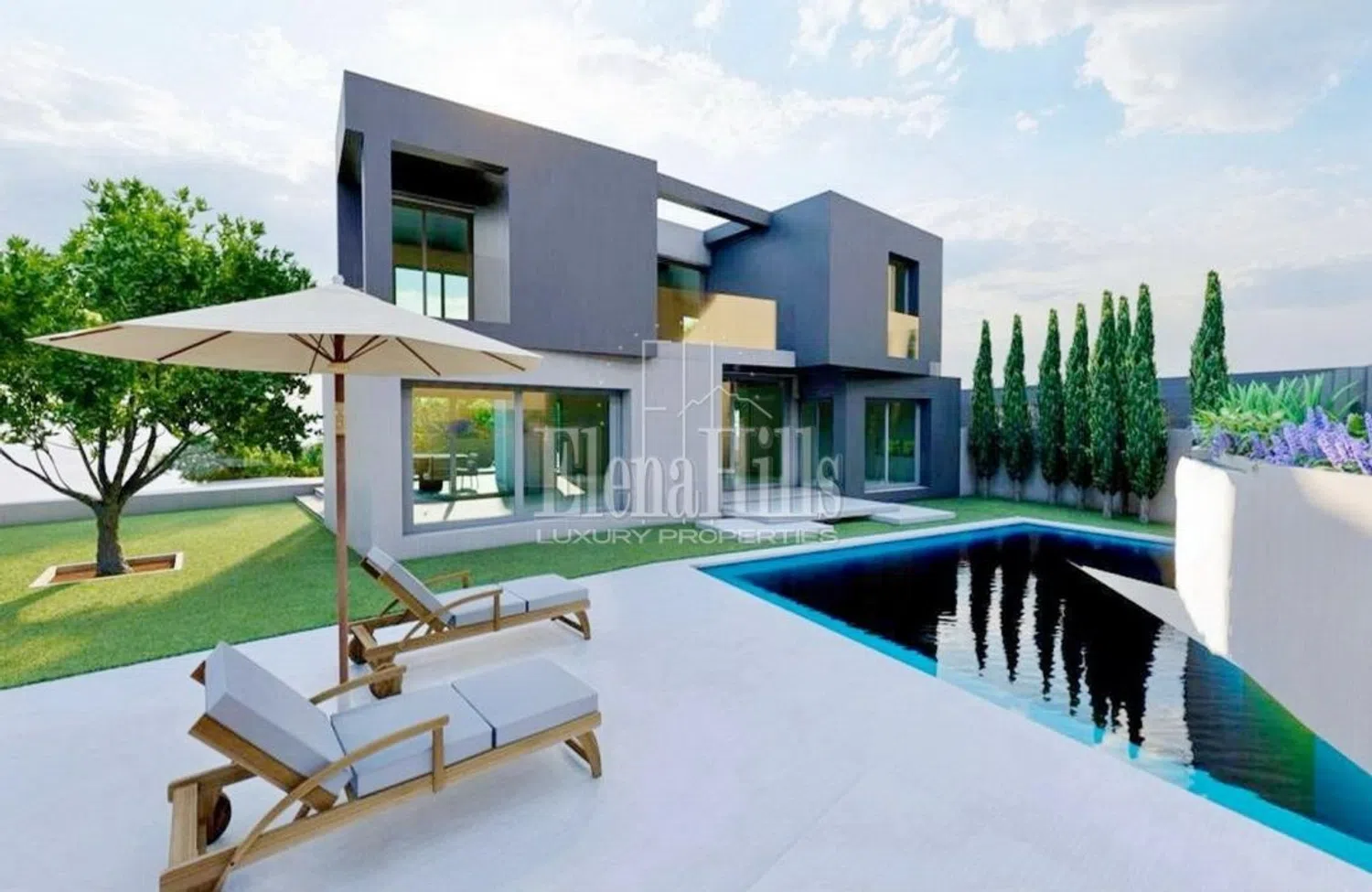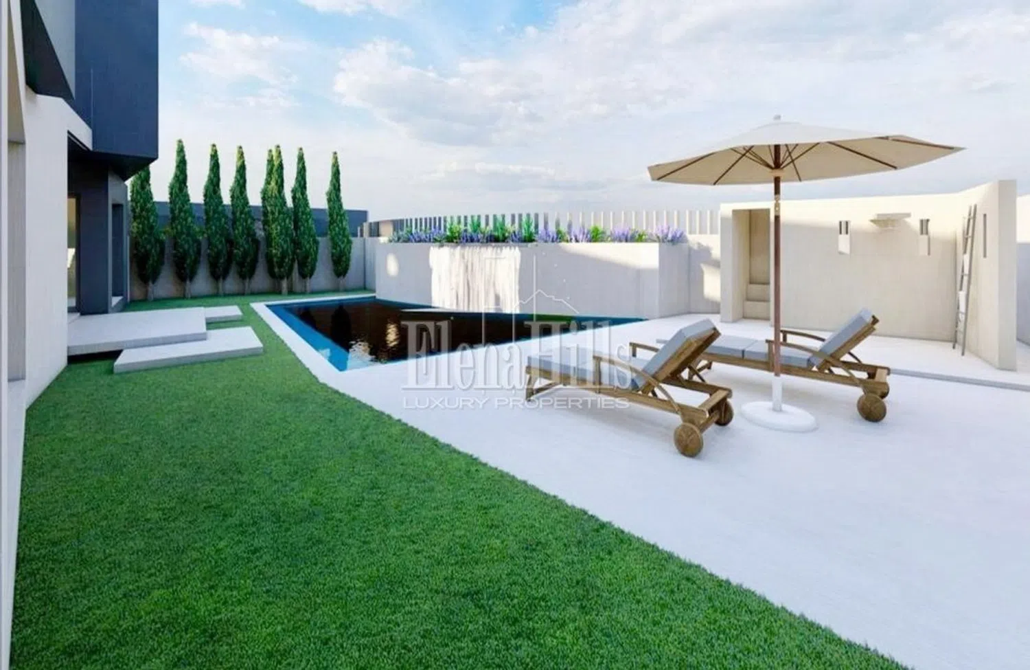 Im Außenbereich erwarten Sie ein Infinity-Pool, ein schöner Garten und Parkmöglichkeiten für zwei Fahrzeuge. Das großzügige Grundstück von etwa 665 m² bietet reichlich Platz für das Leben im Freien. Die Umgebung ist nah an sämtlichen wichtigen Dienstleistungen, einschließlich einer Bahnanbindung, Einkaufszentren, renommierten Hotels, zwei Golfplätzen, Wasserparks und den berühmten Sandstränden.