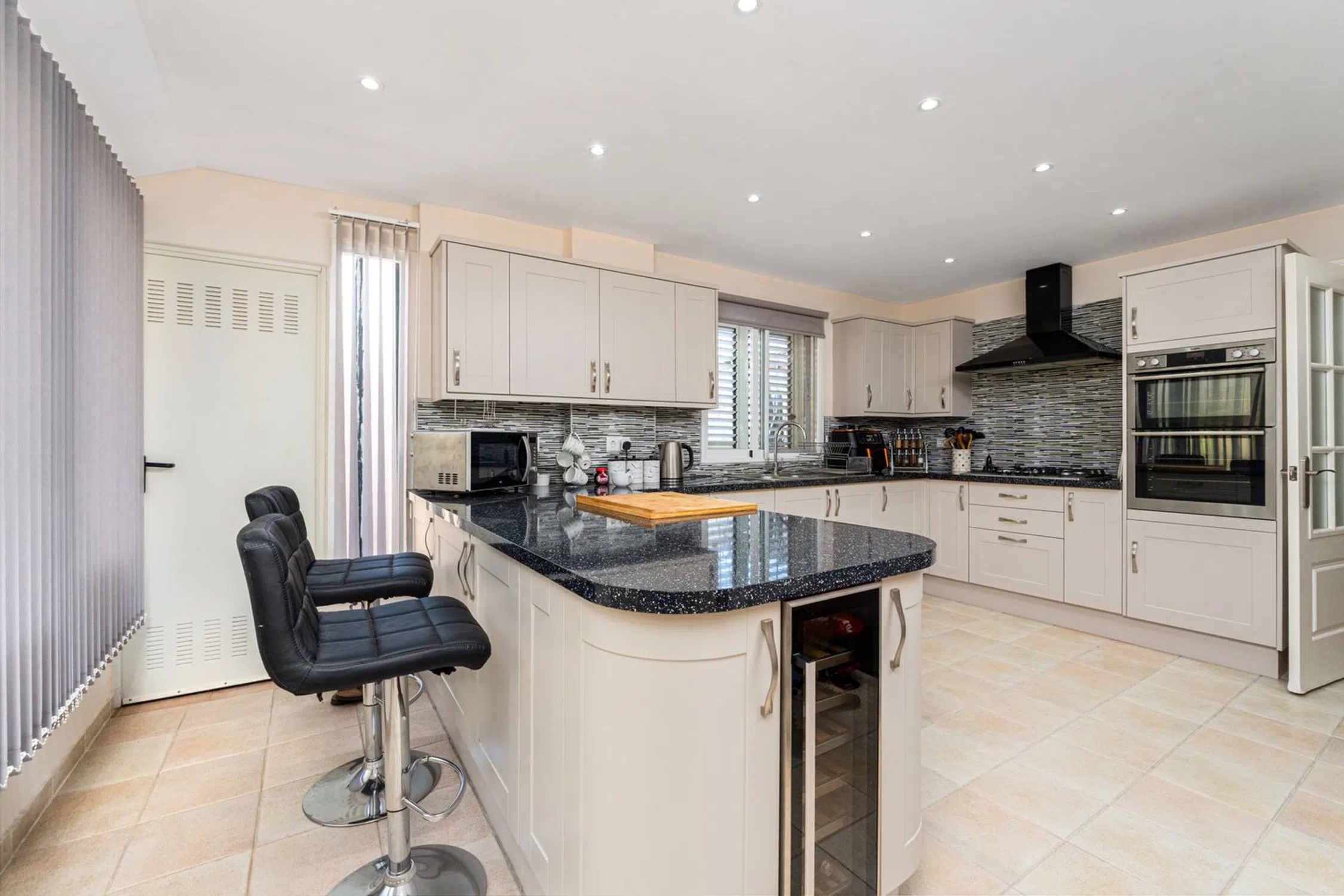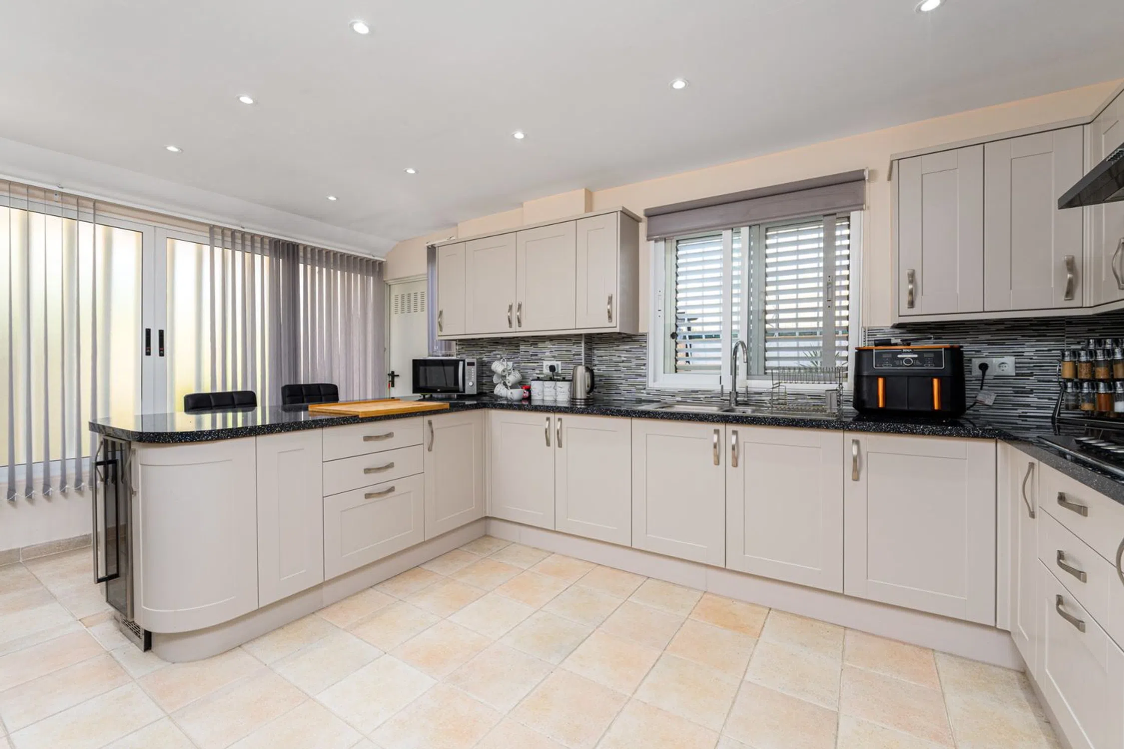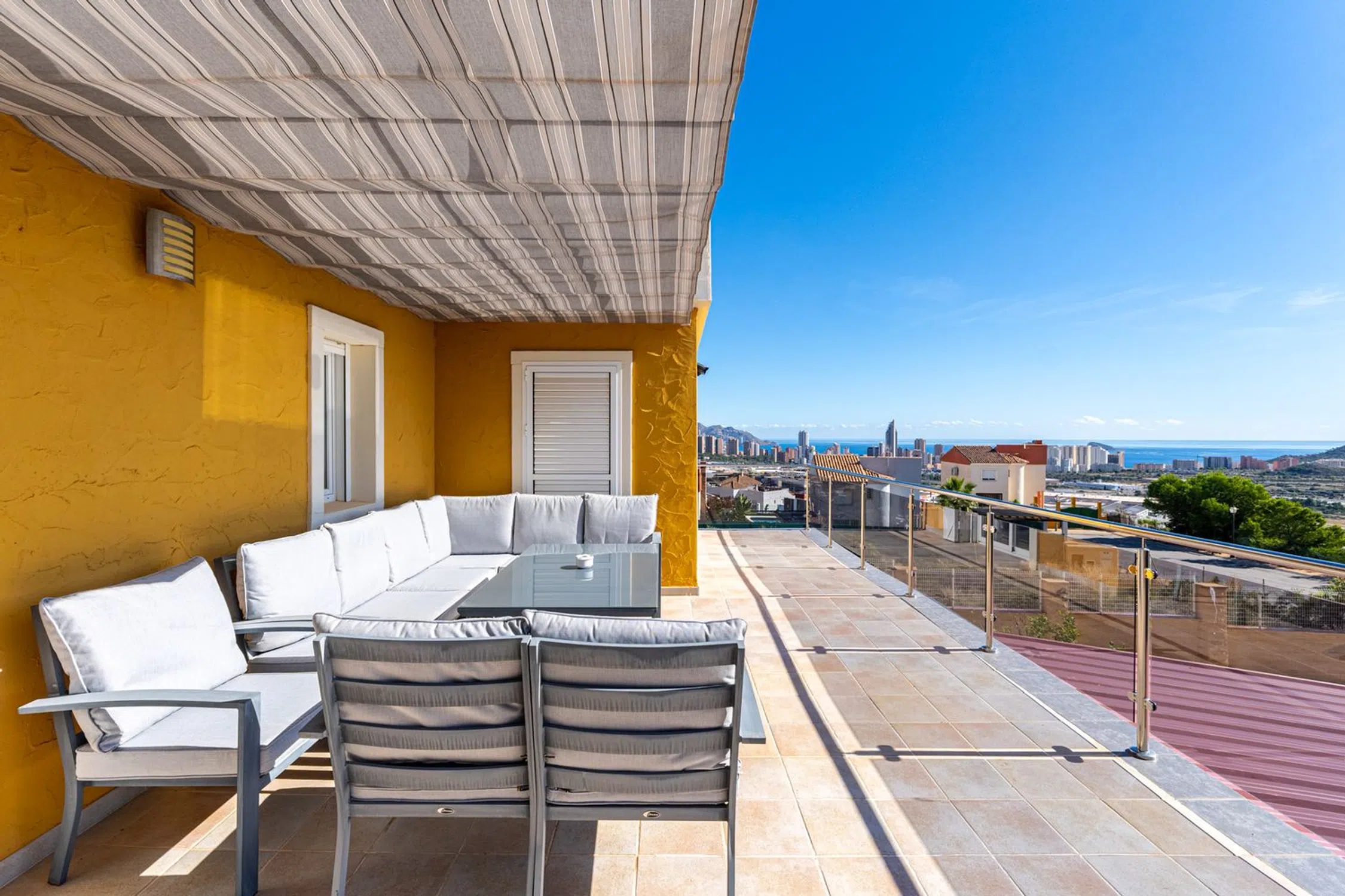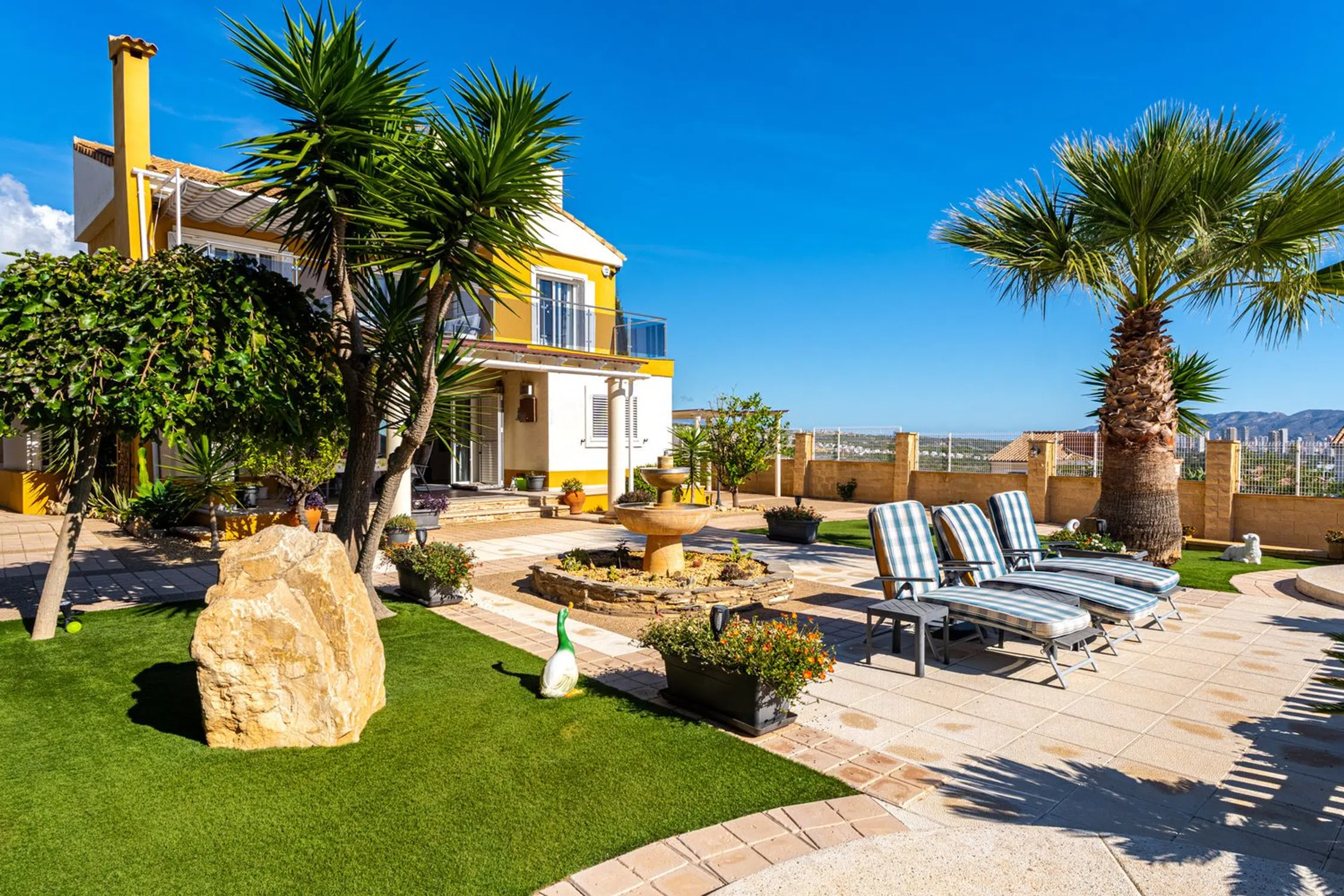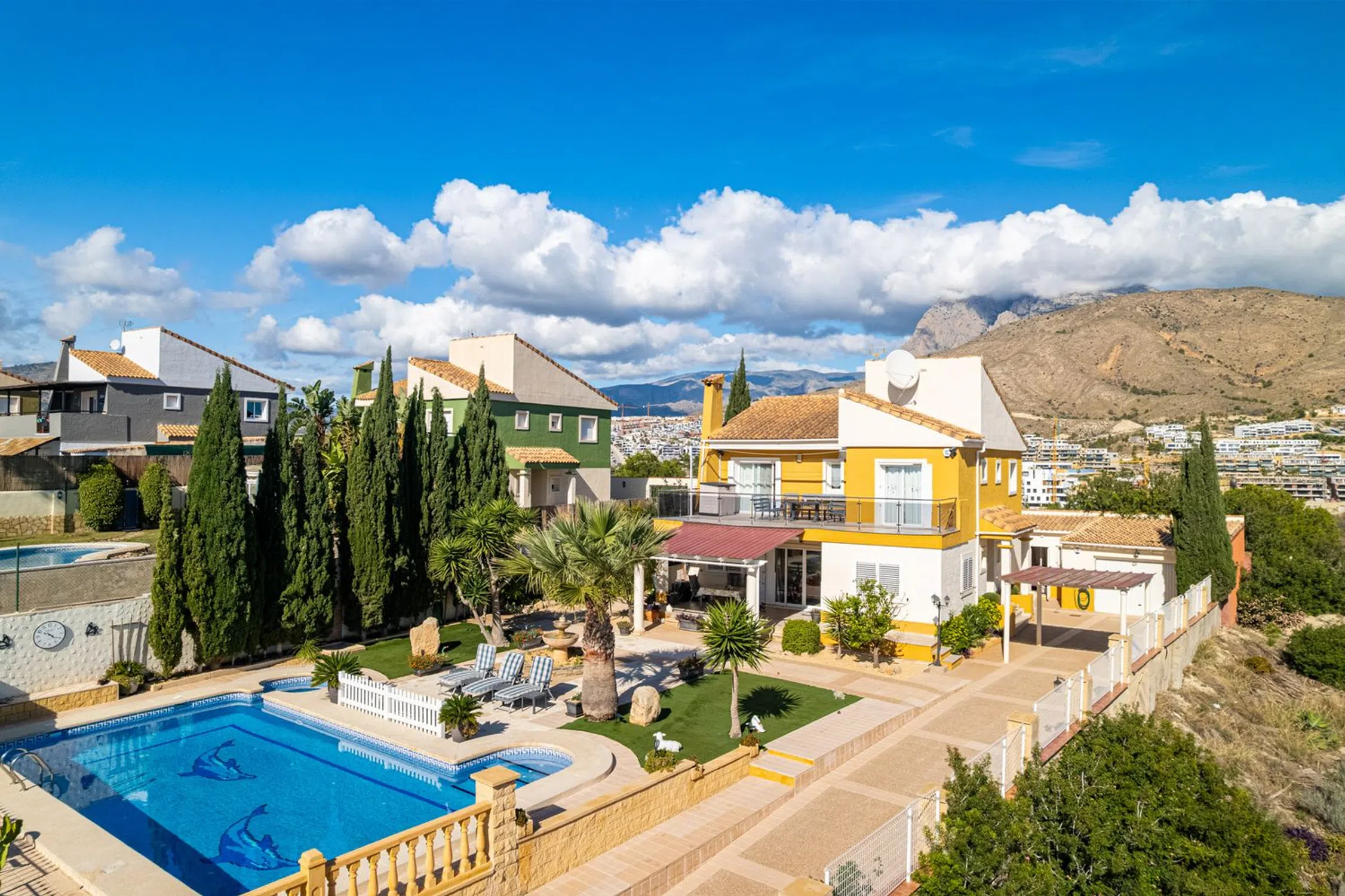 Vida de lujo mediterránea en Finestrat Nos complace presentar esta excepcional villa independiente, perfectamente situada en una tranquila zona de Finestrat, a solo momentos del renombrado centro comercial La Marina. La ubicación combina tranquilidad con comodidad, mientras que la posición elevada de la propiedad asegura vistas ininterrumpidas al mar y a la montaña, sin permitir construcciones futuras enfrente. Al entrar en la propiedad, serás recibido por un amplio camino de entrada que acomoda hasta cinco o seis vehículos, rodeado de jardines cuidadosamente mantenidos y una piscina privada con jacuzzi. Los espacios exteriores han sido diseñados pensando en una elegante vida al aire libre, disfrutando de abundante luz solar durante todo el día, con árboles frutales, palmeras y acceso a un garaje privado para dos vehículos adicionales. Un apartamento independiente para huéspedes añade versatilidad, con una habitación, un baño y una cocina totalmente equipada, lo que lo hace ideal para recibir amigos o familiares con total privacidad. Amplias terrazas y patios en la parte delantera y trasera de la propiedad brindan entornos idílicos para la relajación o el entretenimiento. En el interior, la planta baja cuenta con una amplia área de salón y comedor de concepto abierto que fluye sin problemas hacia la terraza principal delantera. Este nivel también incluye un aseo para invitados, un dormitorio con armarios empotrados y una moderna cocina independiente totalmente equipada con acceso directo al patio trasero. En la planta superior, se encuentran tres dormitorios adicionales y el baño familiar principal, siendo la suite principal con un elegante baño en suite que incluye bañera, WC y lavabo doble. El dormitorio principal también tiene acceso directo a la terraza superior, compartida con otro dormitorio doble, desde la cual se pueden disfrutar de impresionantes vistas panorámicas del mar Mediterráneo, las montañas circundantes y la costa que se extiende desde Benidorm hasta Villajoyosa. La propiedad se ofrece sin amueblar, con la opción de negociar los muebles como parte de la venta. El aire acondicionado preinstalado está disponible y puede ser activado por los nuevos propietarios. Distancias: Playa: 3 kmAeropuerto de Alicante: 45 kmValencia: 140 km.