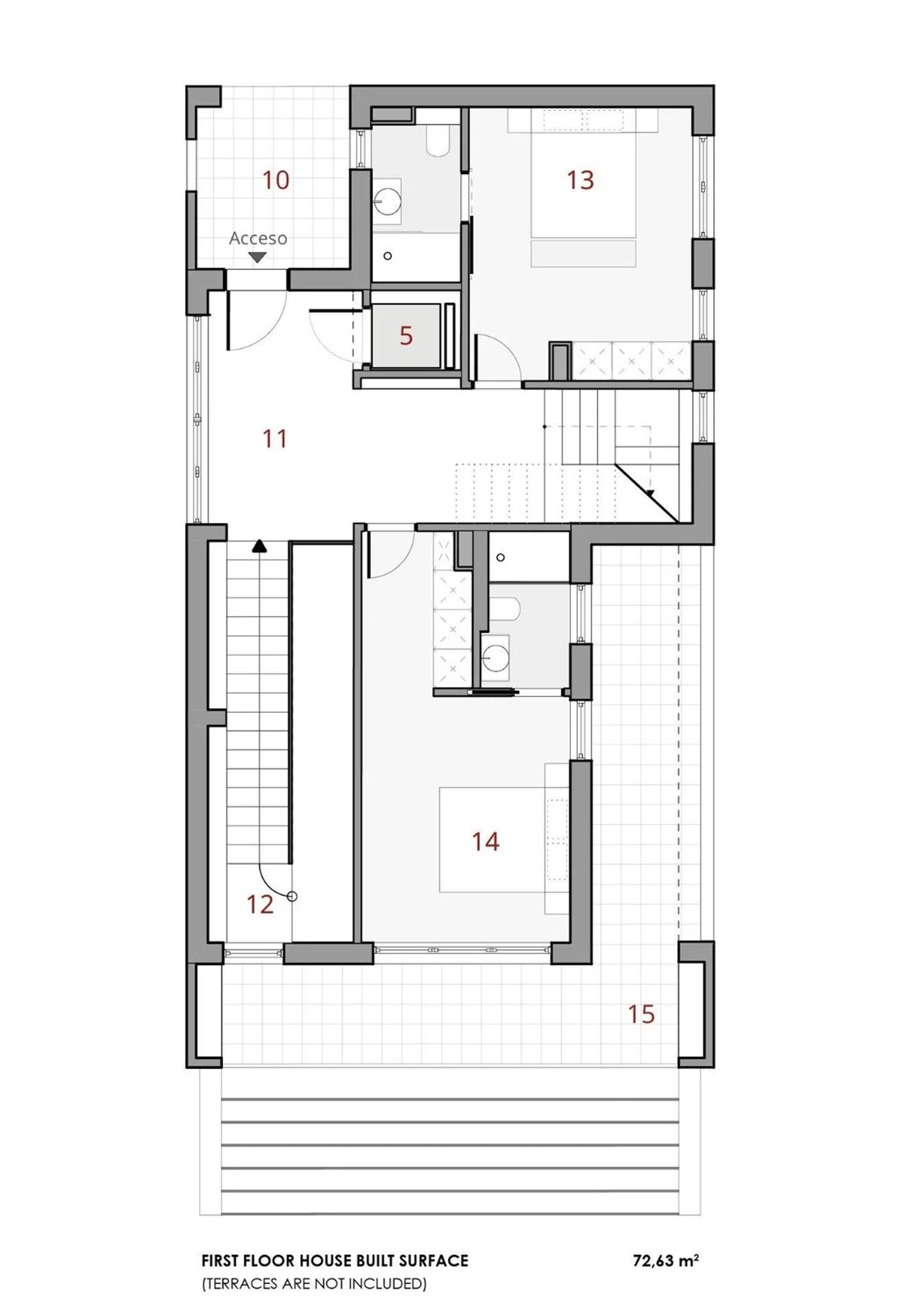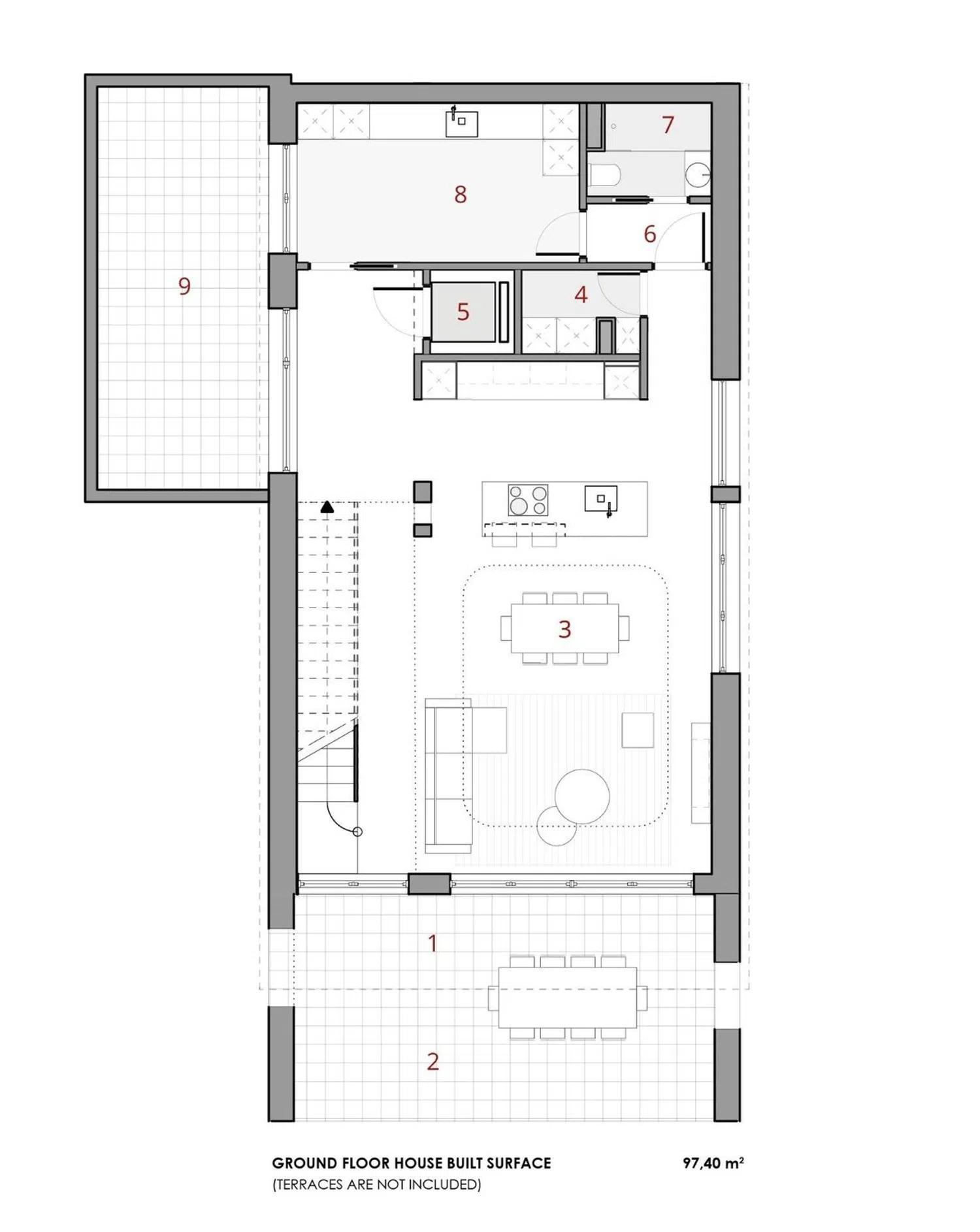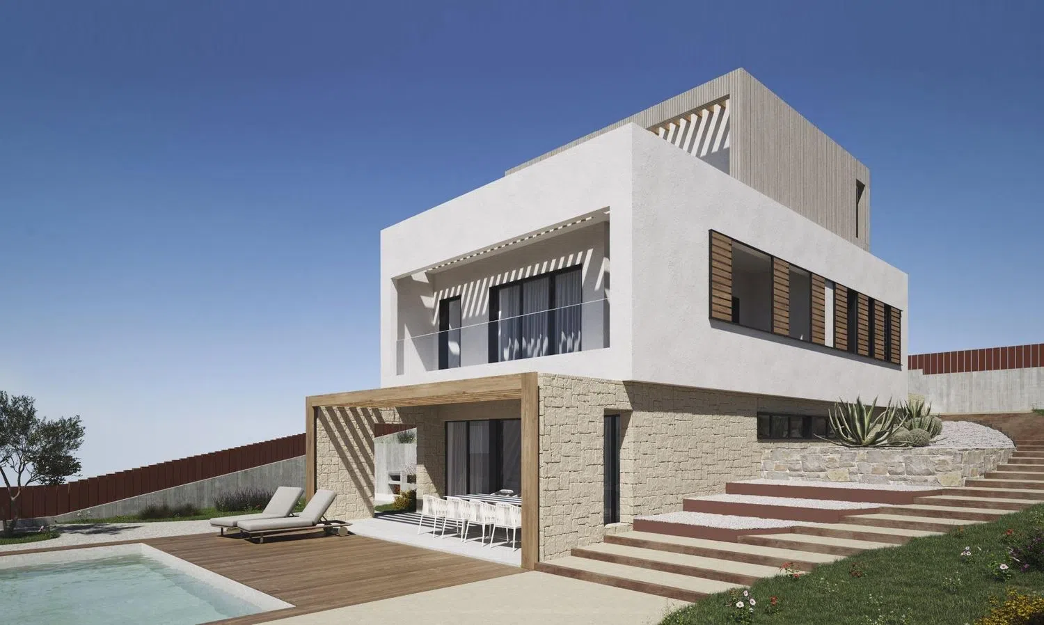 Der seitliche Garten, geschmackvoll mit Kakteen und weißem Kies geschmückt, verbindet den Zugang des ersten Stocks mit dem Hauptgeschoss. Das Spiel mit natürlichem Rasen auf dem restlichen Grundstück stammt aus einem sorgfältig gestalteten Landschaftskonzept, das weitere Akzente setzt. Jedes Geschoss ist mit Materialien versehen, die dessen Charakter unterstreichen.