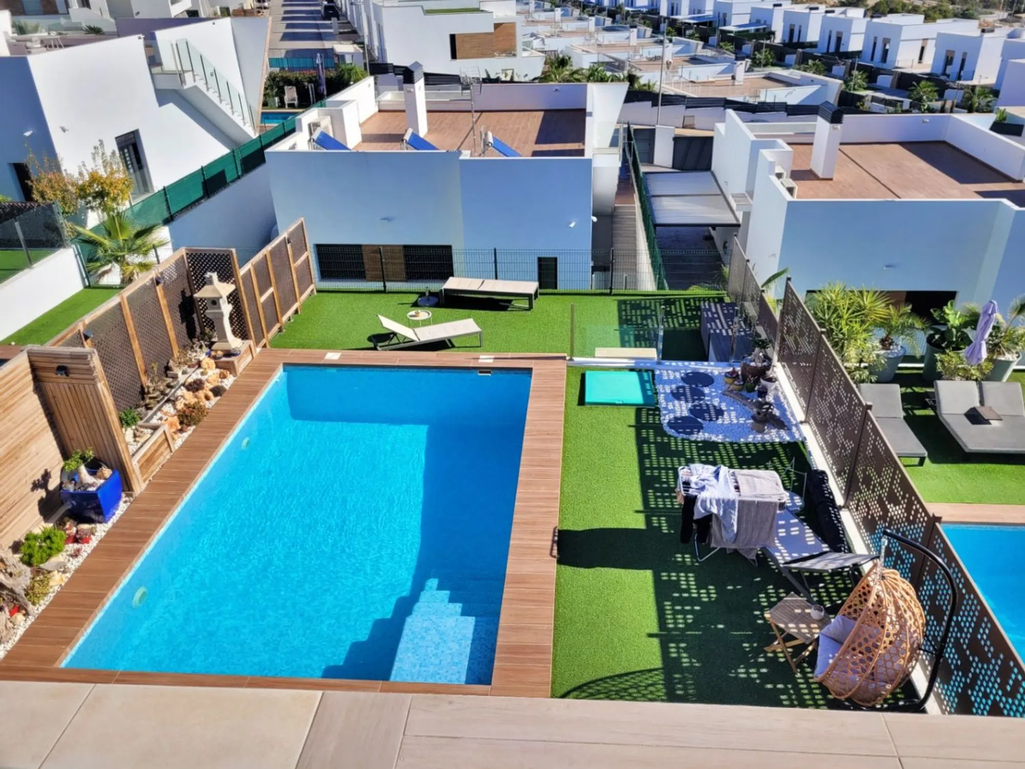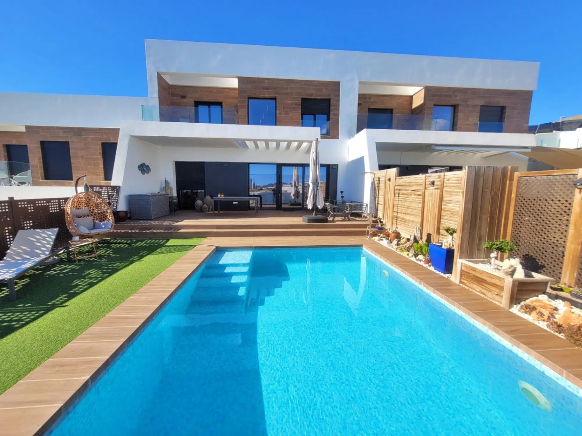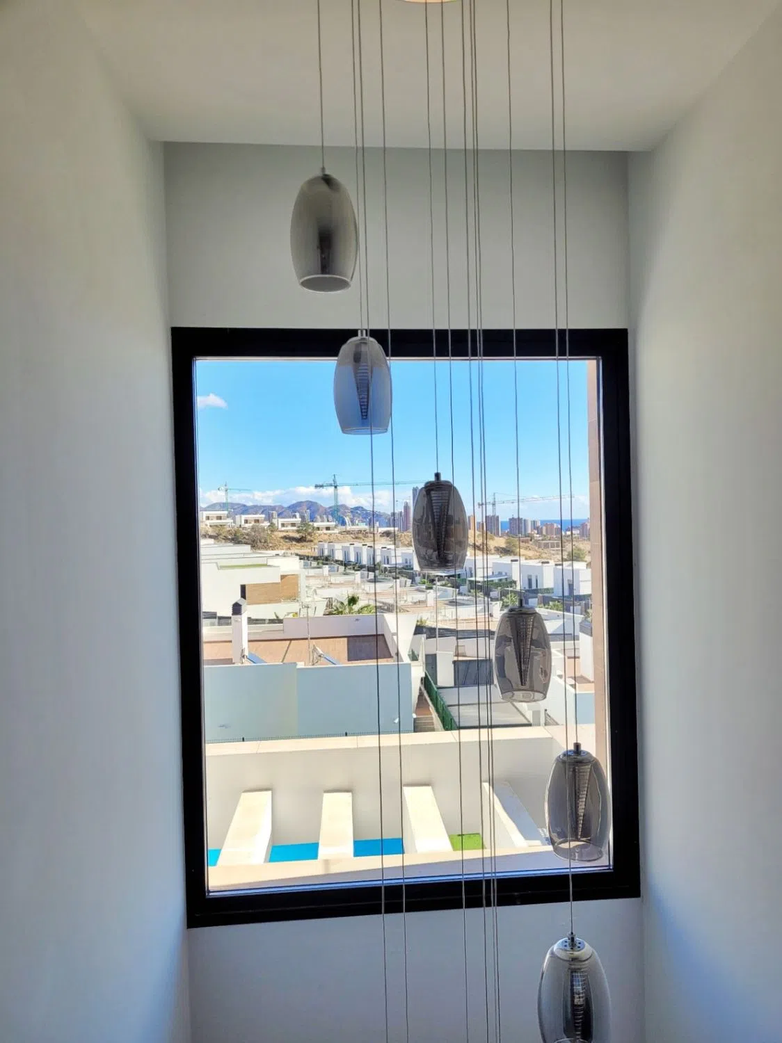 Moderna Villa Adosada en Balcón de Finestrat con Vistas Panorámicas al Mar y Licencia Turística Descubre esta sofisticada villa moderna de dos plantas en el codiciado Balcón de Finestrat, que cuenta con impresionantes vistas al mar y licencia turística, ideal para vivir de forma privada o para ingresos de alquiler premium. Exterior y Entrada La propiedad te recibe con un encantador jardín delantero que presenta un olivo maduro, un espacio de estacionamiento privado con toldo y una puerta eléctrica. Hay abundante estacionamiento en la calle. Unos pocos escalones conducen a la entrada principal, donde un brillante vestíbulo revela inmediatamente una impresionante vista enmarcada del Mar Mediterráneo y el horizonte de Benidorm. Planta Superior – Dormitorios Desde el vestíbulo se accede a dos hermosos dormitorios con baño en suite, ambos decorados con acabados de alta gama inspirados en el estilo francés. Un dormitorio disfruta de su propio balcón privado con vistas al mar, un lugar perfecto para contemplar el amanecer y la brillante costa. Planta Inferior – Espacios de Estar El nivel inferior cuenta con una elegante área de sala, comedor y cocina de concepto abierto. Grandes puertas corredizas conectan sin esfuerzo el interior con la terraza de la piscina, permitiendo que las vistas panorámicas sean parte de la vida cotidiana. La moderna cocina, completamente equipada, complementa el diseño contemporáneo, mientras que la terraza cubierta junto a la piscina climatizada ofrece disfrute al aire libre durante todo el año. El jardín cuidadosamente ajardinado maximiza tanto la privacidad como las vistas. Este nivel también incluye un tercer dormitorio, actualmente utilizado como oficina, y un baño con ducha. Características Piscina privada climatizadaOrientación sureste para luz natural durante todo el díaAire acondicionado en toda la casaPersianas eléctricasPuerta de seguridad y sistema de alarmaMobiliario de alta gama disponible para compraDiseño interior único y sofisticado en estilo francésUna oportunidad rara de adquirir una casa de lujo con vistas excepcionales, acabados refinados y potencial de alquiler llave en mano en una de las ubicaciones más deseadas de la Costa Blanca.