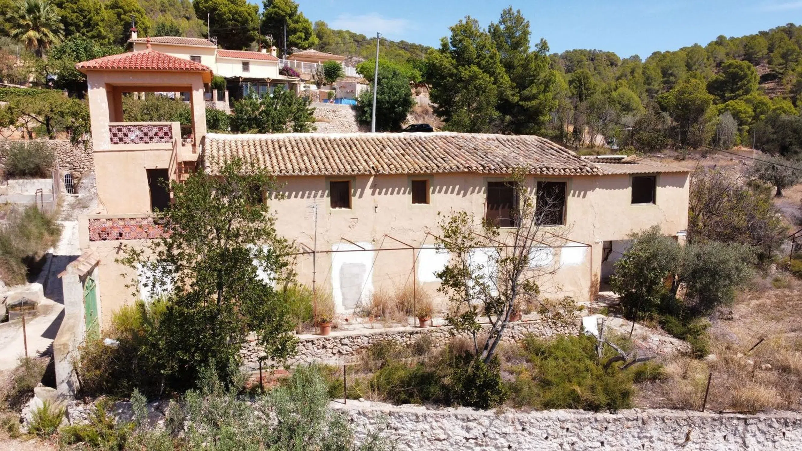 Se vende casa de campo, para reformar completamente, ubicada en un lugar muy tranquilo, en la partida Alqueria, con vistas despejadas al mar y montaña, a la que se accede por camino asfaltado (desde la carretera CV-758, dirección Benidorm) o desde la "font del molí". La parcela tiene poco desnivel y se encuentra abancalada, con forma de anfiteatro. La vivienda está distribuida en 2 alturas más un pequeña terraza cubierta en forma de torre: - Salón/comedor, actualmente sin cocina, 1 habitaciones y baño. Las dependencias son exteriores. - Donde se ubican las habitaciones, actualmente tapiado. Lugar de la vivienda con las mejores vistas. - Terraza/solárium cubierto La vivienda linda con camino en la parte superior y lateral este. Por otro lado, hay una servidumbre dentro la propiedad, justo al lado de la propiedad. La vivienda depende de depósito para el suministro de agua, deberá tener fosa séptica ecológica y se podrá conectar al tendido eléctrico. Para mayor detalle, no dude en consultarnos miguelcliment. es sebusca. eu [IW].