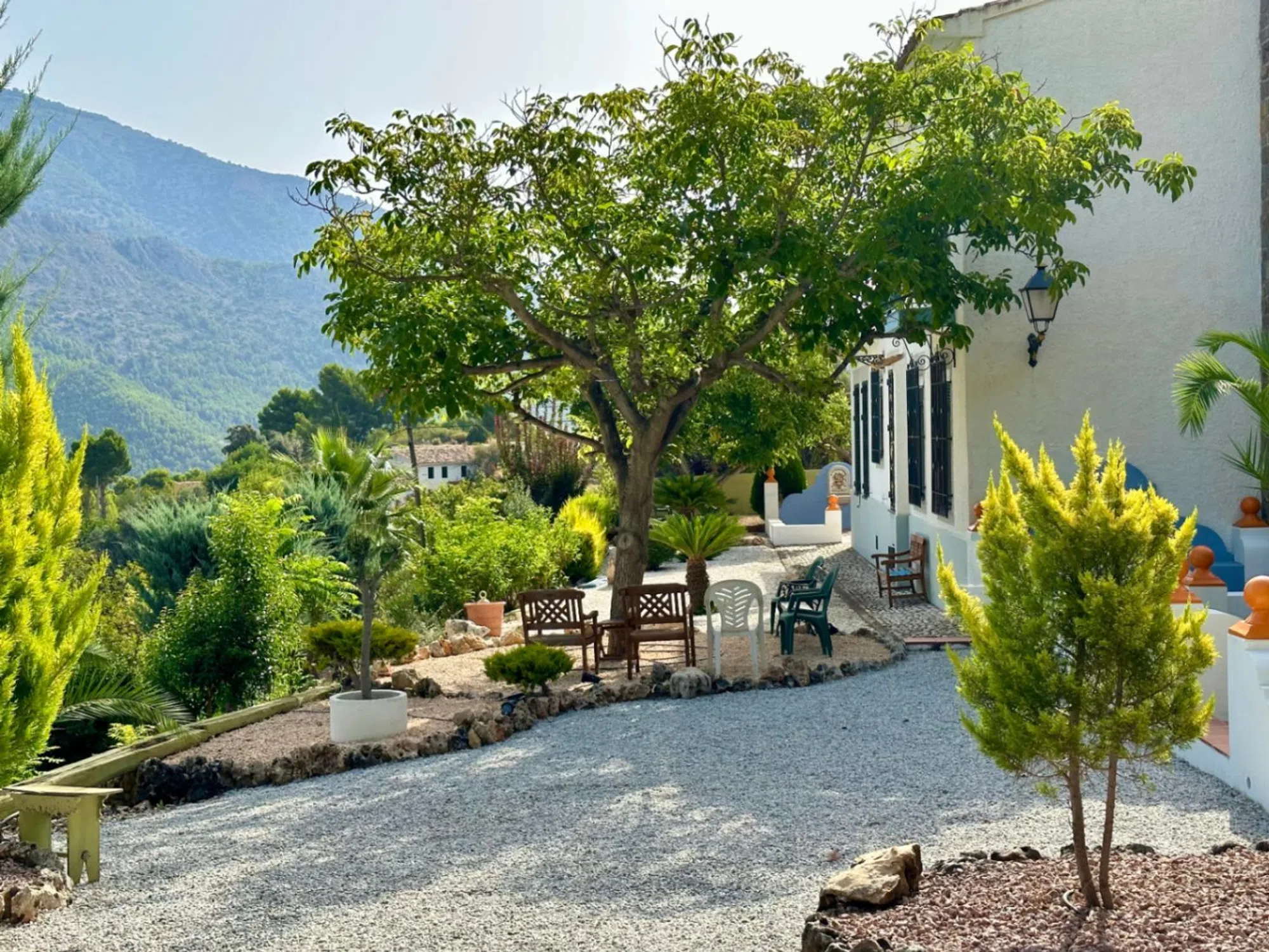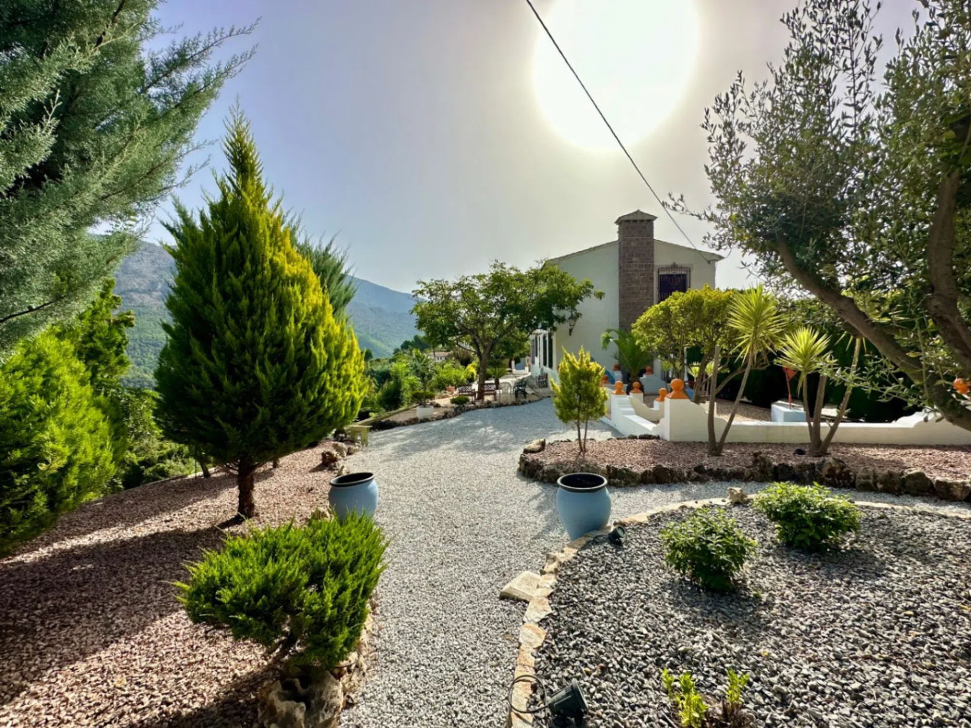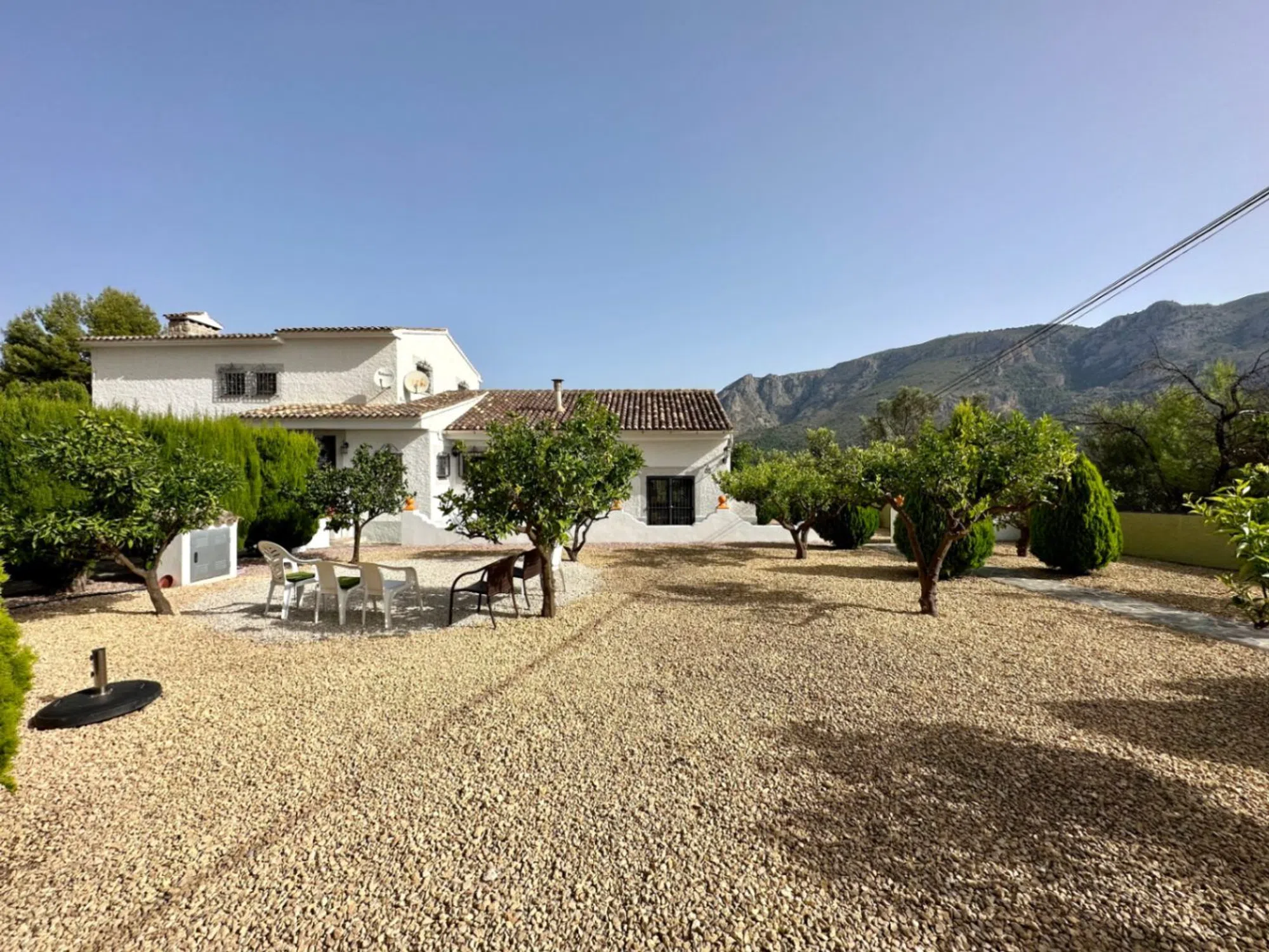 Se trata de una finca rústica en muy buen estado junto al castillo de Guadalest. Guadalest es muy conocido por su pantano, su paisaje pinturesco, y su castillo entre muchas otras cosas. La zona es rural y tranquila, aunque abunda de turistas en las épocas de primavera y verano gracias a sus atracciones turísticas. Se encuentra junto al pueblo a escasos 2 minutos en coche de farmacia, tienda, restaurantes, supermercado, etc. La finca fue construida aproximadamente hace 40 años y es de un diseño tradicional español. Cuenta con una parcela de aproximadamente 5750m2 en los que hay todo tipo de árboles mantenidos por sistema de goteo. La parcela es muy amplia y muy agradable ya que se respira tranquilidad en cualquier rincón. La entrada a la vivienda comienza por un acceso asfaltado para mayor comodidad a la hora de entrar en la vivienda. La finca en sí tiene alrededor de 230m2 construidos distribuidos en 2 plantas y un estudio para los huéspedes. En la planta baja se encuentra una cocina independiente, una galería, un despacho, un dormitorio, un comedor y un gran salón con una chimenea de 1650. Estas estancias tienen grandes alturas y son muy amplias. En la planta superior se encuentran 3 dormitorios, 2 de ellos con baños en-suite y con vistas a la montaña y al castillo de Guadalest. Sin duda una propiedad muy atractiva y única.