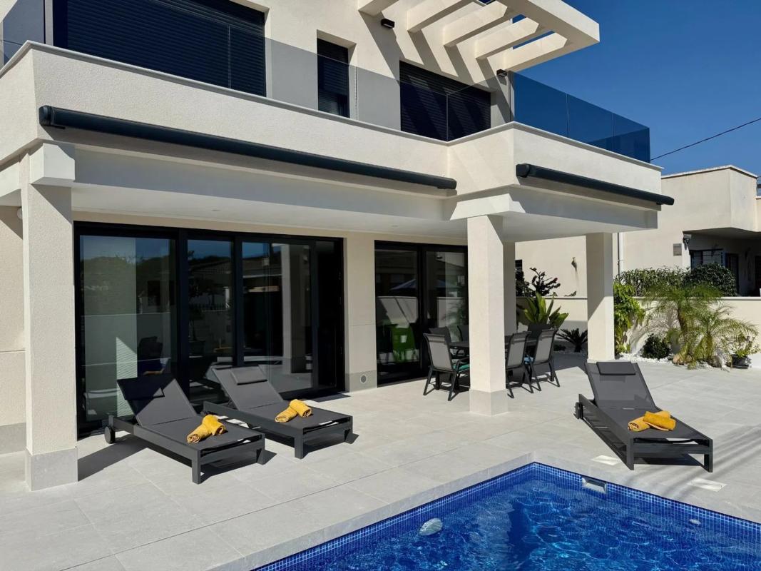 Descubre esta impresionante villa de lujo ubicada en la exclusiva zona de Buenavista, Guardamar del Segura. Con una superficie construida de 157 m2 y útil de 147 m2, presenta un diseño moderno distribuido en dos plantas. Dispone de cuatro habitaciones dobles y cuatro baños completos para el máximo confort familiar. Situada sobre una parcela privada de 313 m2, disfrutarás del sol mediterráneo desde su hermosa terraza o mientras te relajas junto a tu piscina rodeada por un encantador jardín. Esta vivienda se encuentra terminada en construcción desde el año 2025 y está lista para entrar a vivir gracias a sus acabados elegantes e instalaciones como aire acondicionado central Airzone con termostato individual en cada habitación que garantizan bienestar durante todo el año. Además cuenta con un sistema integral de alarma interior y exterior así como cámaras instaladas alrededor para mayor seguridad. La piscina incluye dosificación automática lo cual proporciona comodidad adicional; además contarás con cocina diseñada 'Made in Germany' ideal para los amantes culinarios y conexión internet alta velocidad asegurando todas tus necesidades tecnológicas cubiertas. A tan solo minutos caminando encontrarás hermosas playas naturales ideales tanto para relax como actividades recreativas al aire libre entre parques verdes.
