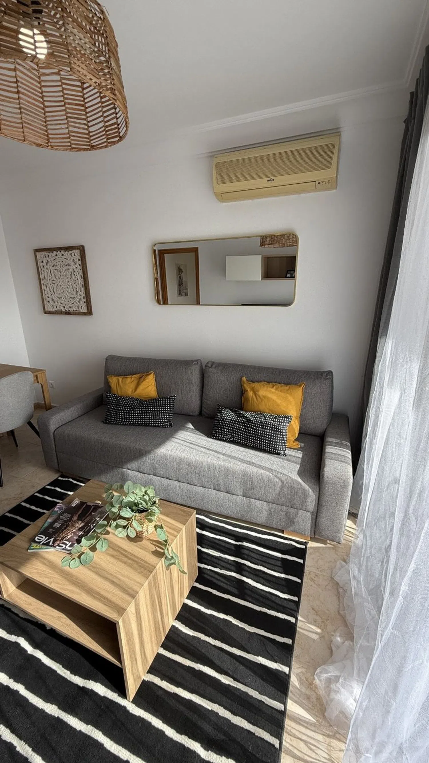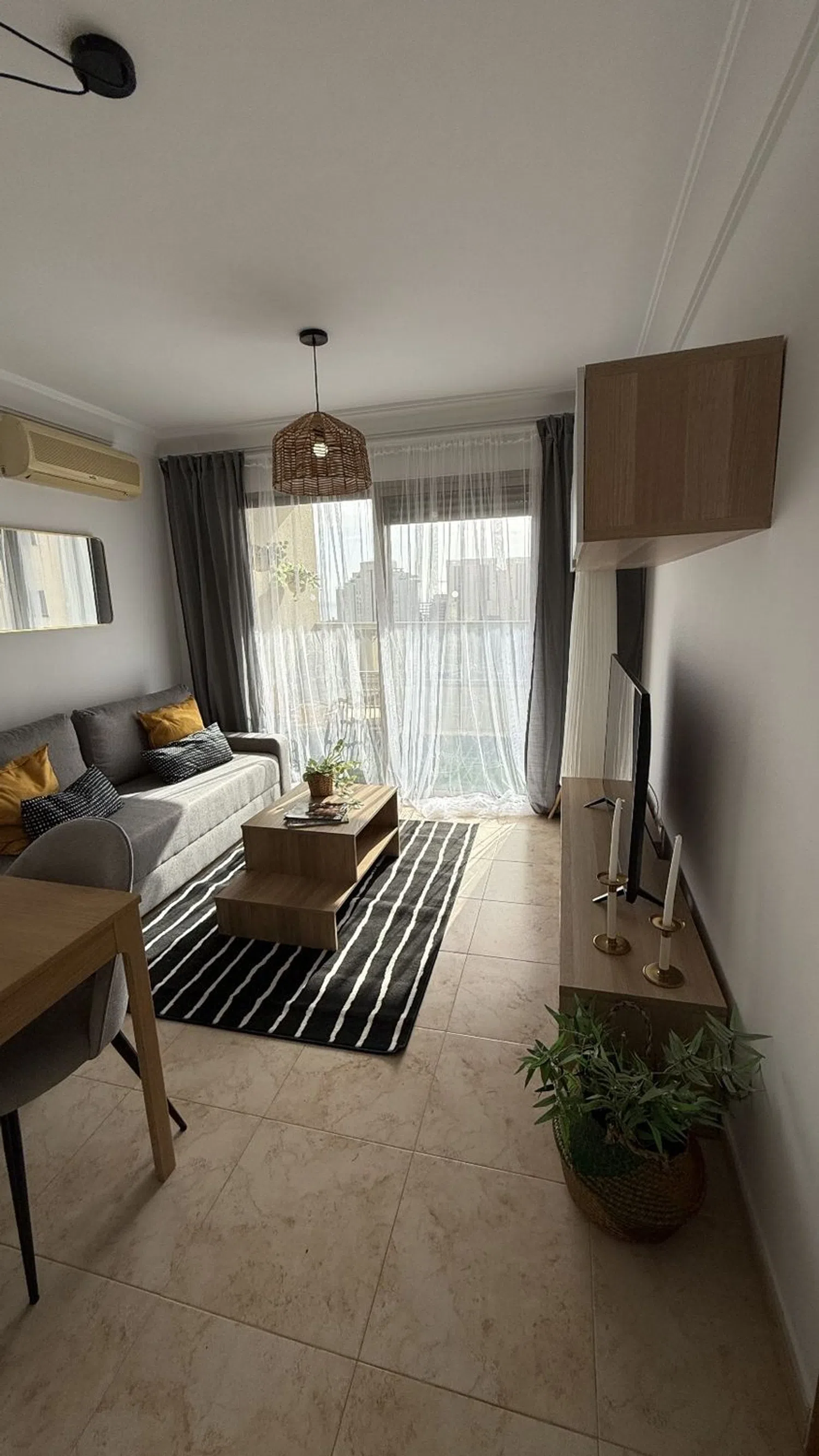 Das Hauptschlafzimmer dient als Ruheoase, während das Badezimmer mit Badewanne zu einem wohlverdienten Entspannungsmoment einlädt. Das Apartment ist komplett möbliert und bereit zur bezogenen Nutzung, mit hochwertigen Details wie Keramikfliesen, schallisolierten Fenstern und einer Sicherheitstür, die Komfort und Sicherheit gewährleisten. Die Wohnanlage bietet zwei Schwimmbäder, eines davon überdacht, sowie Grünflächen und einen Spielplatz, alles unter der Aufsicht eines Hausmeisters für Ihr Wohlbefinden.
