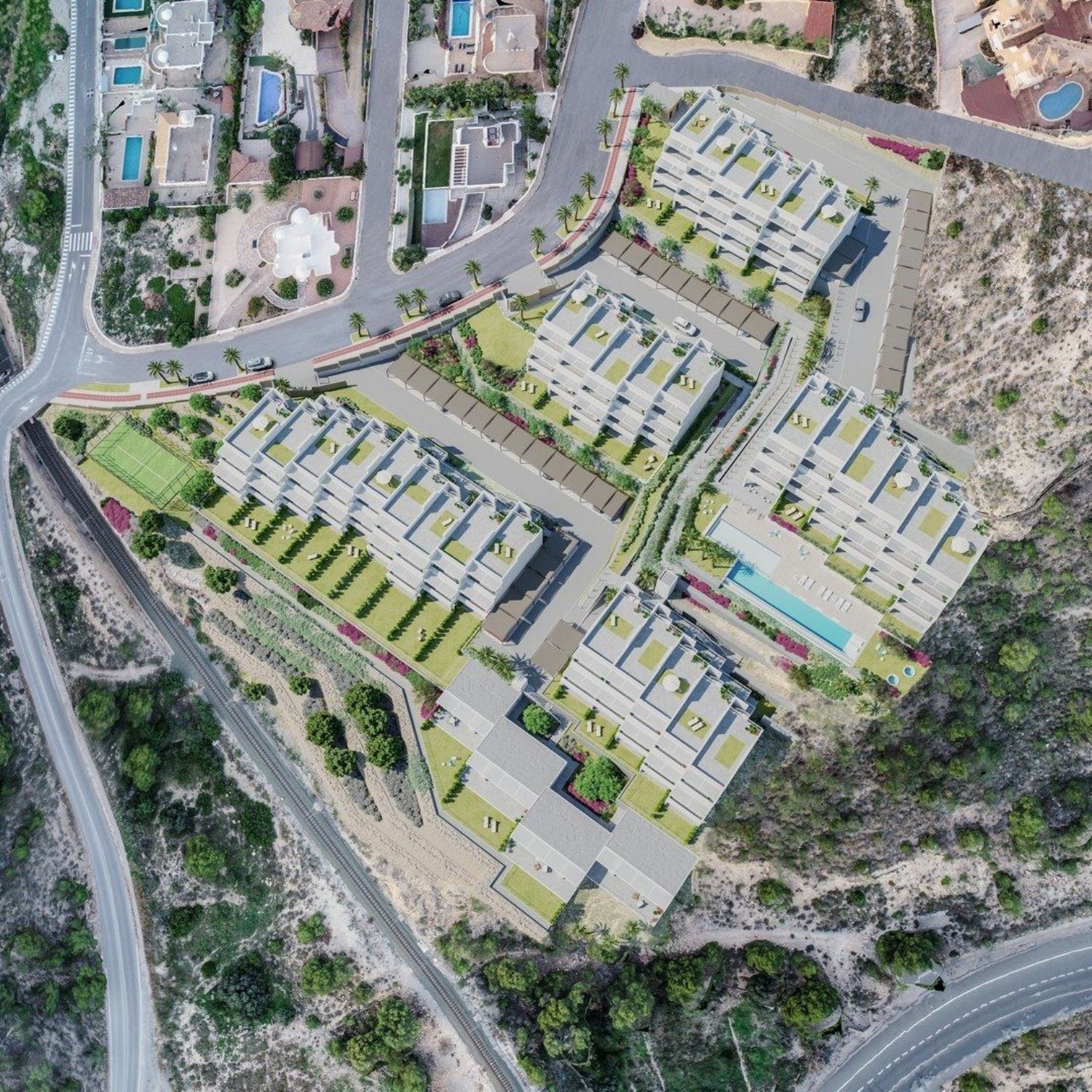 MIT ALLEN ANNEHMLICHKEITEN Die Wohnanlage befindet sich in einer Stadt, die das ganze Jahr über alle notwendigen Dienstleistungen bietet und zugleich mit ihrem Charme, ihrer Gastronomie und ihren Volksfesten begeistert. Die Stadt liegt nur 15 Minuten entfernt von einem internationalen Flughafen, einem Hochgeschwindigkeitszug und einem Hafen, sowie den vielfältigsten Angeboten in den Bereichen Gesundheit, Freizeit und Einkaufsmöglichkeiten, die eine Großstadt zu bieten hat. Benidorm ist nur 8 Minuten entfernt und bietet zahlreiche Einkaufszentren sowie alle touristischen Freizeitmöglichkeiten.