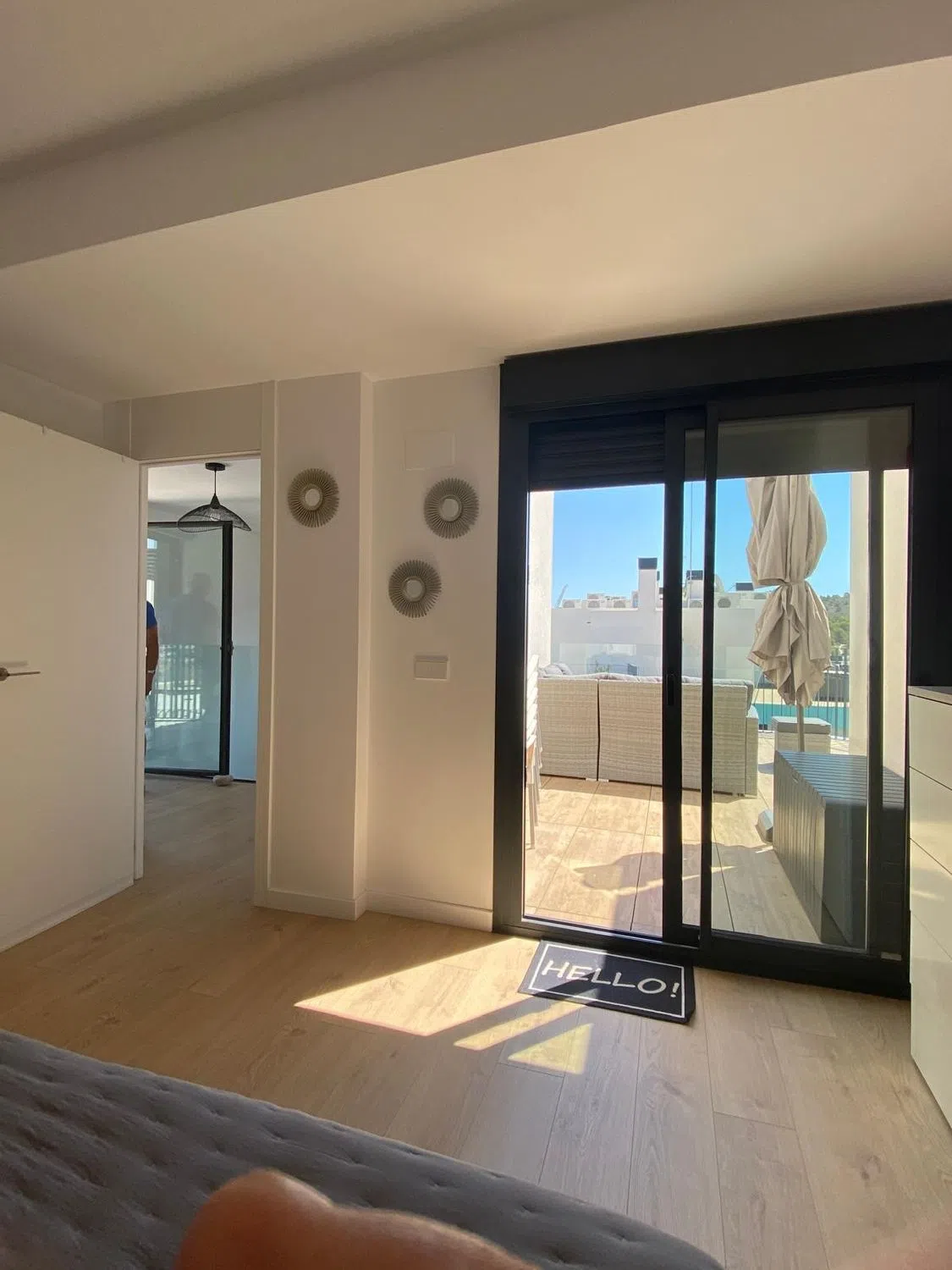 Exepcional amplió, muy luminoso atico de 2 plantas de reciente construcción en primera línea de la playa El Torres en la Residencial privada de lujo se Vende por el precio exceptional garantizando magnifica inversion. Orientado al sestet y mirando al mar y tiene vistas frontales al mar desde sus ambas plantas igual que a las montanas. Tiene muchísima luz y privacidad siendo esquina con Terrazas de 45 m2 y 30 m2. Este luminoso y jugoso penthouse con estilo está amueblado con muebles de diseño de primera clase y totalmente equipado incluyendo toallas y ropa de cama: todo nuevo sin estrenar. Dispone de dos Dormitorios de matrimonio doble con cama de 160 sm y otro dormitorio con dos camas individuales. Diseñado y mejorado para tener más luz y espacio este atico goza de los electrodomésticos Marca Bosch, calefacción por Aerotermia, suelo radiante en los baños. La cocina esta totalmente equipada con tostadora, exprimidor, cafetera, tetera etc. El salón comedor tiene salida a las dos terrazas por las 2 puertas del cristal. El Balcón de la planta primera igualmente tiene su mesa con sillas.
