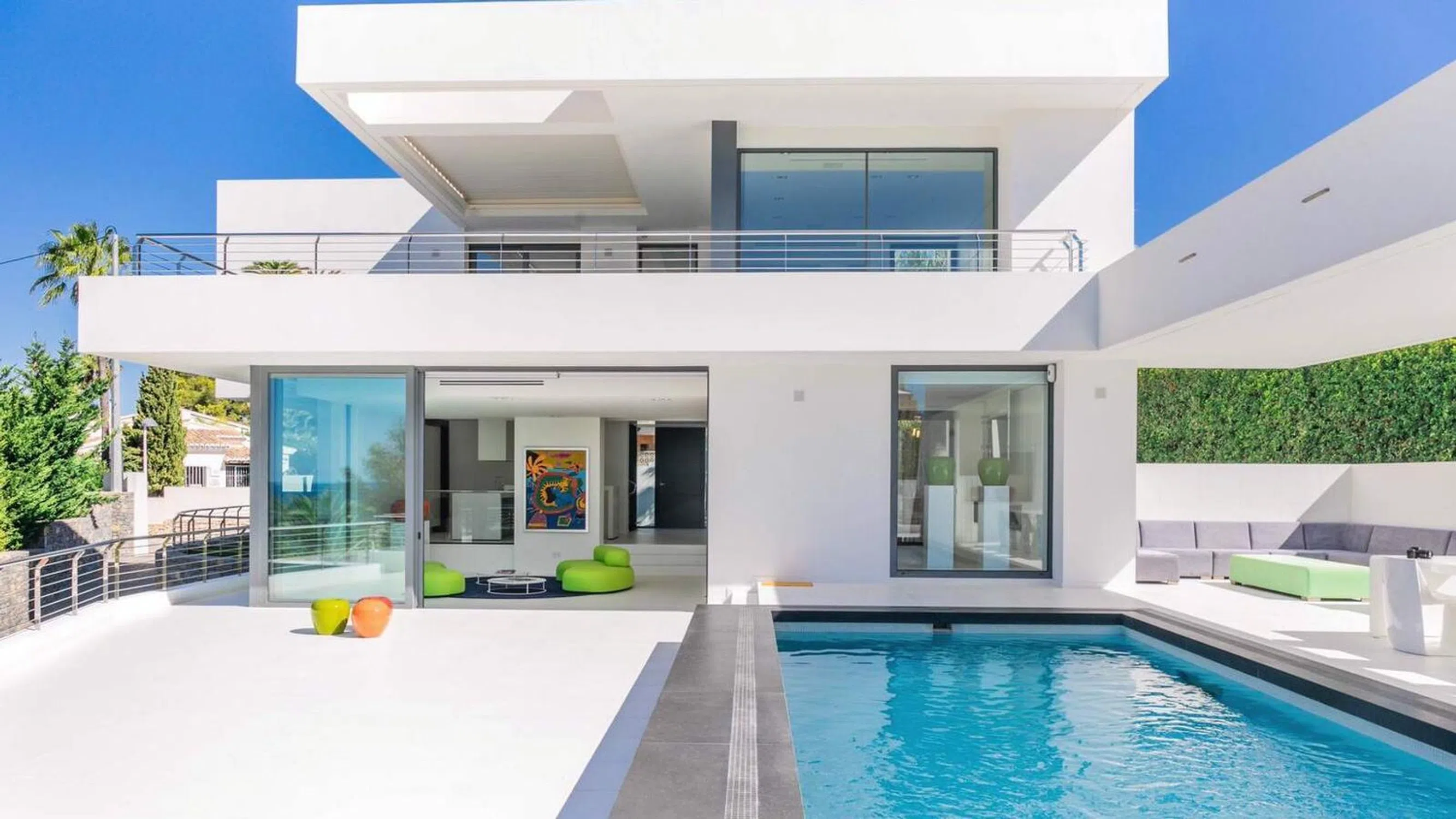 Moderno chalet de lujo con vistas al mar en venta en la urbanización El Portet en Moraira en la Costa Blanca de Alicante en España. El Portet de Moraira en la Costa Blanca de Alicante, una de las zonas residenciales mas exclusivas de la Costa Blanca, con una extraordinaria belleza natural con 738 m2 construidos, distribuidos en 2 plantas y 7 dormitorios, 7 baños, en una parcela de 1036 m2, amplio salon-comedor de 100 m2, cocina totalmente equipada con isla central, amueblada, comedor, sala de estar, chimenea con cassette, sala de TV, home cinema, vestidor, armarios empotrados, barbacoa y cocina exterior de verano, lavadero, trastero, gimnasio, garaje, parking, pérgola, jacuzzi, piscina rectangular, jardín de bajo mantenimiento, jardín con árboles frutales, jardín con sistema de riego, césped artificial. Equipado con: aire acondicionado frío / calor en toda la casa, calefacción por suelo radiante, alarma, domótica, home cinema, internet, teléfono, ventanas de doble acristalamiento, puerta blindada. La planta baja tiene un alojamiento independiente de una sala de estar, 5 dormitorios, 5 baños, una cocina, amplio garaje y una bodega. Aire acondicionado, Aspiración centralizada, Doble acristalamiento, Persianas eléctricas, Persianas eléctricas, Grupo electrógeno, Chimenea, Domótica, Internet, Jacuzzi, Bañera de hidromasaje, Cortinas, Barbacoa, Cochera, Iluminación exterior, Manantial, Sistema de riego, Sistema de alarma, Entrada con código digital, Portón eléctrico, Interfono, Caja fuerte, Puerta de seguridad, Cámaras de seguridad, Video portero, Sauna, Spa, Piscina, Secadora, Lavavajillas, Reproductor de DVD, Microondas, Horno, Frigorífico, TV vía satélite, Cocina de gas, Lavadora, Cableado de red informática, Sistema contra incendios.
