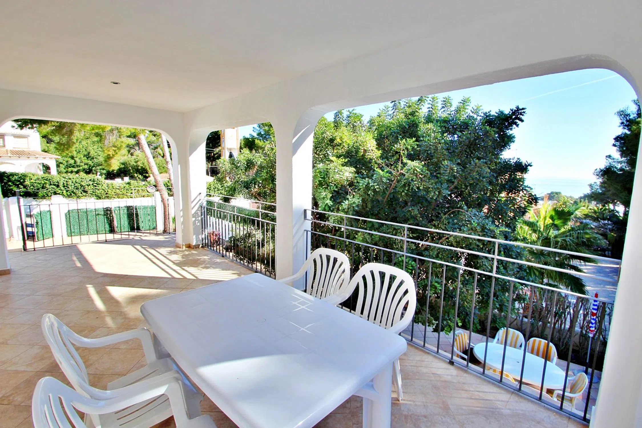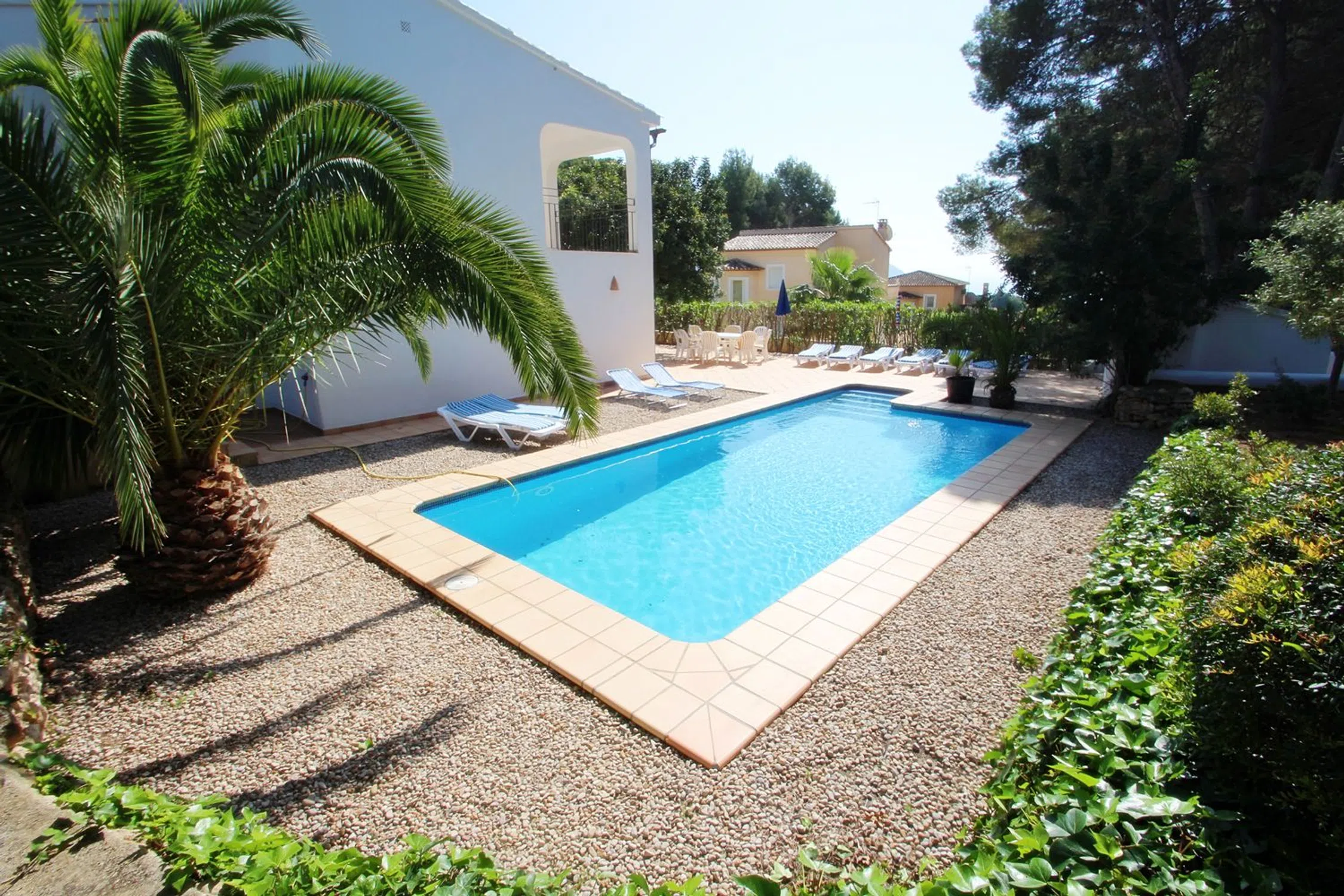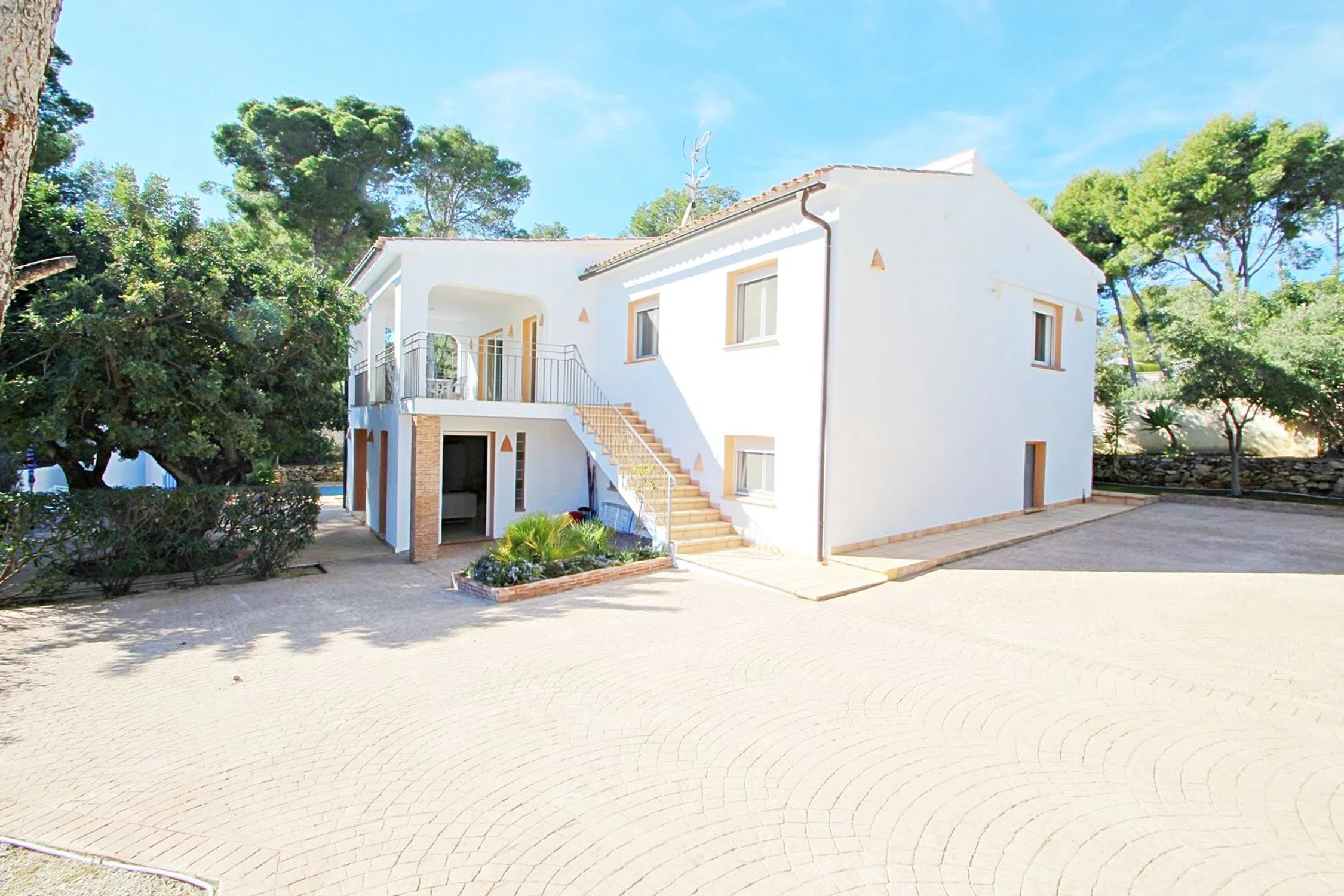 Esta villa se asienta sobre una parcela de 5.000 m² que, según el plan parcial, podrá dividirse en cuatro parcelas adicionales más la villa, sumando un total de cinco. Sin embargo, la propiedad se vende en conjunto, lo que la convierte en una oportunidad única para inversores. La propiedad es moderna e independiente y está ubicada en una calle tranquila de Moraira, a solo unos minutos a pie de supermercados, bares, restaurantes locales y de la playa “Les Platgetes”, con la animada Calpe a 15 minutos en coche. El espacio exterior es un paraíso privado, con patios soleados cerrados que rodean una refrescante piscina, ideal para cenar al aire libre con muebles, tumbonas y barbacoa portátil. La villa, en dos plantas, está diseñada como dos apartamentos independientes. En la planta baja, a nivel de la piscina, hay un salón-comedor acogedor, cocina americana equipada, dos dormitorios dobles con A/C y un baño. En la planta superior, a la que se accede por escaleras exteriores, se encuentra un salón-comedor luminoso con gran balcón y vistas al mar, cocina equipada, dos dormitorios dobles, un dormitorio con dos camas —todos con A/C—, un baño completo y un aseo con ducha. La calefacción central asegura confort en invierno.