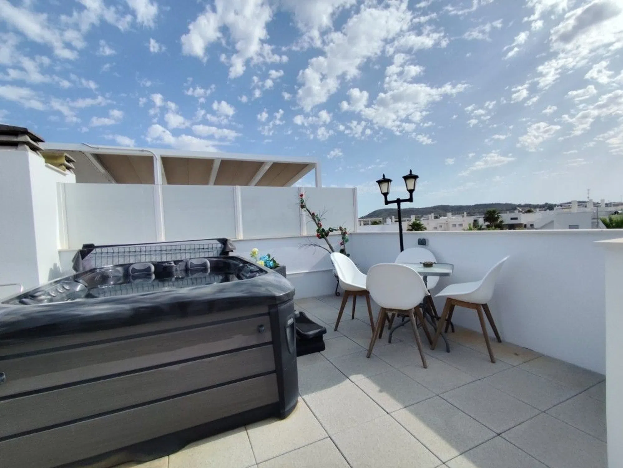 Ático. Moderno apartamento en planta alta con solárium y jacuzzi en Vistabella Golf Ubicación: Vistabella Golf, Costa Blanca Sur Este apartamento de dos dormitorios en planta alta, con orientación oeste, en la popular urbanización Vistabella Golf, ofrece comodidad, espacio y una ubicación privilegiada. A solo 5 minutos a pie de bares, restaurantes y un supermercado, esta propiedad está idealmente ubicada para la conveniencia diaria. En coche, está a solo 5 minutos de Los Montesinos, a 10 minutos de Quesada y Benijófar, y a unos 20 minutos de las impresionantes playas de la Costa Blanca. Construido en 2019, el apartamento cuenta con una sala de estar luminosa y espaciosa con grandes puertas correderas que se abren a una generosa terraza con vistas a los jardines comunitarios impecablemente mantenidos. La cocina americana totalmente equipada incluye una gran barra de desayuno, perfecta para comidas informales o para entretener a los invitados. Hay dos habitaciones dobles, ambas con armarios empotrados. El dormitorio principal tiene su propio baño en suite, y también hay un segundo cuarto de baño familiar moderno con ducha. Desde la terraza, las escaleras exteriores conducen a su solárium privado, donde encontrará un jacuzzi, incluido en la venta, y una zona de sombra con persianas solares, creando un entorno ideal para cenar al aire libre y relajarse mientras disfruta de vistas panorámicas y puestas de sol. Las características adicionales incluyen: Aire acondicionado por conductos Cuatro paneles solares Parcialmente amueblado Piscina comunitaria Plaza de aparcamiento comunitaria asignada Esta propiedad bien mantenida ofrece un estilo de vida equilibrado de comodidad, relajación y accesibilidad, ideal como refugio de vacaciones, inversión de alquiler o hogar permanente bajo el sol español. Contacto ¿Interesado en ver u obtener más información? Póngase en contacto con Sunrisa Real Estate. ¡Estaremos encantados de ayudarle a encontrar su lugar bajo el sol! ☀️.