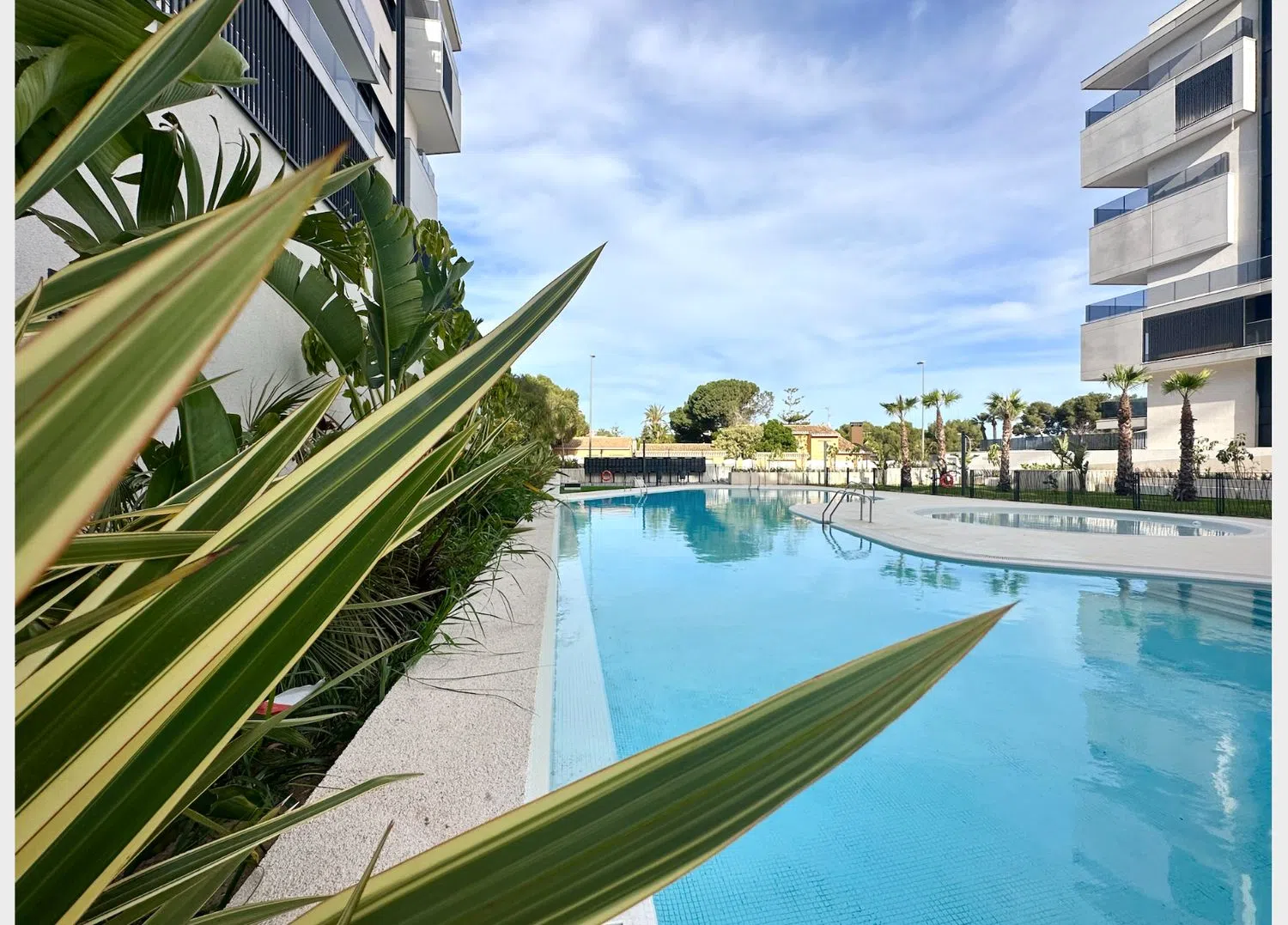 Außerhalb der Wohnung erwartet dich eine luxuriöse Gemeinschaftsanlage: zwei Außenpools, ein Hallenbad, Sauna, Fitnessraum und ein Entspannungsbereich, in dem man gesellig sein kann. Das gemeinschaftliche Solarium mit einer Bar ist ideal, um Getränke mit Panoramablick zu genießen. Für Familien gibt es im hinteren Bereich einen Spielplatz, wo die Kinder Freude haben können, während du die Annehmlichkeiten der Anlage nutzt.