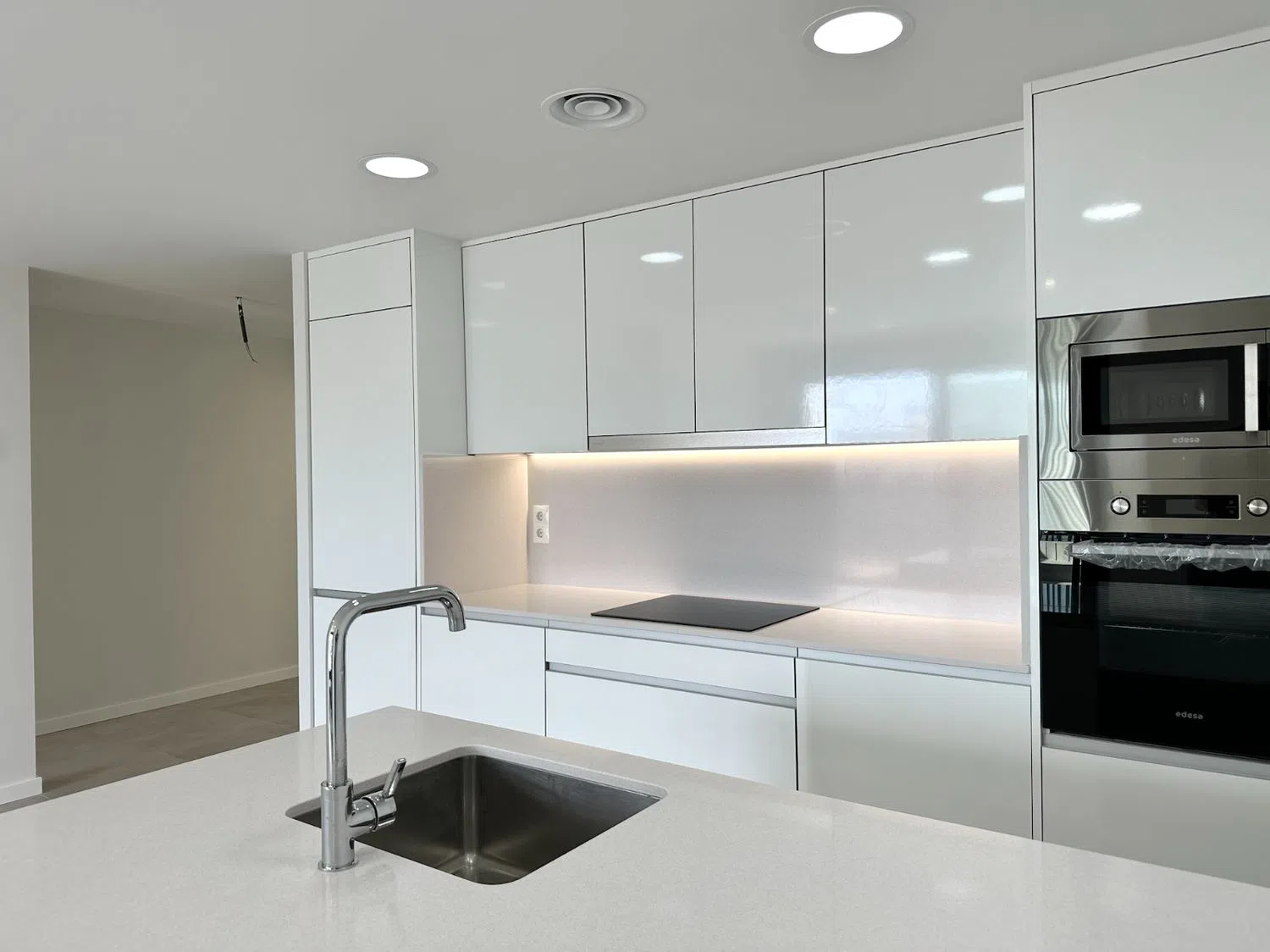 Der Wohnbereich beeindruckt mit seiner Weite und seinem Stil, ergänzt durch eine offene Küche mit einer modernen Kochinsel und integrierten Geräten, perfekt für Kochliebhaber. Schiebefenster verbinden das Wohnzimmer und das Hauptschlafzimmer mit einer großzügigen Terrasse, die ideal ist, um die Brise und die beeindruckenden Ausblicke zu genießen.