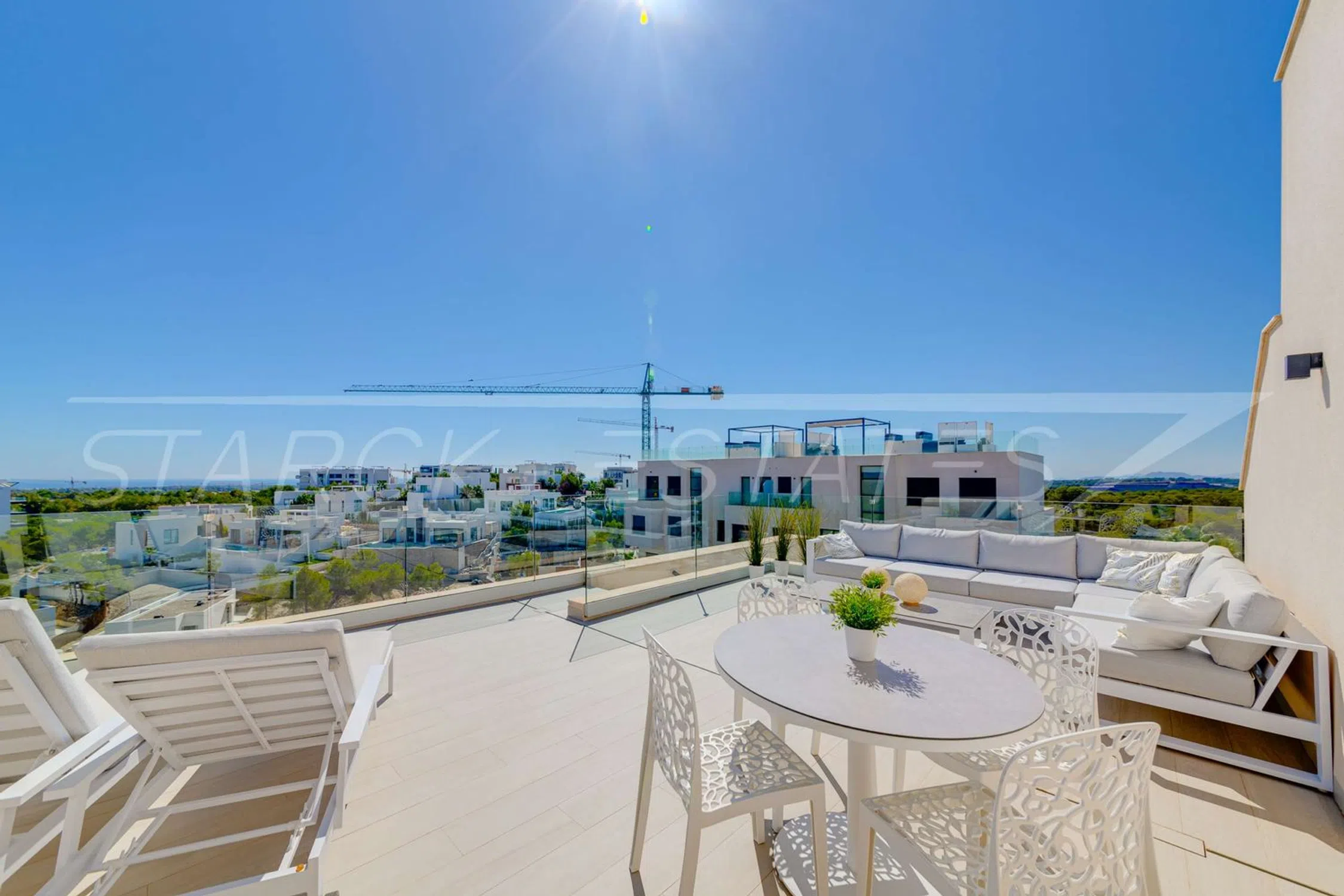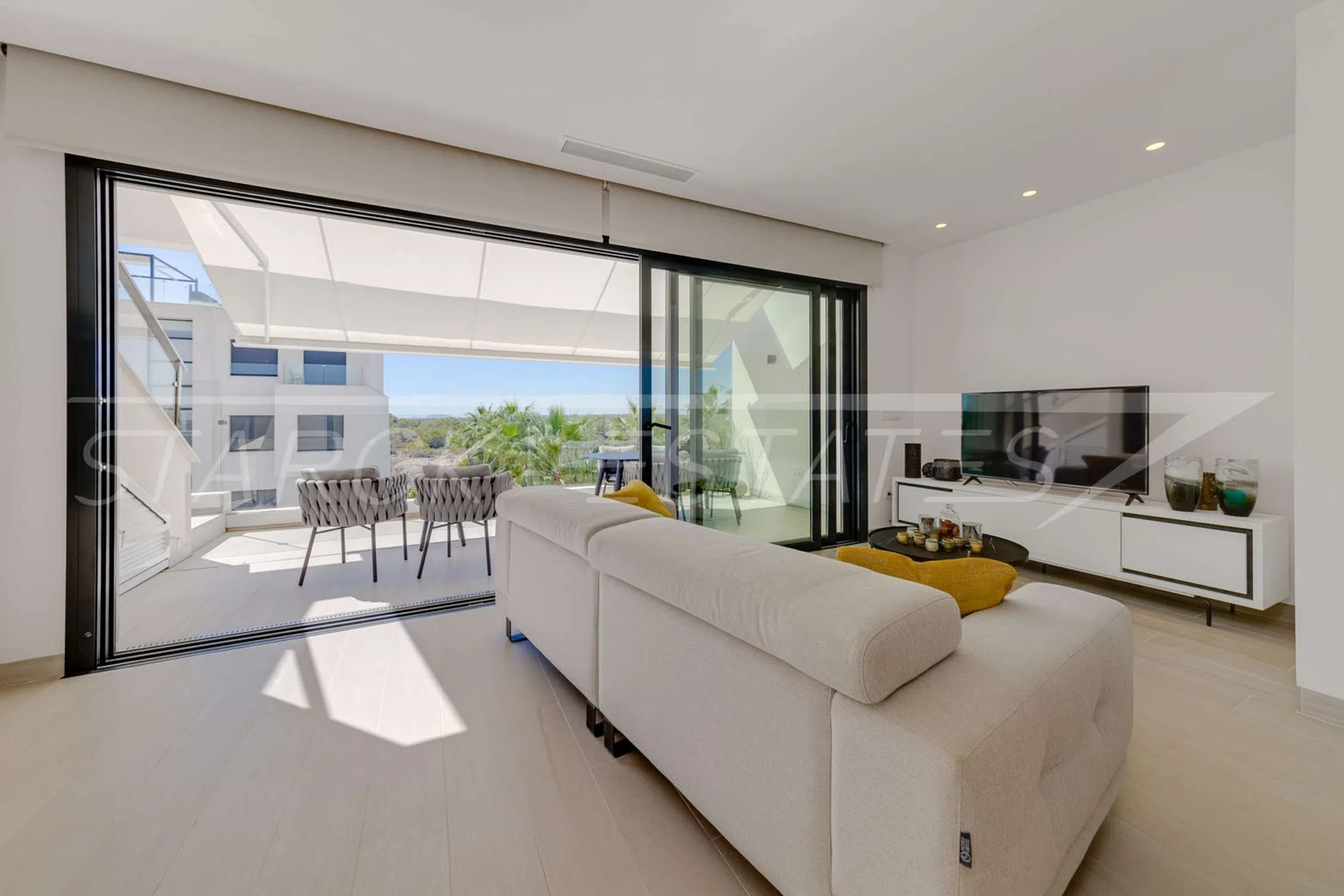 Este ático de lujo se encuentra en el exclusivo Las Colinas Golf Resort, ofreciendo una combinación única de elegancia y confort. El ático está situado en el último piso de un moderno complejo residencial, terminado en 2020, y se presenta en un estado impecable. Con una superficie de 76 m², el apartamento incluye un salón/ comedor de planta abierta con cocina integrada, un dormitorio principal con cuarto de baño en suite, otro dormitorio doble y un cuarto de baño con ducha separado. Desde la sala de estar se accede a una amplia terraza de 20 m², que ofrece una hermosa vista del jardín mediterráneo y las áreas verdes circundantes. Un piso más arriba, encontrará un impresionante solárium de 40 m² con trastero, que ofrece una impresionante vista panorámica de 180 grados hasta el mar. El exclusivo complejo residencial cuenta con una lujosa piscina, jardines bien cuidados y hermosas zonas verdes. Una plaza de aparcamiento subterráneo para su vehículo y un trastero están incluidos en la oferta. Los gastos de la comunidad ascienden a aproximadamente 1860 € al año. Disfrute de la vida en uno de los complejos más buscados de la región, rodeado de belleza natural y comodidades de primera clase.