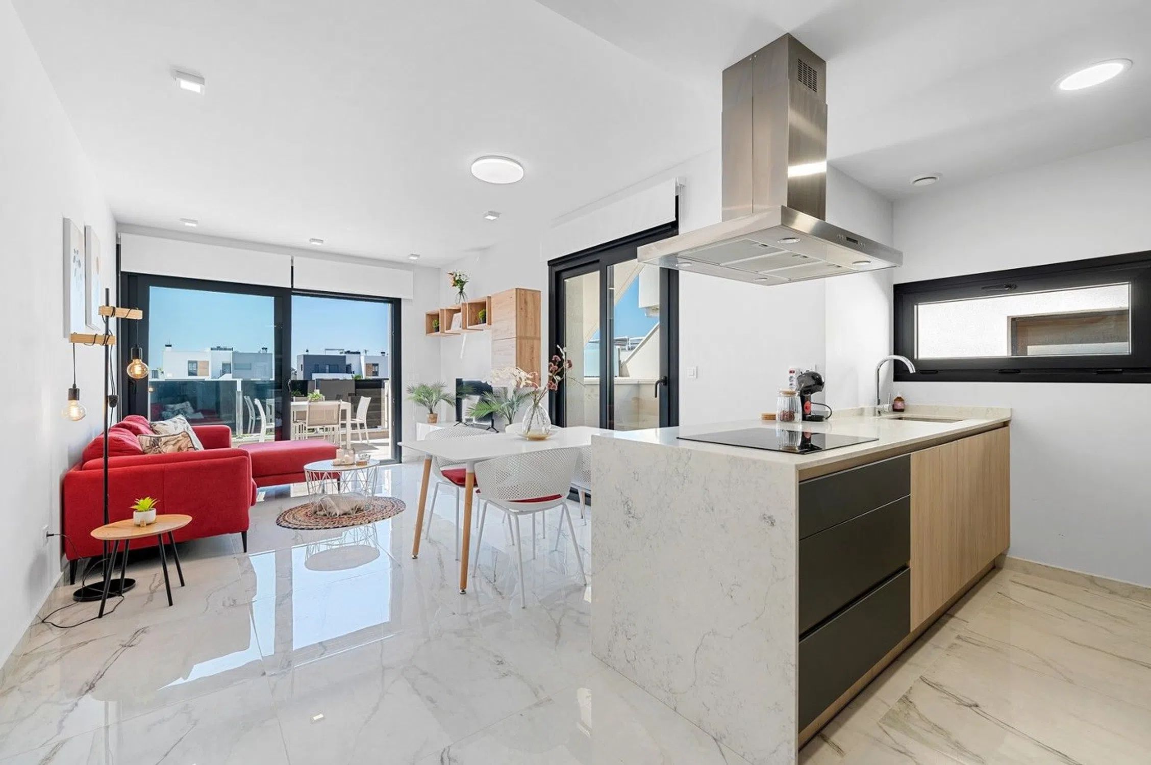 Descubra este moderno ático ubicado en el prestigioso residencial Amanecer IX, en Los Altos, una de las zonas más codiciadas de Orihuela Costa. Con una distribución cuidada al detalle, esta vivienda ofrece 2 dormitorios, 2 baños y una elegante cocina abierta que se integra armoniosamente con el salón, todo bañado por una luminosidad excepcional gracias a su orientación sur. Este encantador apartamento de esquina presume de vistas despejadas a las cuidadas zonas comunes, incluyendo una espectacular piscina comunitaria, ideales para disfrutar de un entorno de tranquilidad y bienestar. Su amplia terraza privada ofrece el equilibrio perfecto entre privacidad y vistas, y dispone de acceso directo desde el salón, así como escaleras privadas que conducen a un exclusivo solárium en la azotea. La propiedad se vende completamente amueblada, lista para entrar a vivir o disfrutar desde el primer momento: incluye muebles de interior y exterior, electrodomésticos, utensilios de cocina, toallas y todo lo necesario para una vida confortable. Asimismo, se incluye en el precio una plaza de garaje subterránea y un trastero, añadiendo un valor adicional a esta atractiva oferta. Situado a escasos minutos de supermercados, tiendas, el popular centro comercial La Zenia Boulevard, así como de las playas de Orihuela Costa, este ático representa una oportunidad única para quienes buscan una combinación de lujo, comodidad y localización privilegiada. También encontrará una variada oferta de restaurantes, bares y campos de golf en las proximidades. Contáctenos hoy mismo para concertar una visita y descubrir personalmente esta joya inmobiliaria en la Costa Blanca. Clima: El clima en la Costa Blanca, a menudo considerado como el mejor de Europa, hace posible un estilo de vida muy sociable y saludable, al aire libre, marcado por completas instalaciones deportivas y de ocio, con ciudades turísticas, excitantes y cosmopolitas, que destacan por la prestación de servicios máxima categoría, algunos de ellos exclusivos, considerados de auténtico lujo. Todos ellos destinados a un cliente exigente, que busca calidad y cercanía. La Costa Blanca cuenta con más de 300 días de sol al año. Un paraíso con excelentes conexiones a toda Europa. El Aeropuerto de Alicante-Elche cuenta con unas modernas instalaciones y con un fácil y cómodo acceso desde cualquier punto de la provincia. Entorno: La Costa Blanca sigue atrayendo a personas de toda Europa, y de otros lugares del mundo, porque ofrece una calidad de vida única en un hermoso entorno a orillas del mar Mediterráneo, rodeado de montañas y de una exuberante vegetación. Además de los campos de golf y los puertos deportivos que podrás disfrutar por toda la costa, la zona también ofrece la posibilidad de esquiar en la cercana Sierra Nevada, Javalambre o Valdelinares, unos paraísos para amantes de los deportes de invierno, con hermosos paisajes naturales. La Costa Blanca ofrece un estilo de vida singularmente rico, donde las mejores playas y calas del Mediterráneo se combinan con un interior repleto de montañas y pueblos que esconden cultura y monumentos históricos únicos en el mundo. Tenemos un regalo para ti: Desde nuestra inmobiliaria le ayudamos a convertir su nueva propiedad en la casa de tus sueños y te regalamos una visita técnica del departamento de diseño a la vivienda, donde nuestro equipo técnico le aconsejará sobre las posibilidades de mejora y decoración de su propiedad. Totalmente gratis! IMPORTANTE! Recuerde que nuestros servicios NO incrementan NUNCA el precio final de la vivienda a nuestros client.