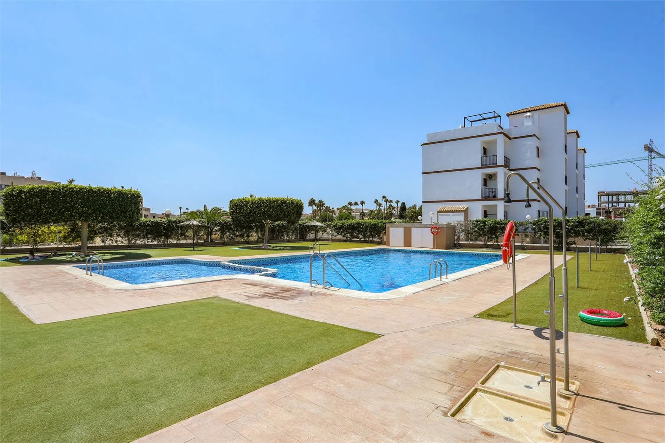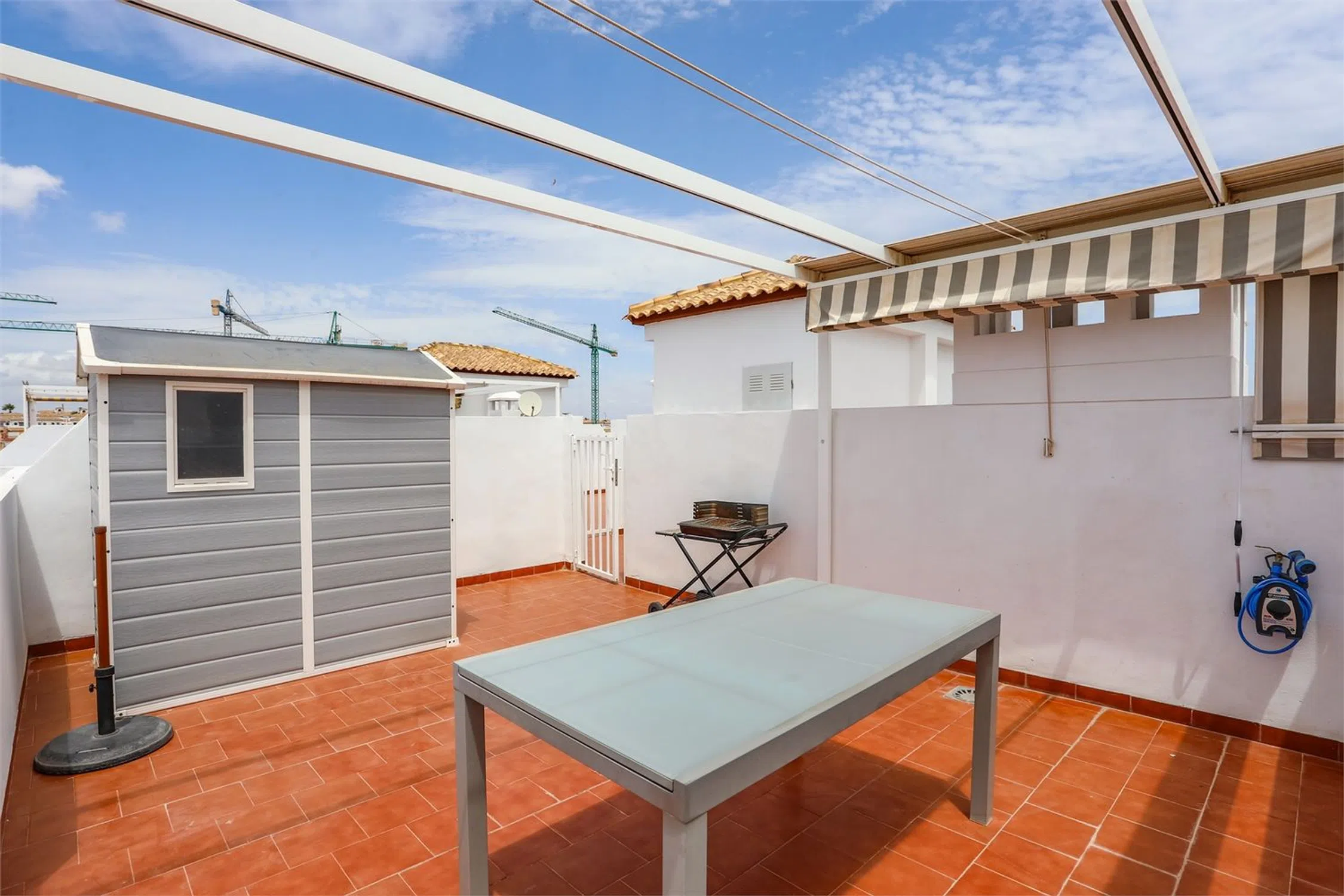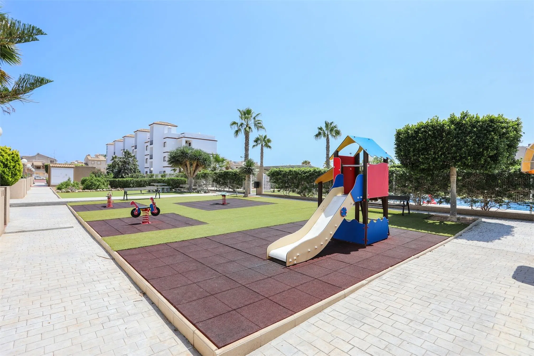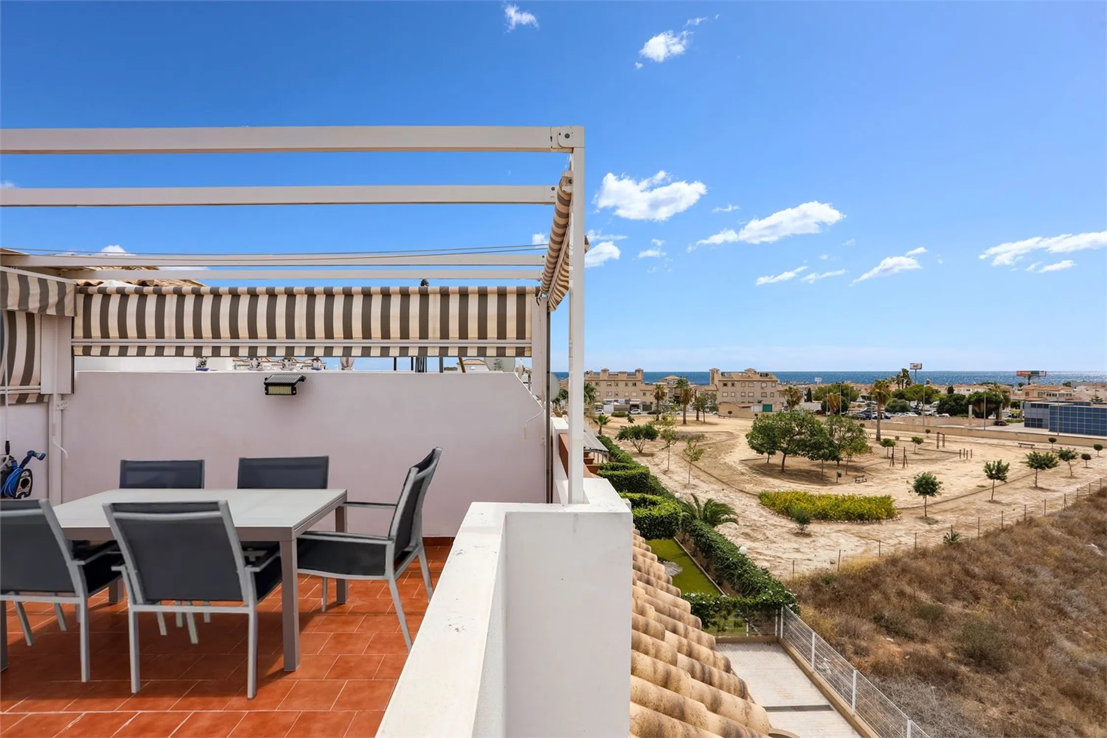 Ático encantador con vistas al mar ¡Bienvenidos a Punta Prima y a una zona residencial llena de vegetación con piscina comunitaria, plaza de garaje y a poca distancia a pie de restaurantes y tiendas! El apartamento está bien cuidado, con dos dormitorios que cuentan con armarios empotrados y ventiladores de techo, además de dos baños completamente alicatados, uno de ellos en suite. Un salón espacioso conecta con una cocina que da acceso a un encantador balcón con vistas despejadas. ¡Desde la escalera se accede a una fantástica azotea con pérgola y una vista impresionante de los alrededores y del mar!