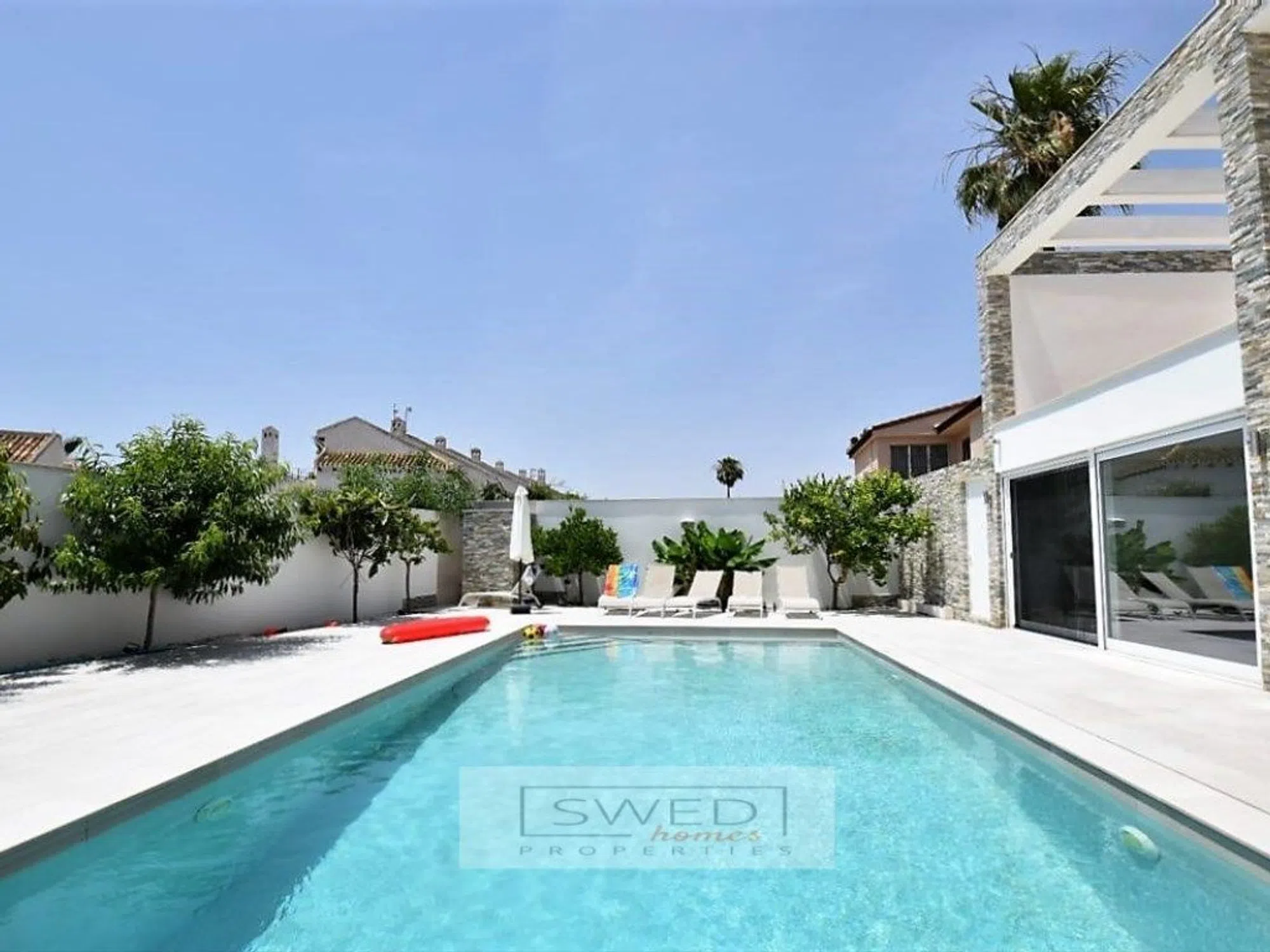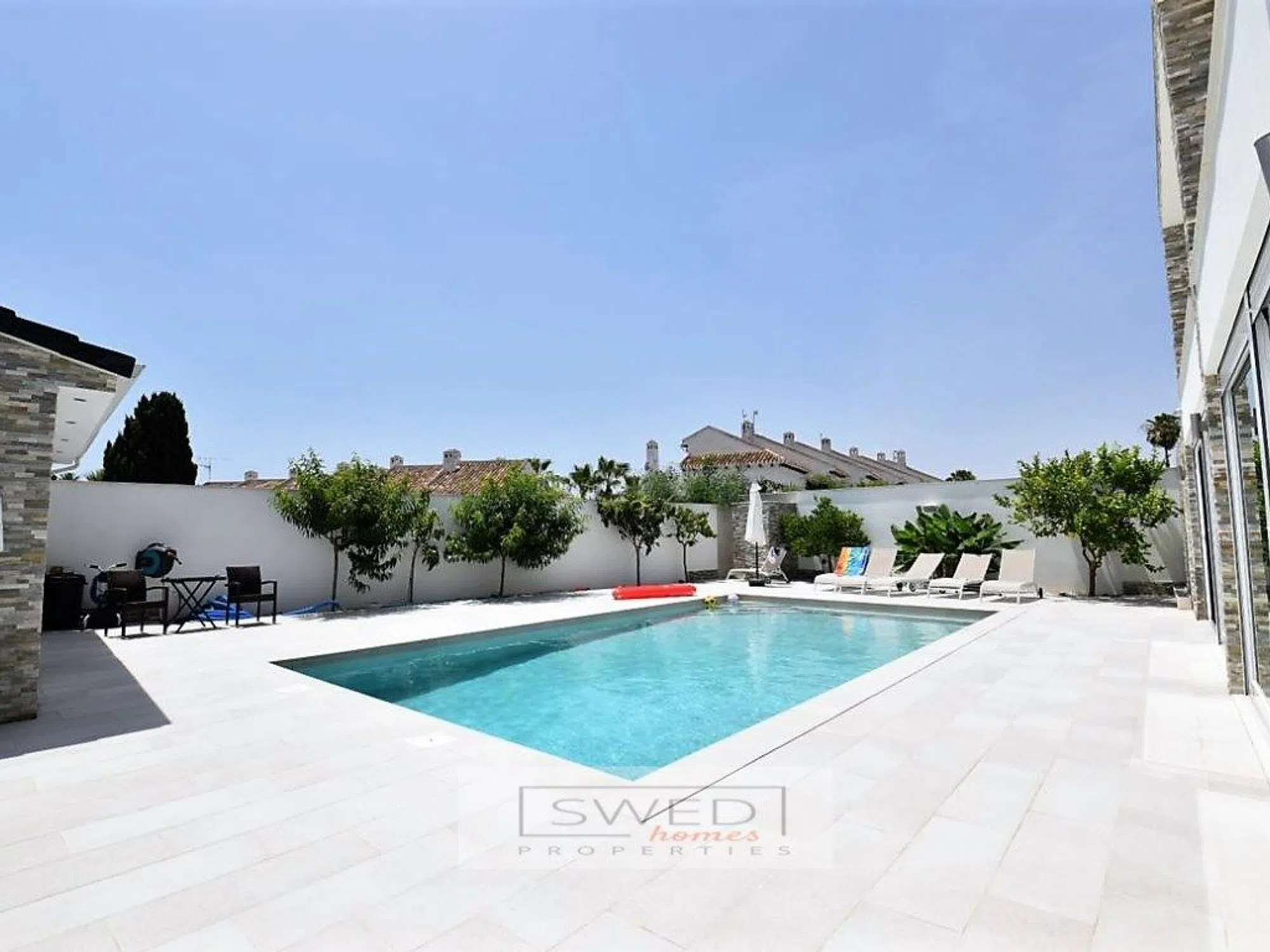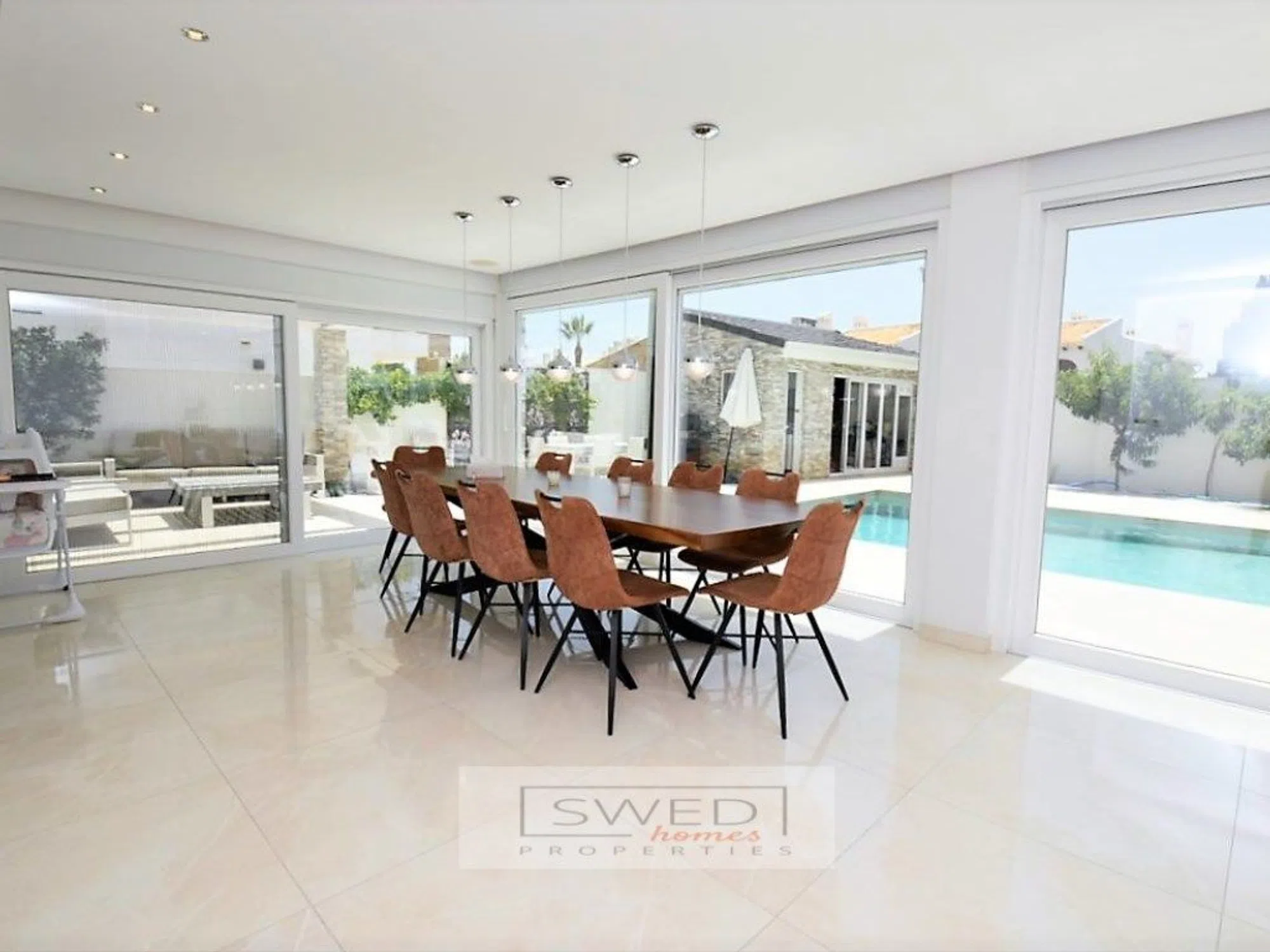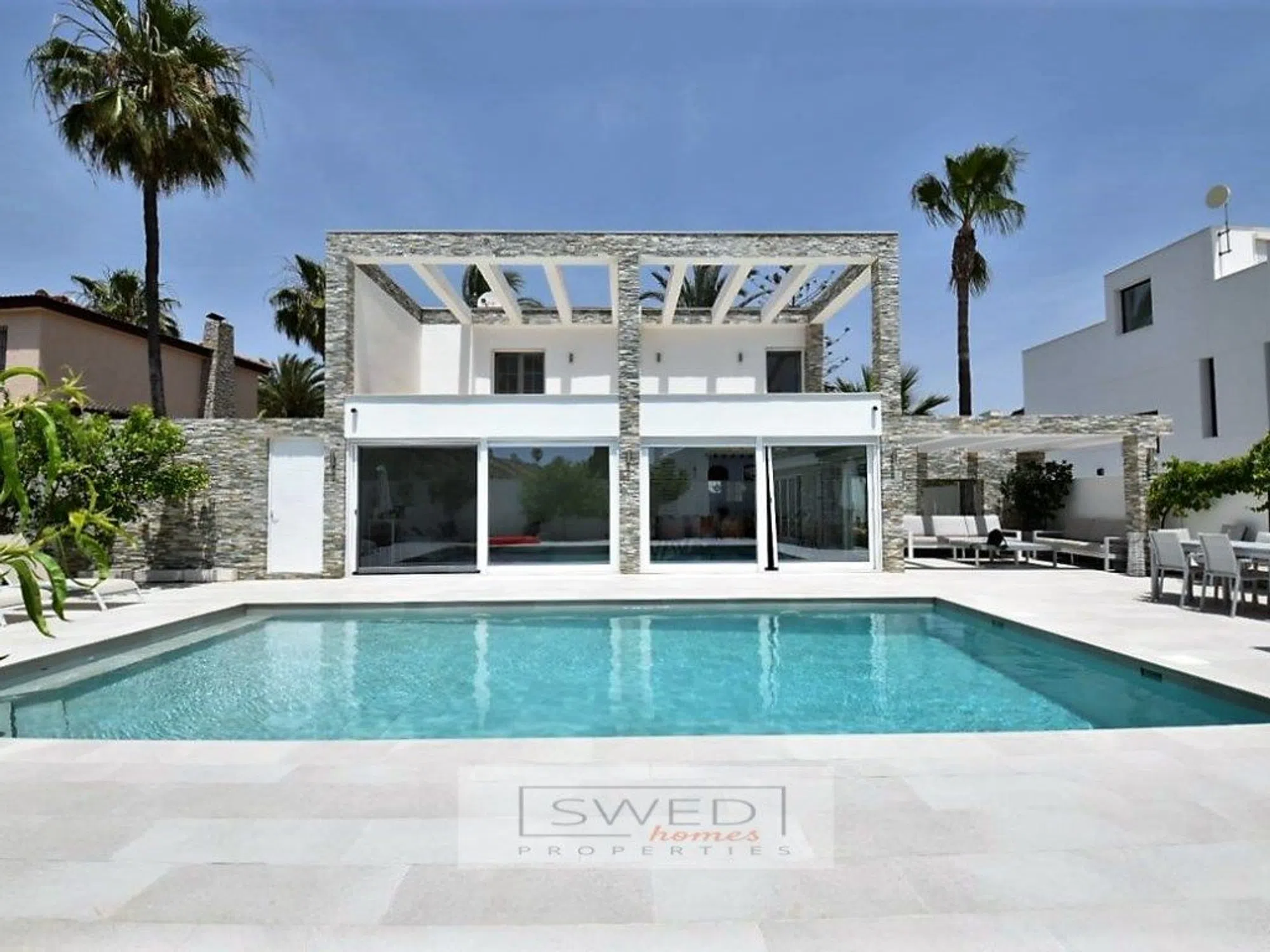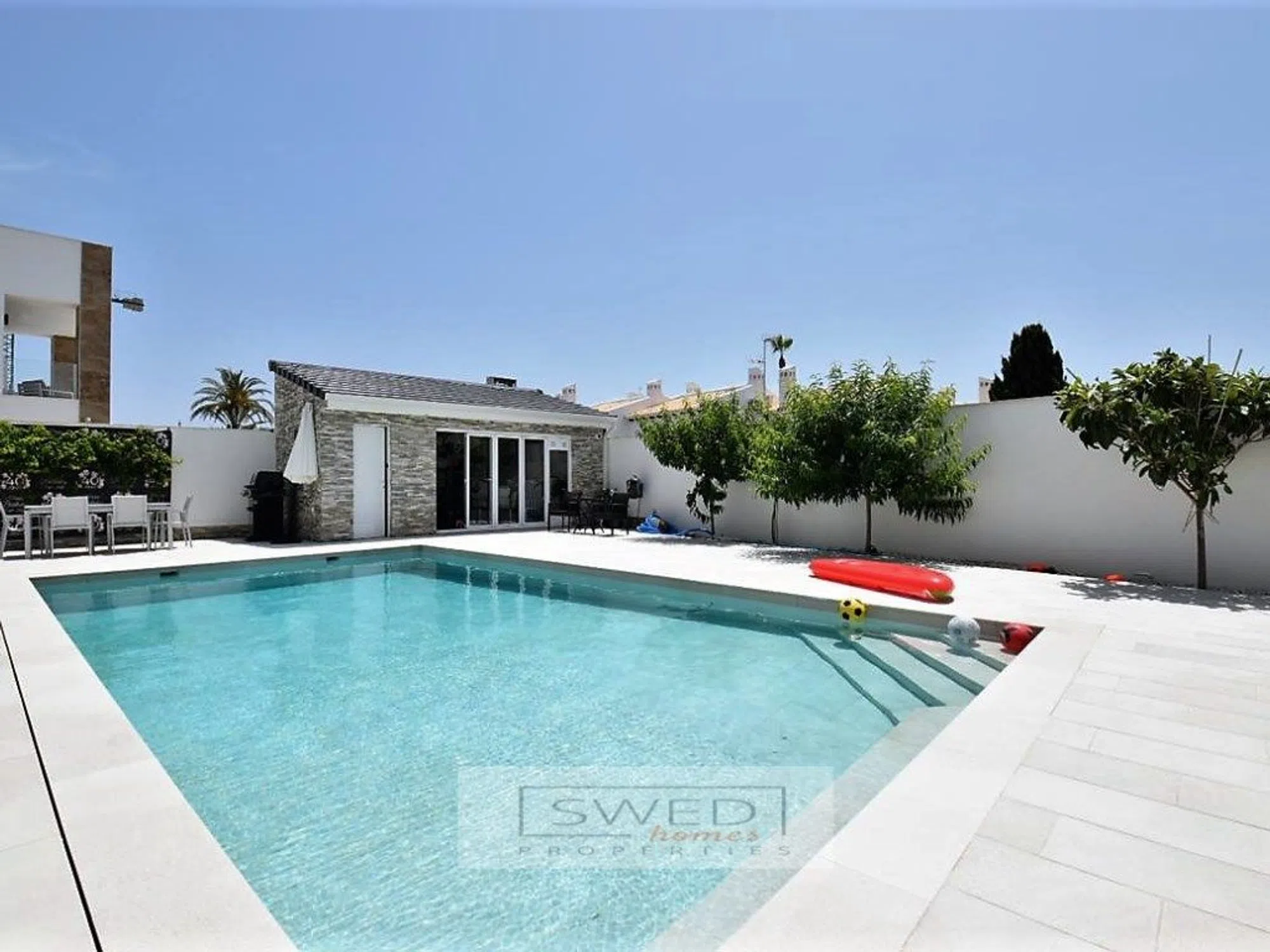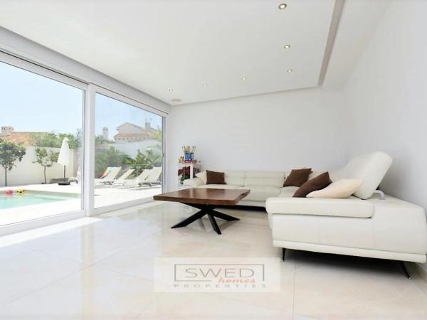 Precioso chalet totalmente reformado en estilo moderno con materiales de alta calidad, situado a 250m. de la Playa de La Zenia. Consta de 2 salones de gran tamaño separados por una gran cocina totalmente equipada con electrodomésticos de alta gama y con despensa. Uno de los salones tiene acceso directo a la piscina con zona de barbacoa y chill-out. Tiene 4 dormitorios amplios con grandes ventanales lo cual hace que sean muy luminosos, 2 baños completos y gran terraza con vistas despejadas en la planta superior. Persianas eléctricas, suelos de mármol, aire acondicionado y calefacción central. Se vende totalmente amueblado. Hermosa parcela de fácil mantenimiento que rodea la vivienda, en la que encontramos la mencionada zona de piscina con servicio, ducha y un recinto acristalado para almacenaje o para cenador, barbacoa, chill-out y garaje. ref: SJJ02.
